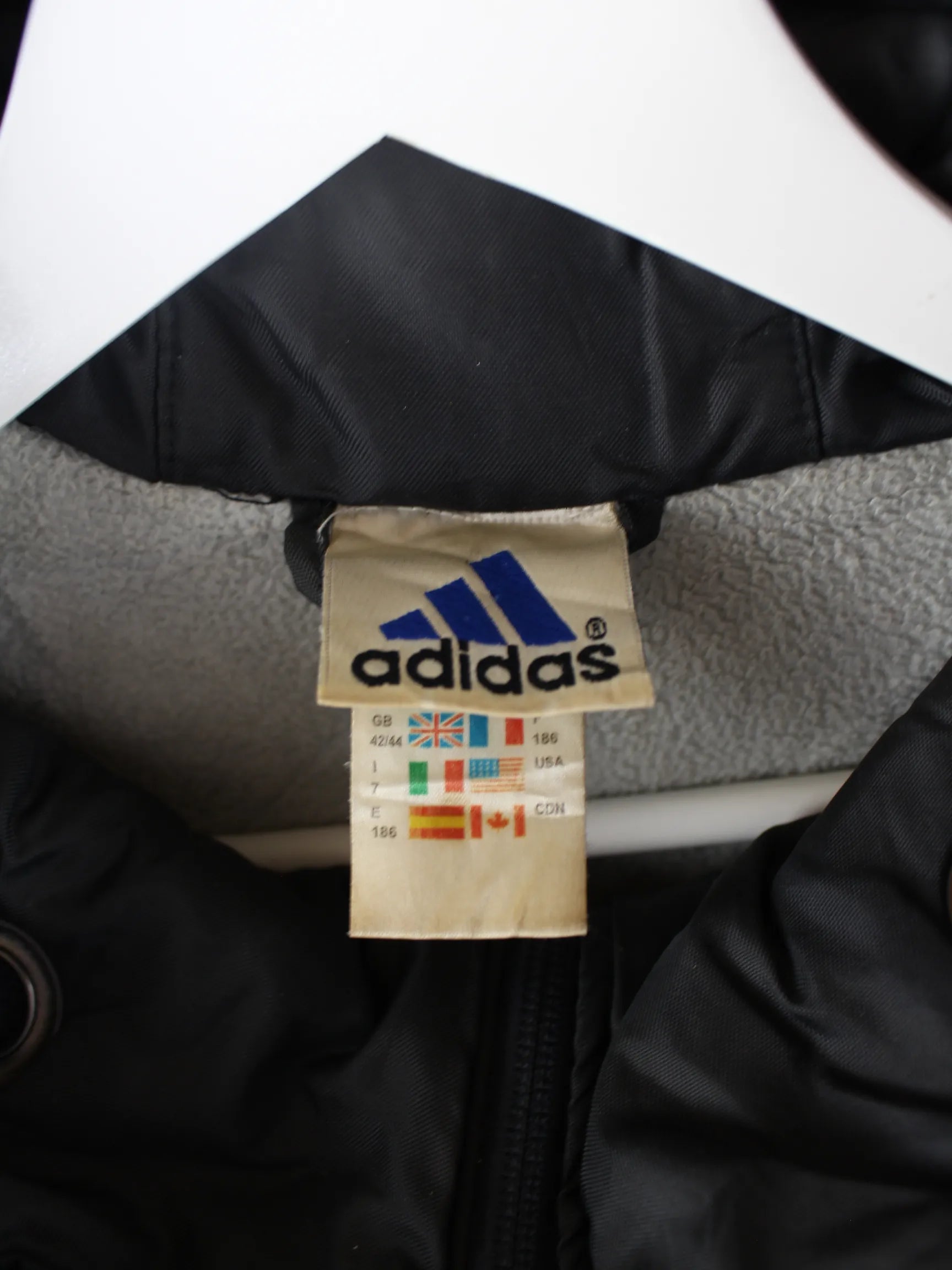 Schwarze Jacke vom Label Adidas aus den 90'ern in Größe XXL. Sie ist aus Synthetik gefertigt und in sehr gutem Zustand bei uns zu bekommen.