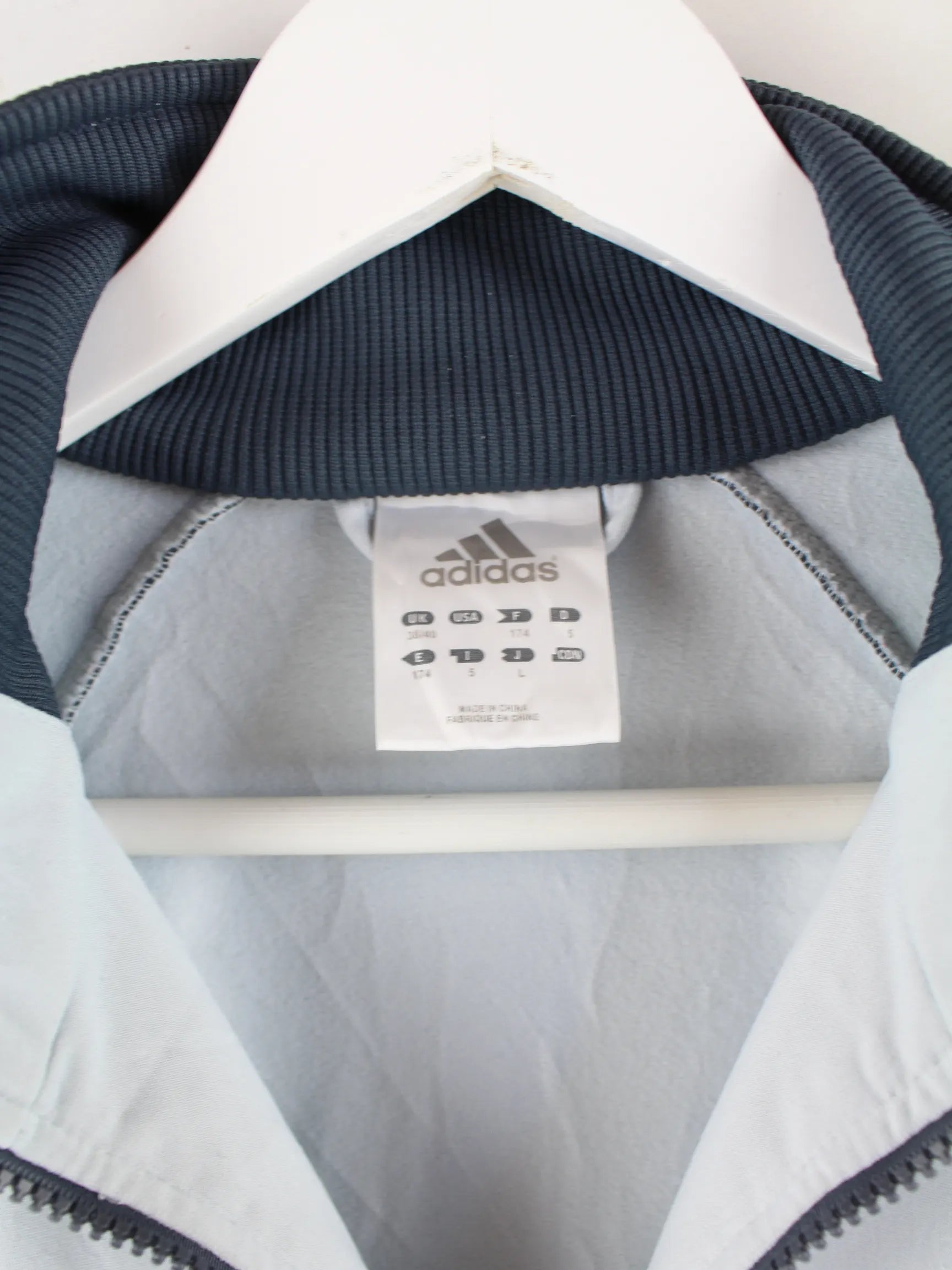 Trainingsjacke der Marke Adidas in Größe L. Sie ist aus Synthetik gefertigt und in Grau im Bestand.