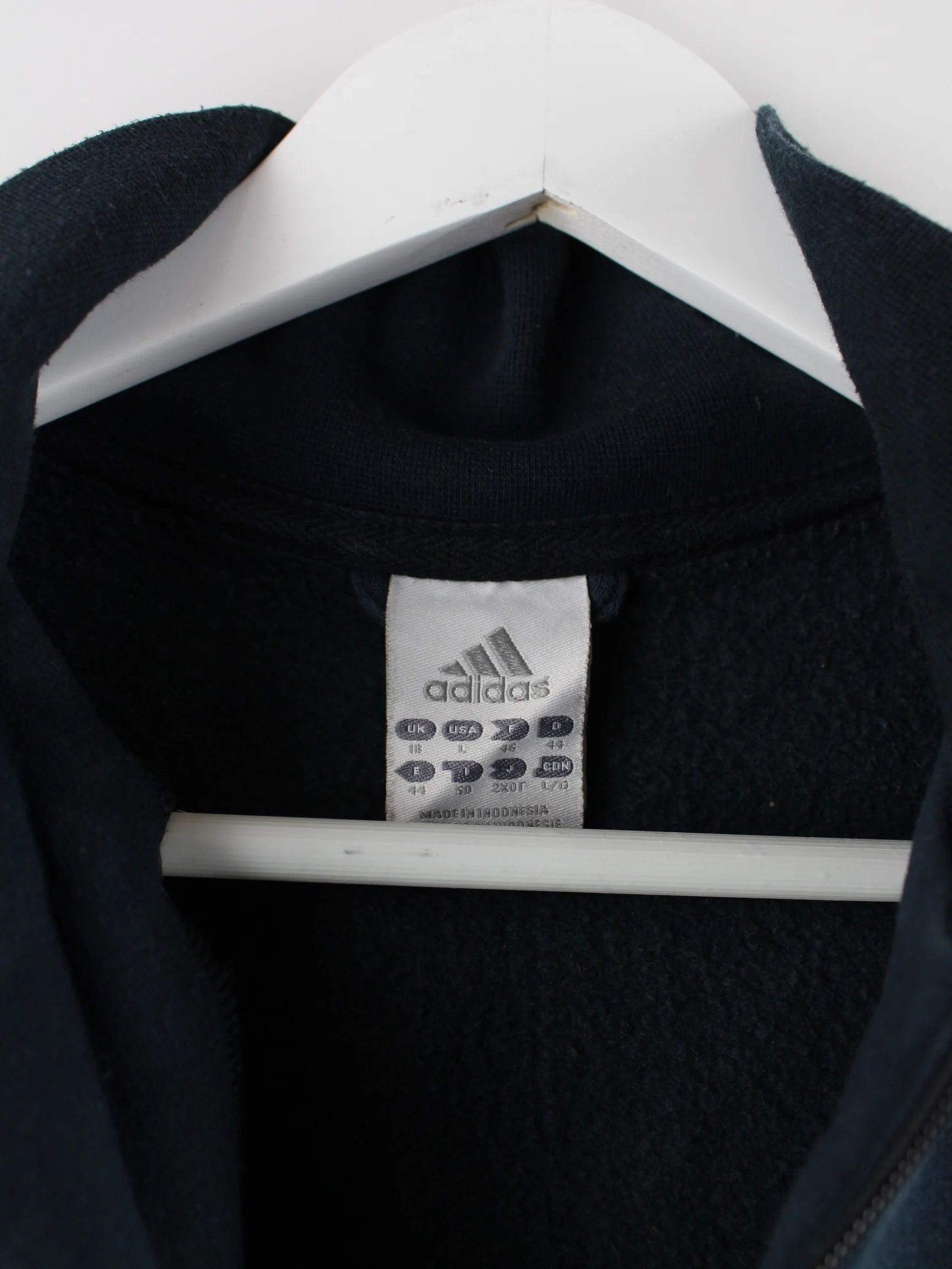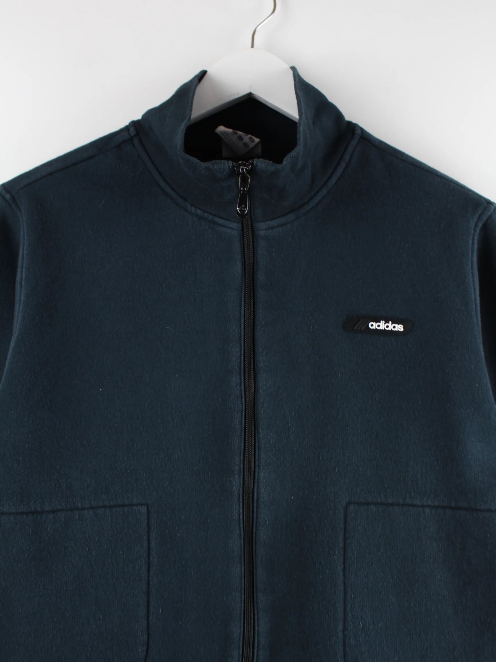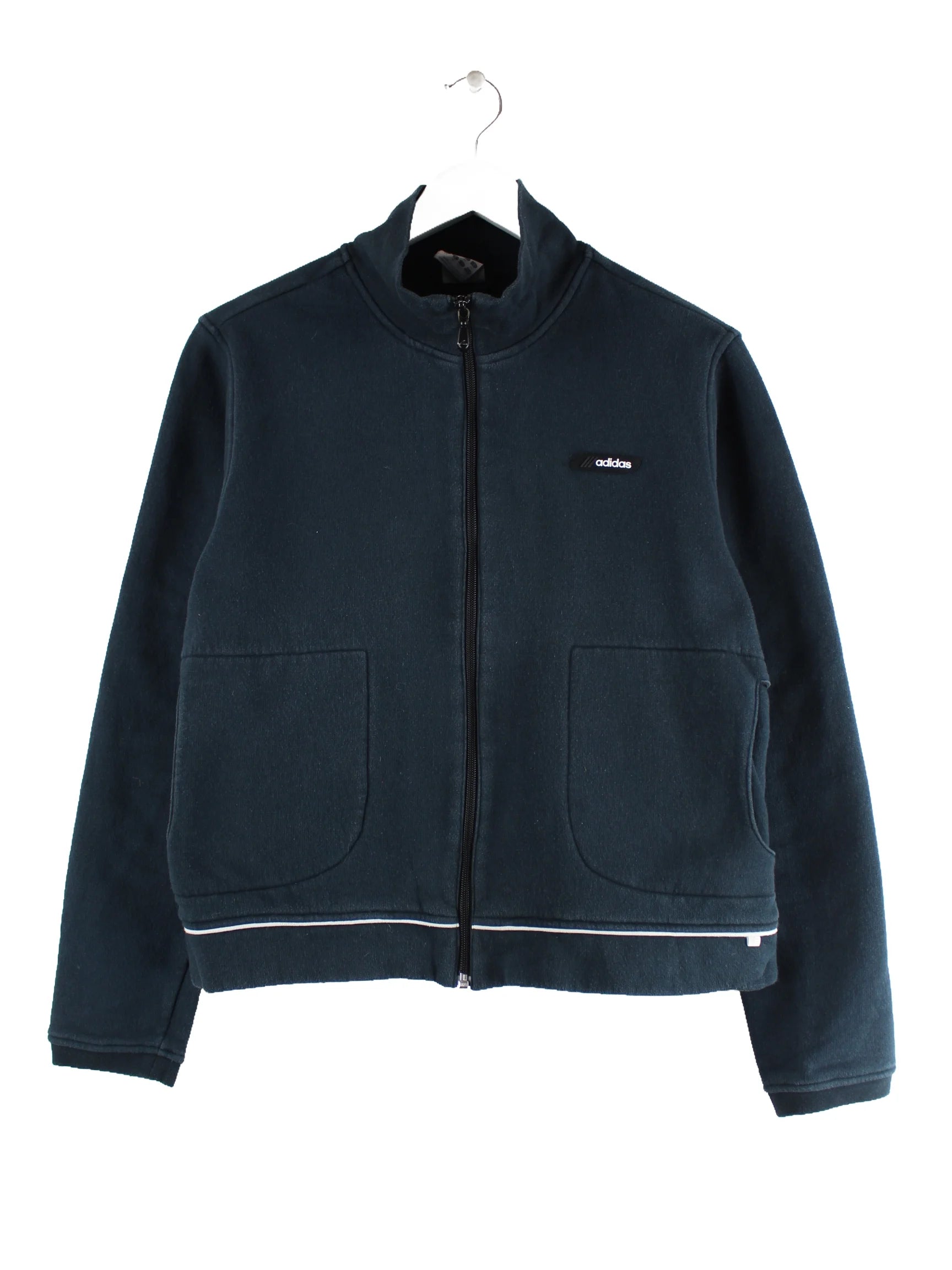 Blaue Sweatjacke des Labels Adidas in Größe S. Sie ist aus einer Baumwollmischung gemacht und in gutem Zustand zu haben.