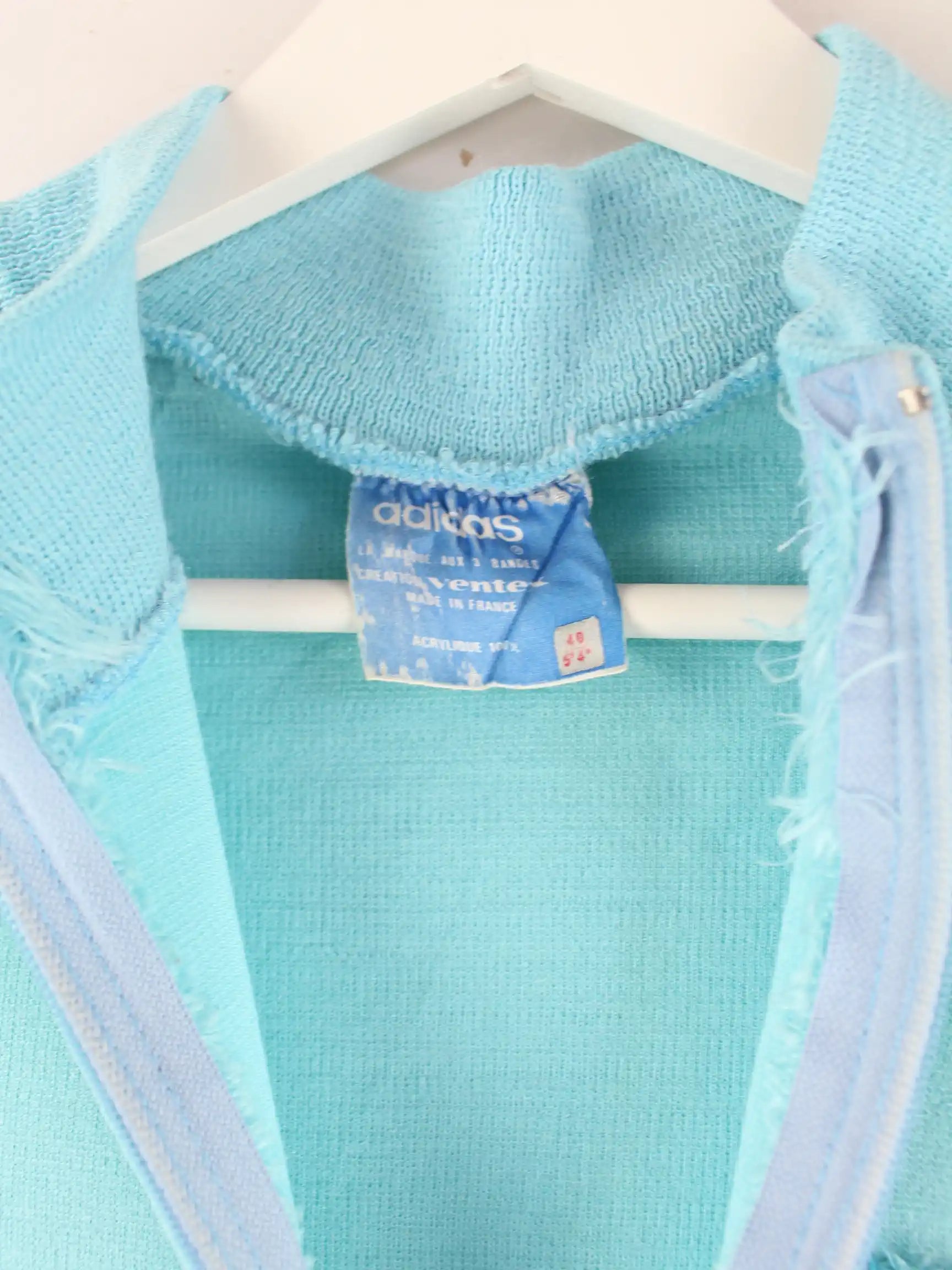 Türkisfarbene Sweatjacke des Labels Adidas aus den 80'ern in Größe S. Sie ist aus Acryl angefertigt und in gutem Zustand zu bekommen.