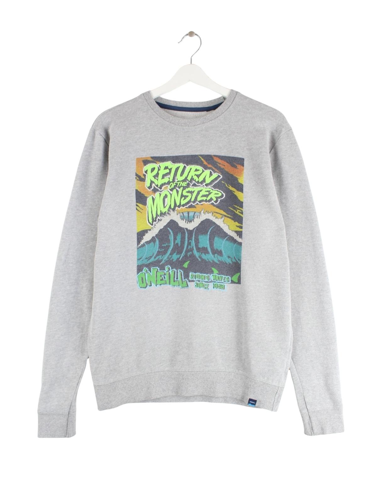 Grauer Sweater des Labels O'Neill in Größe S. Er ist aus einer Baumwollmischung gefertigt und in sehr gutem Zustand auf Lager. Mit schönem Surf Print.