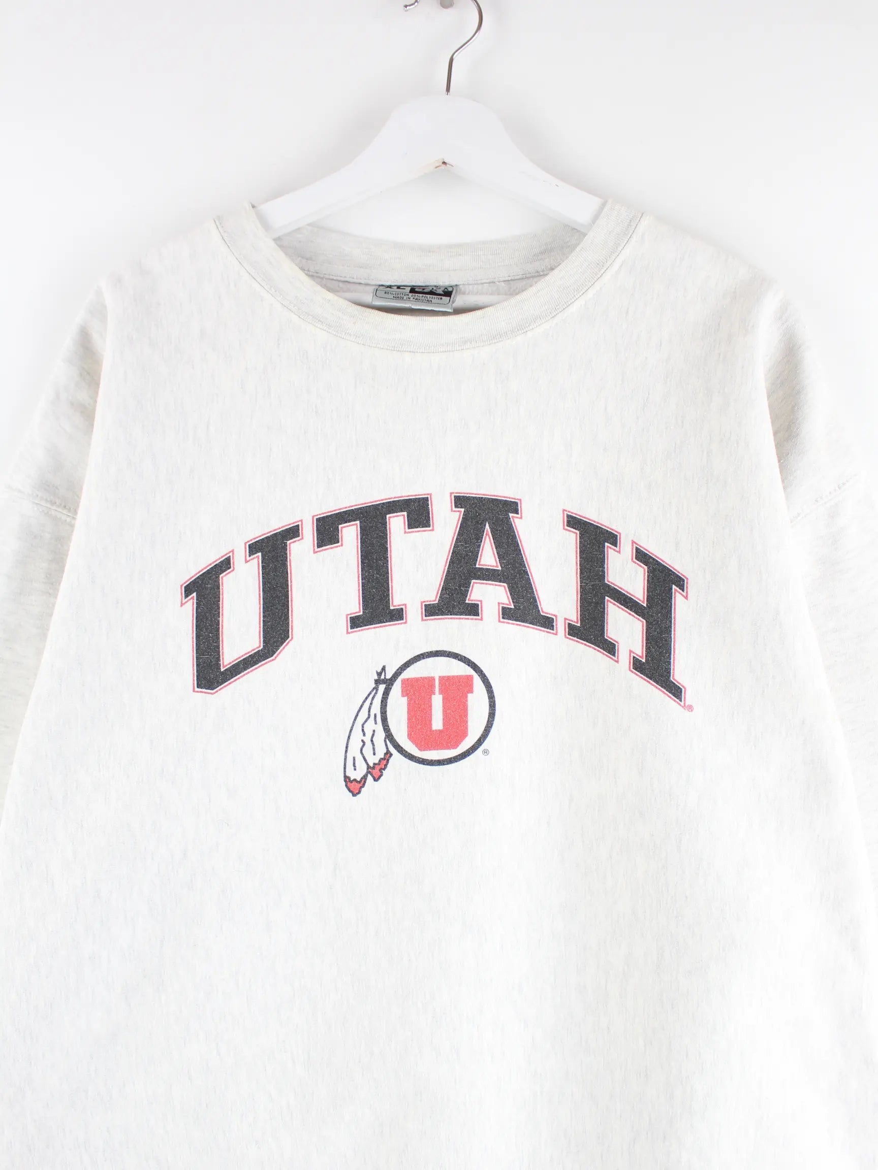 Vintage Sweater in Größe XL. Er ist aus einer Baumwollmischung hergestellt und in Grau lieferbar. Mit tollem Utah Print.