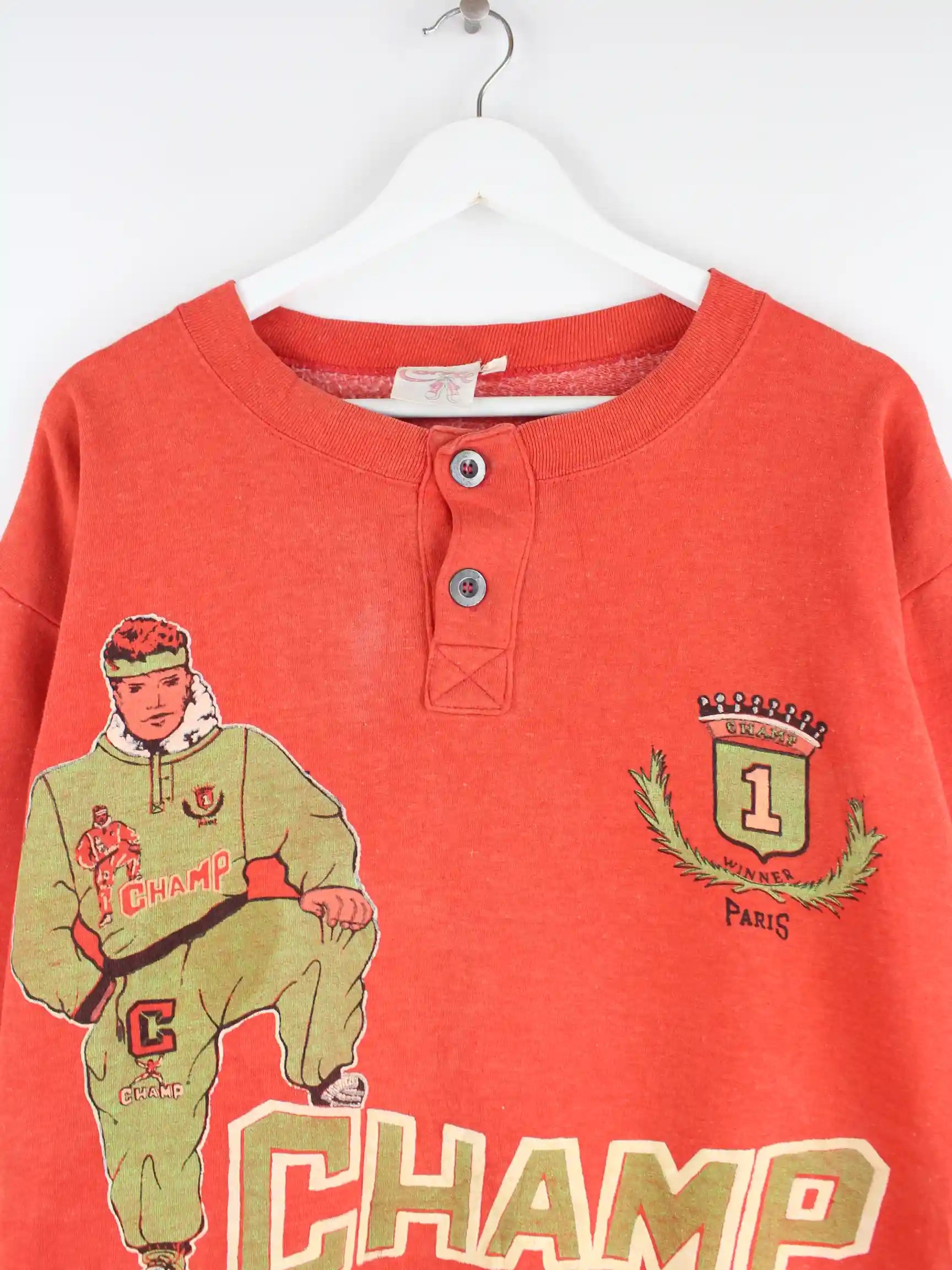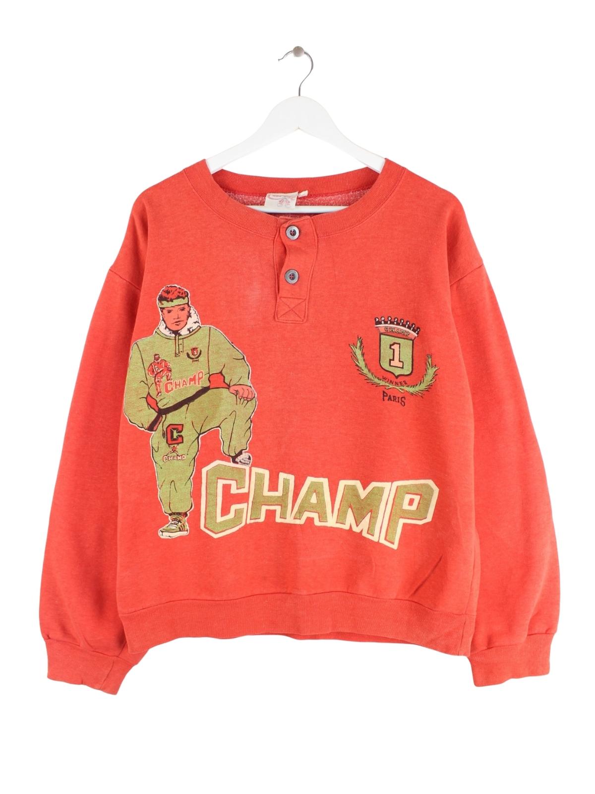 Vintage Sweater in Größe M aus den 80'ern. Er ist aus einer Baumwollmischung angefertigt und in Rot auf Lager. Mit chiquem Champ Print.