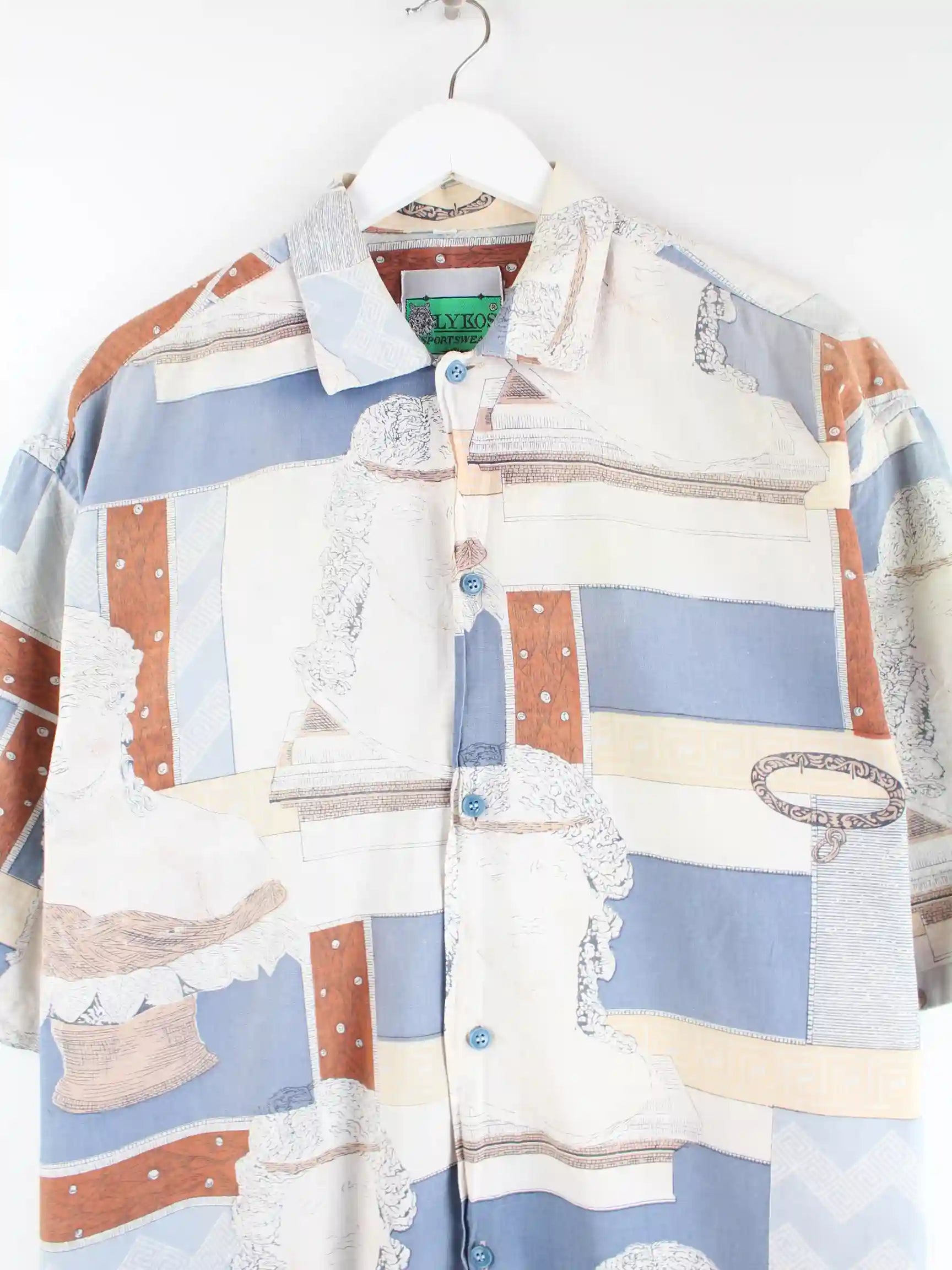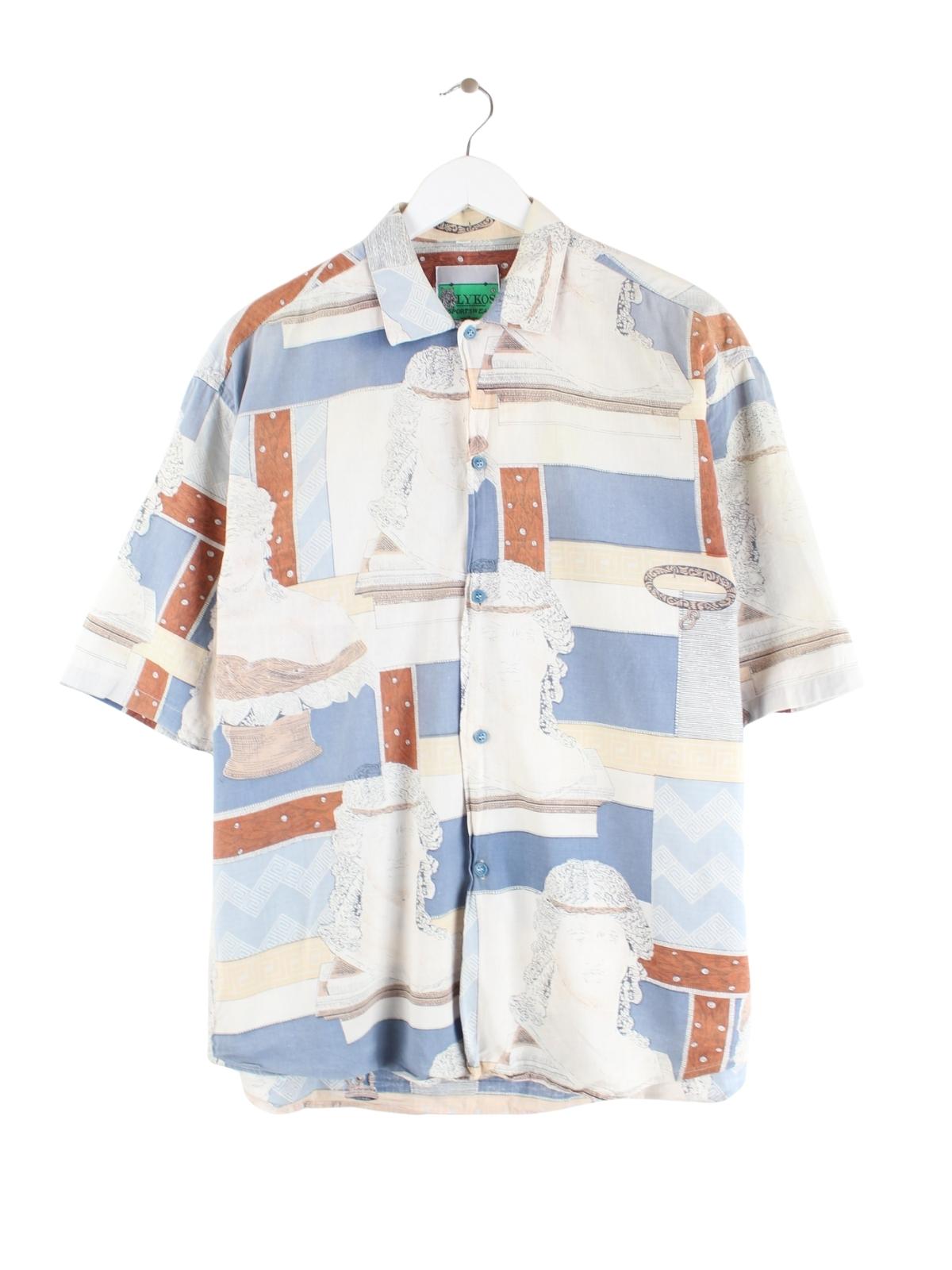 Vintage Crazy Pattern Kurzarm-Hemd in Größe L aus den 80'ern. Es ist aus Baumwolle und in bunten Farben im Bestand.