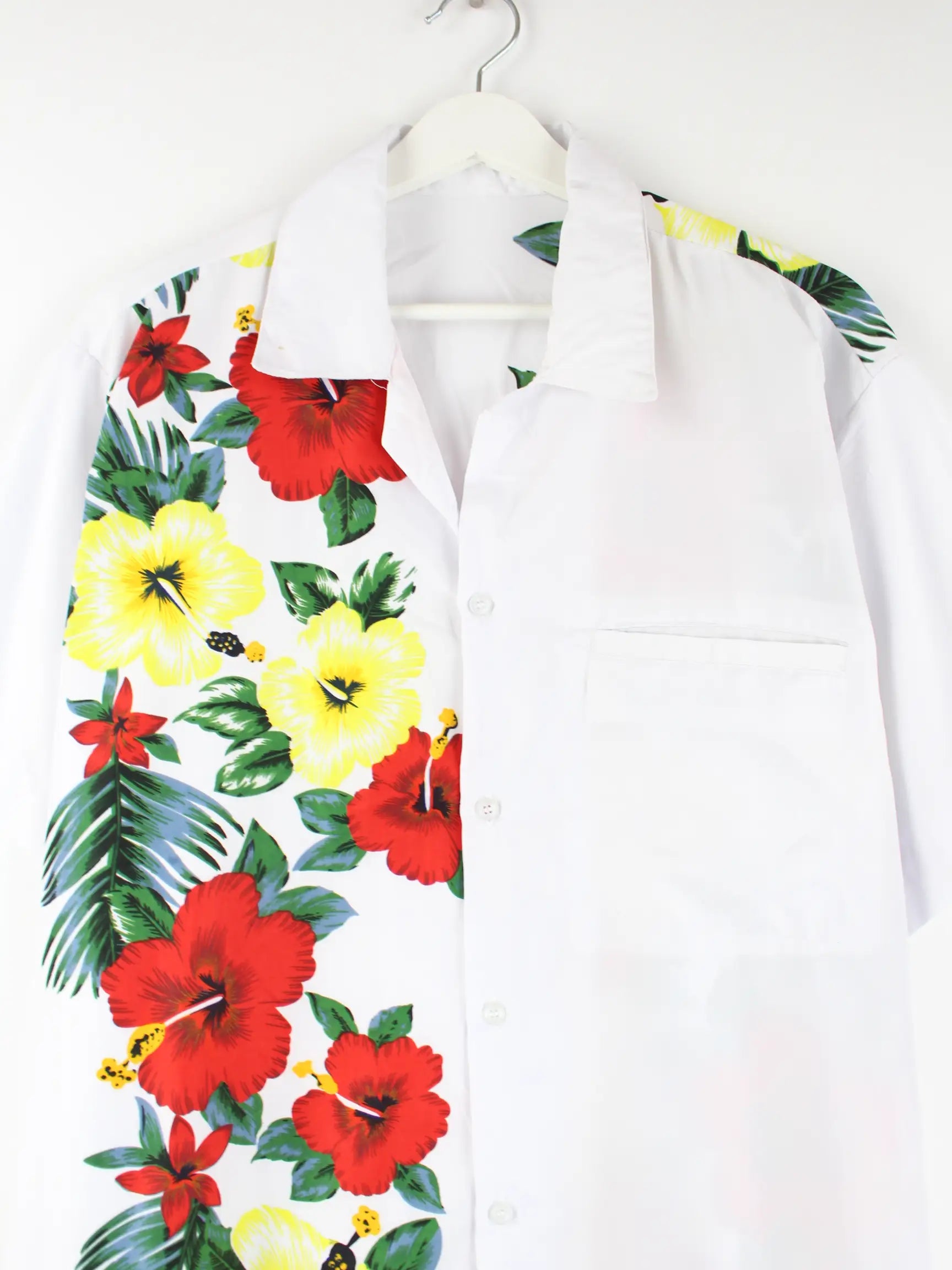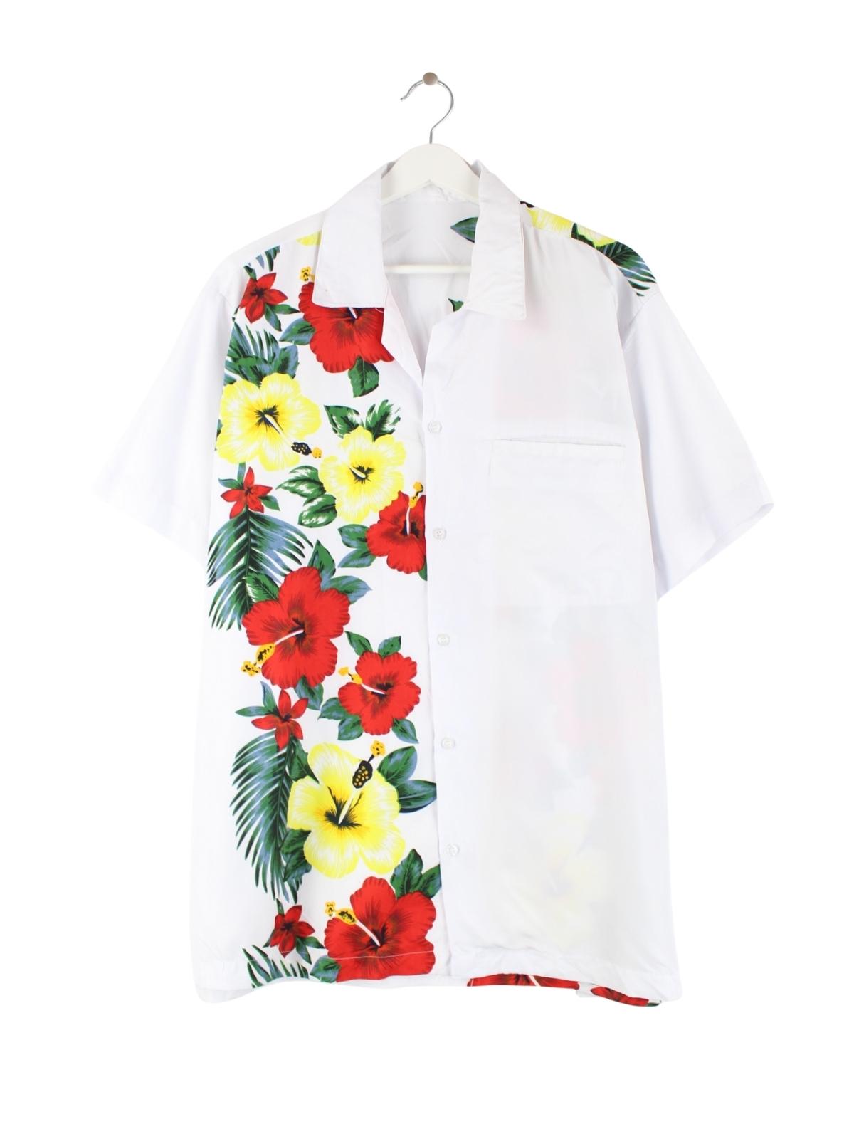 Weißes Vintage Hawaii Hemd aus den 90'ern in Größe XL. Es ist aus Synthetik hergestellt und in gutem Zustand vorrätig.