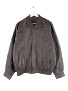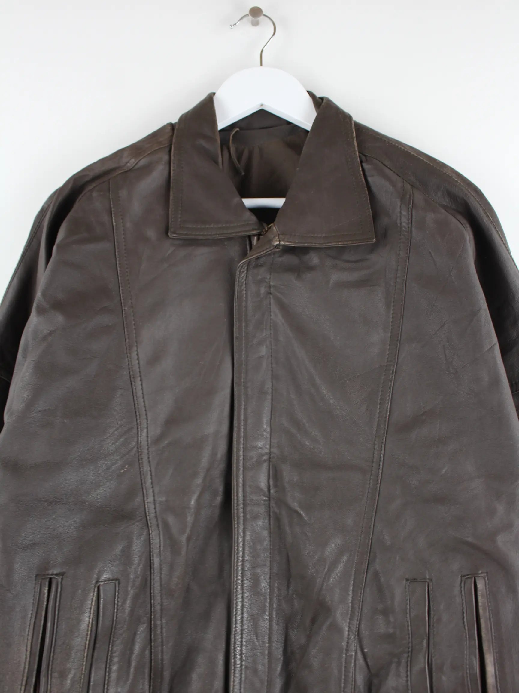 Vintage Jacke in Größe L aus den 90'ern. Sie ist aus Leder angefertigt und in Braun lieferbar.