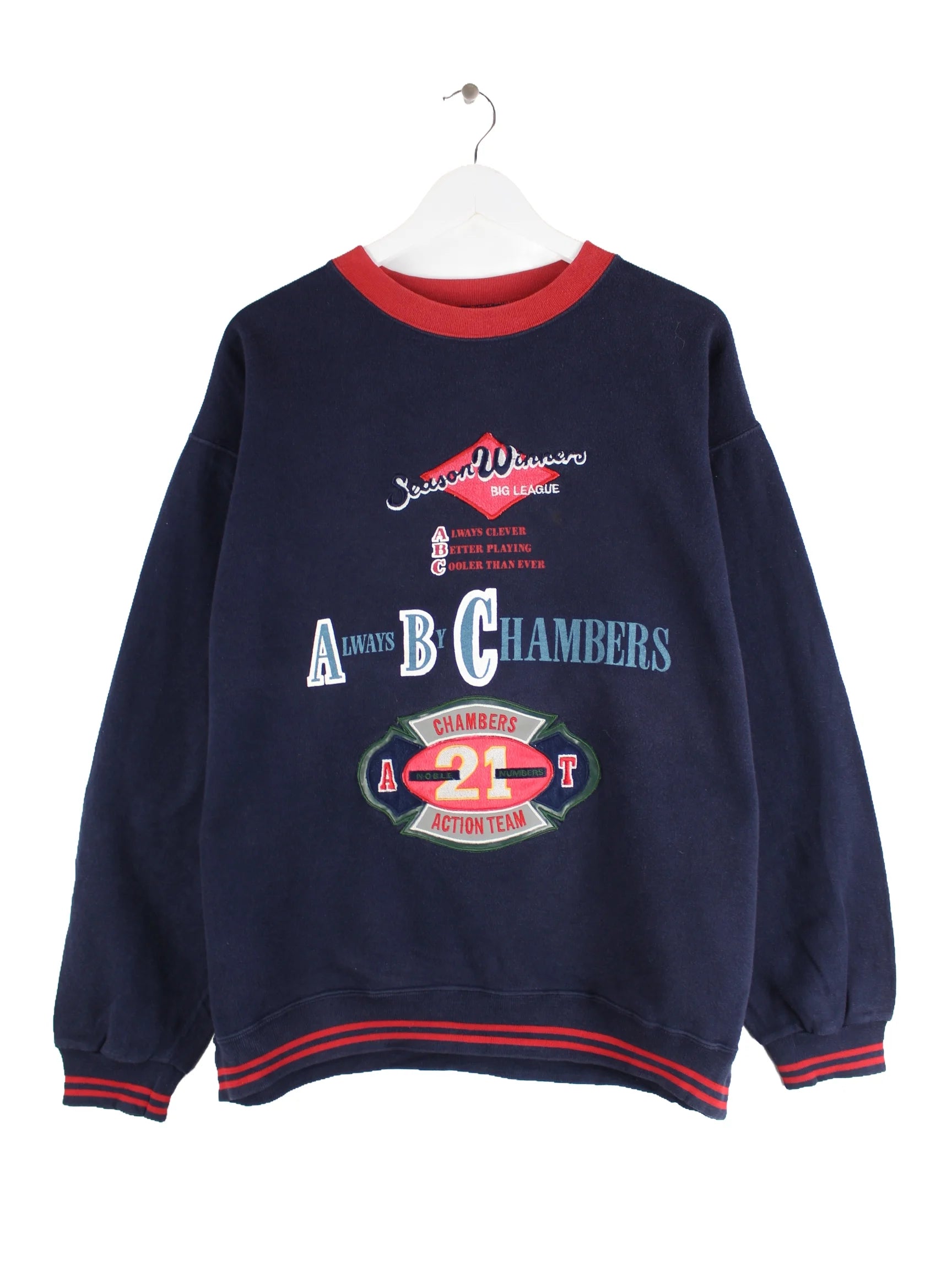 Blauer Vintage Sweater aus den 90'ern in Größe L. Er ist aus einer Baumwollmischung und in sehr gutem Zustand bei uns zu bekommen. Mit seltenem 90s Print.