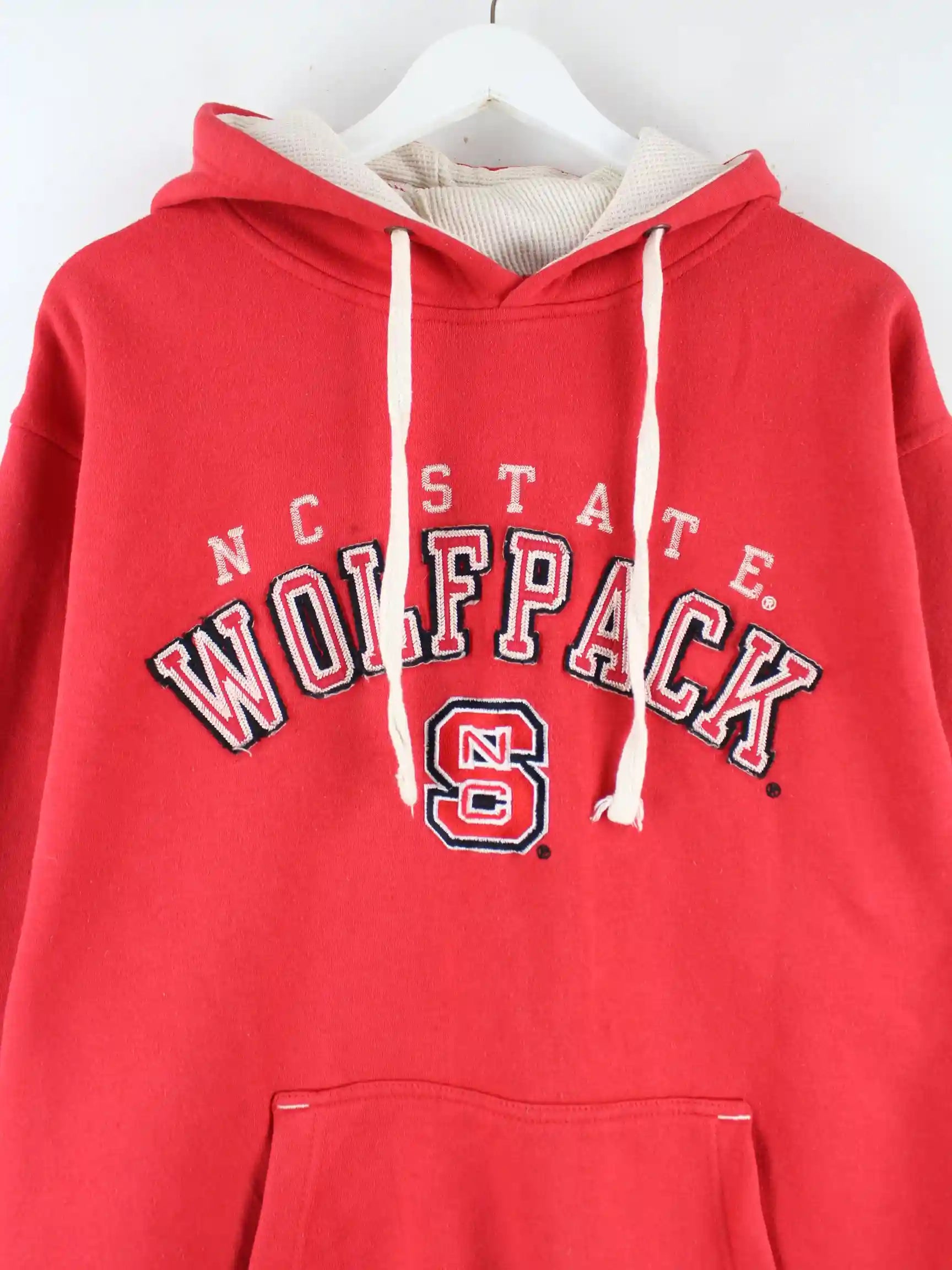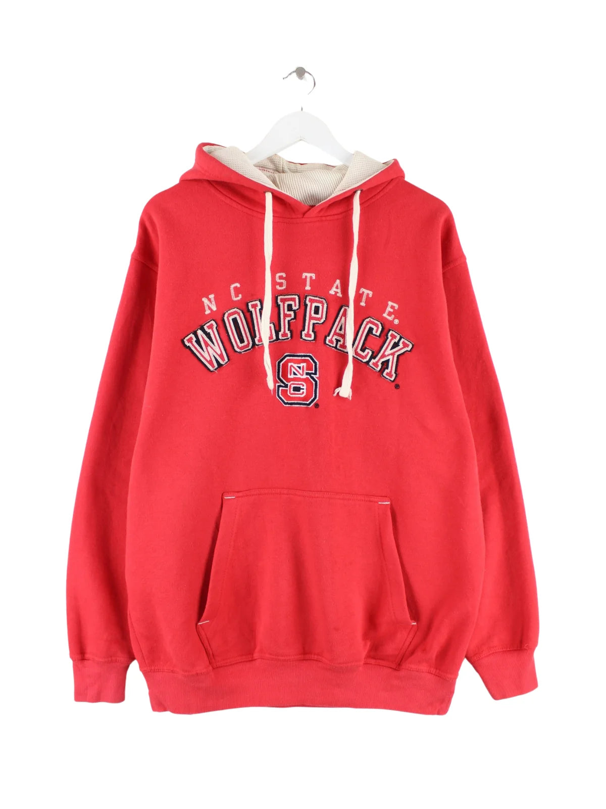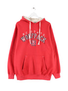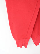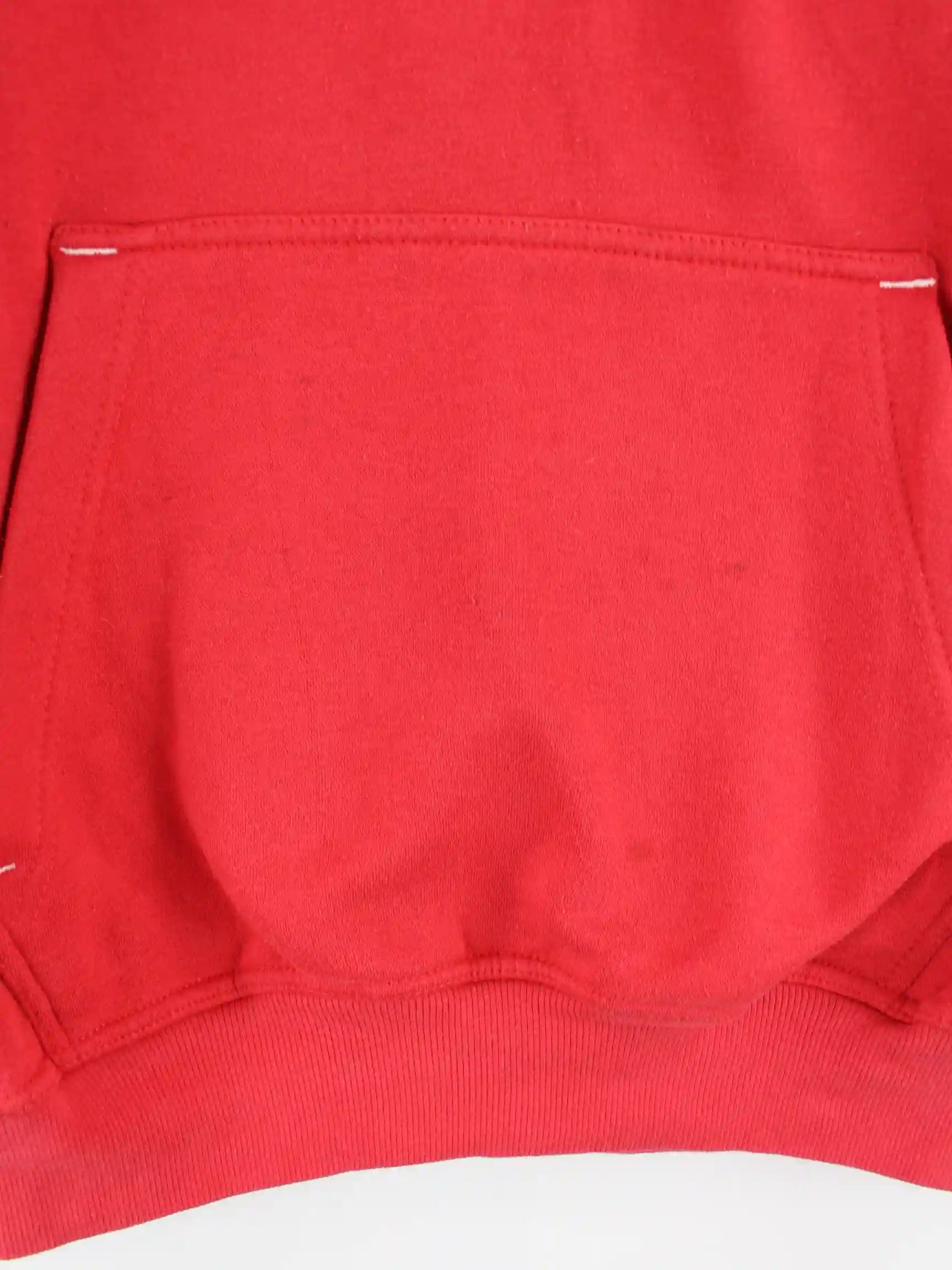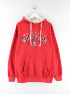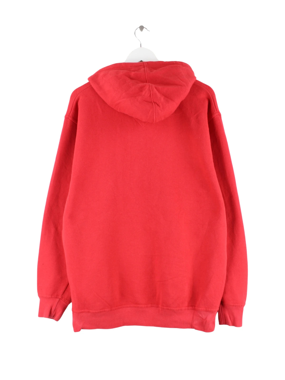Roter Vintage Hoodie mit gestickten Motiven in Größe M. Er ist aus einer Baumwollmischung gemacht. Den Zustand würden wir als 'In Ordnung' bezeichnen (vergl. Bilder).