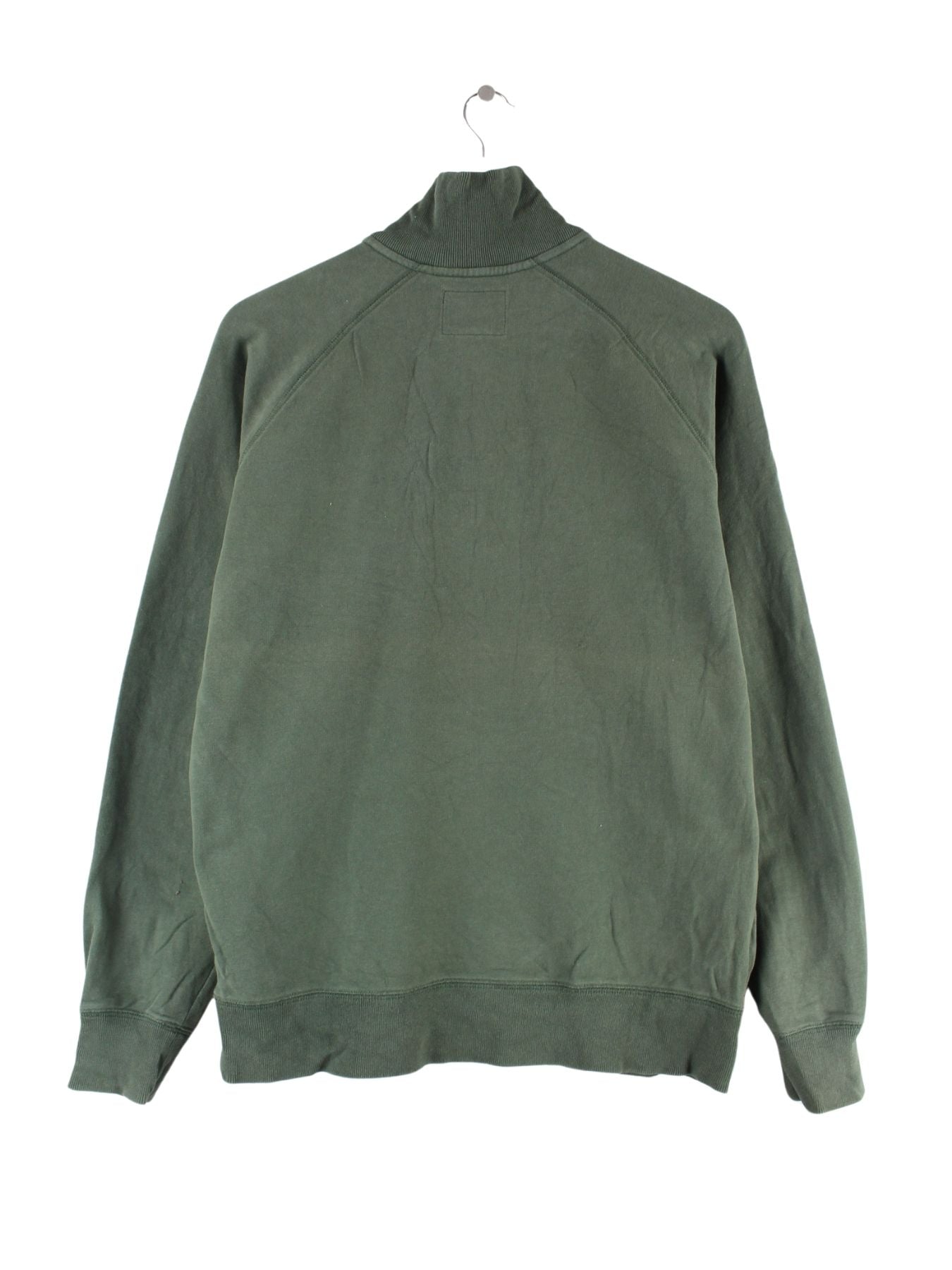 Vintage Sweater mit gesticktem Logo und half Zip in Größe M. Er ist aus einer Baumwollmischung und in Grün zu haben.