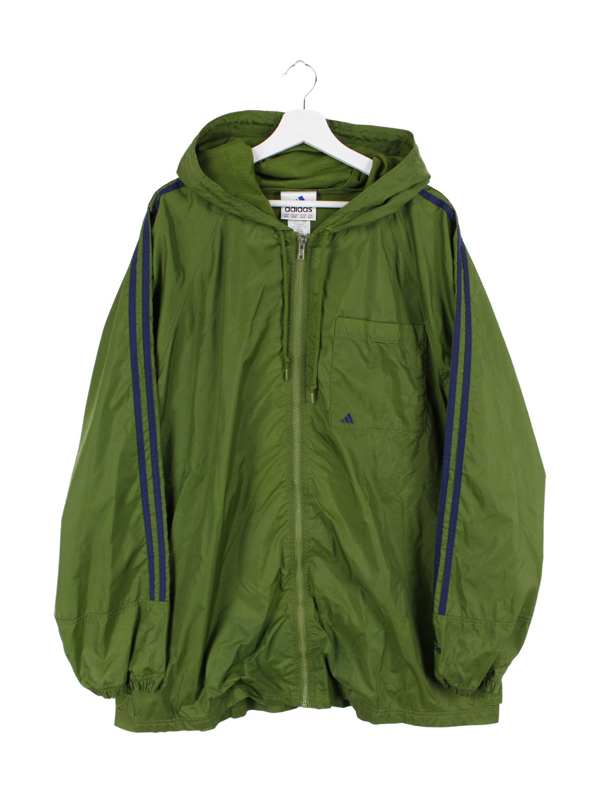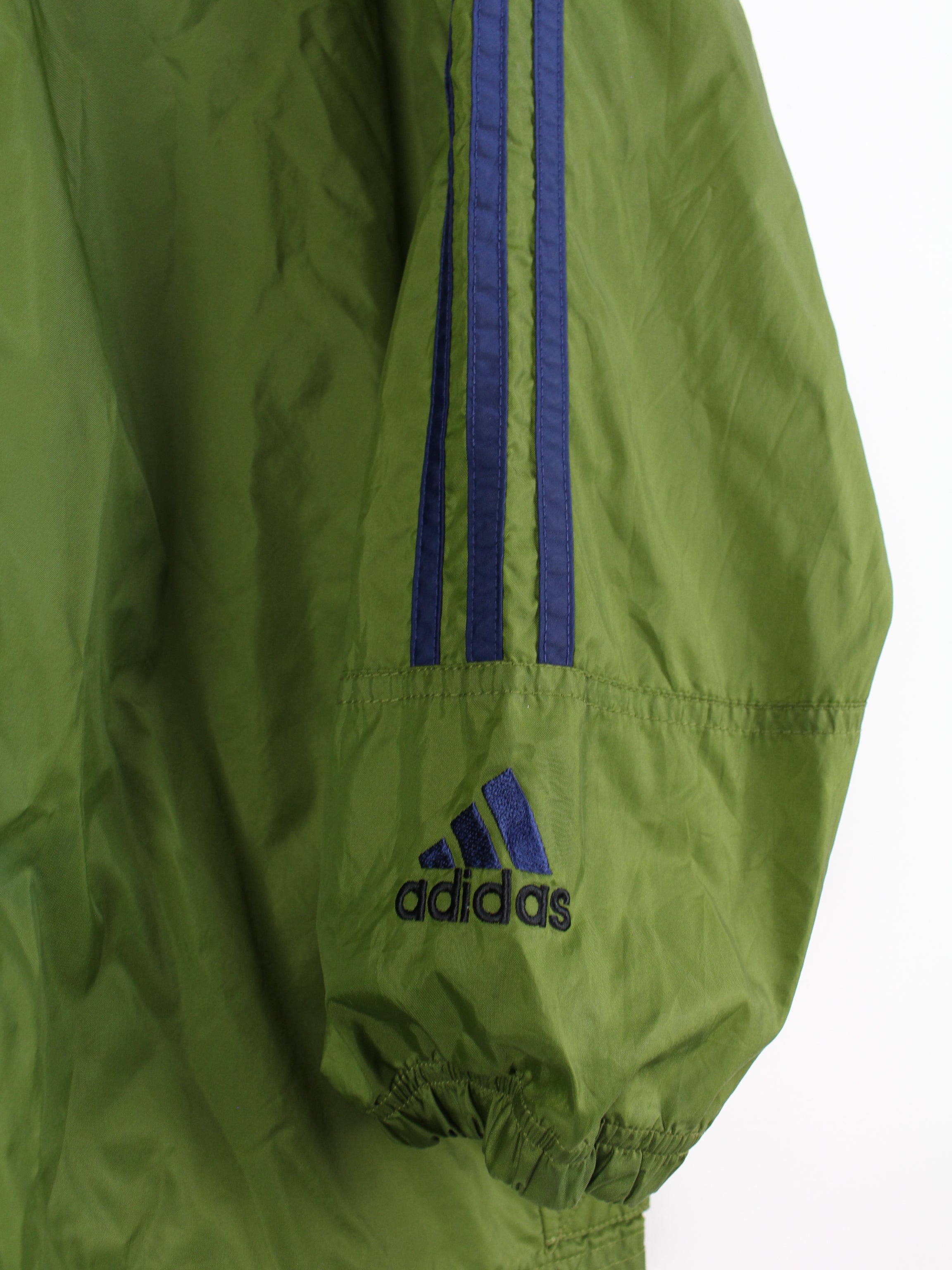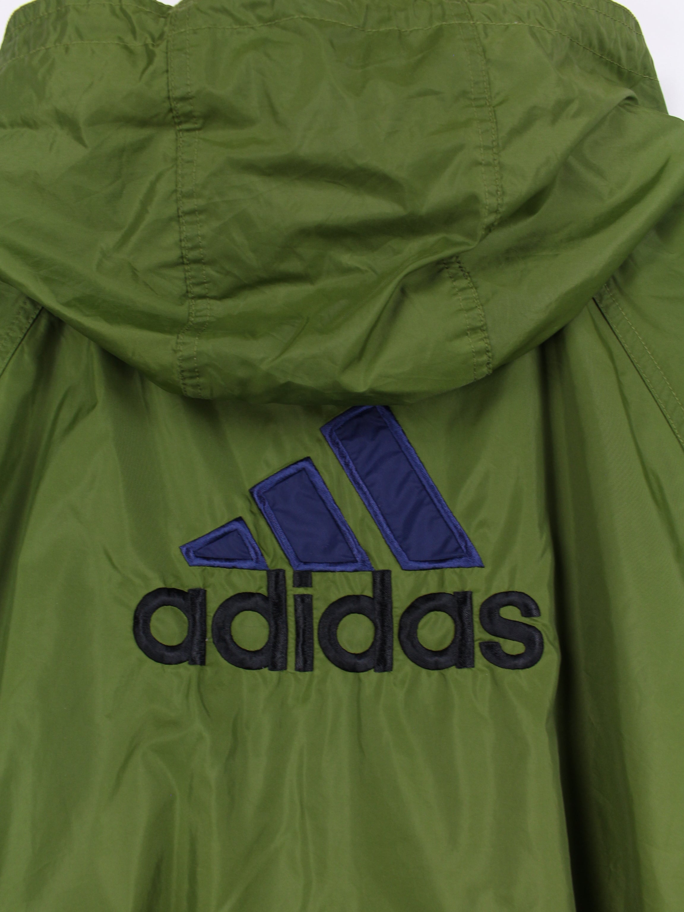 Grüne Adidas Jacke mit großem Logo-Stick auf dem Rücken.