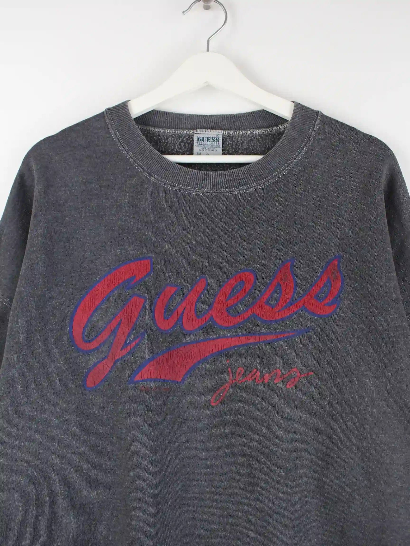 Grauer Sweater der Brand Guess aus den 80'ern in Größe XL. Er ist aus einer Baumwollmischung angefertigt und in sehr gutem Zustand im Angebot. Mit seltenem Vintage Print.