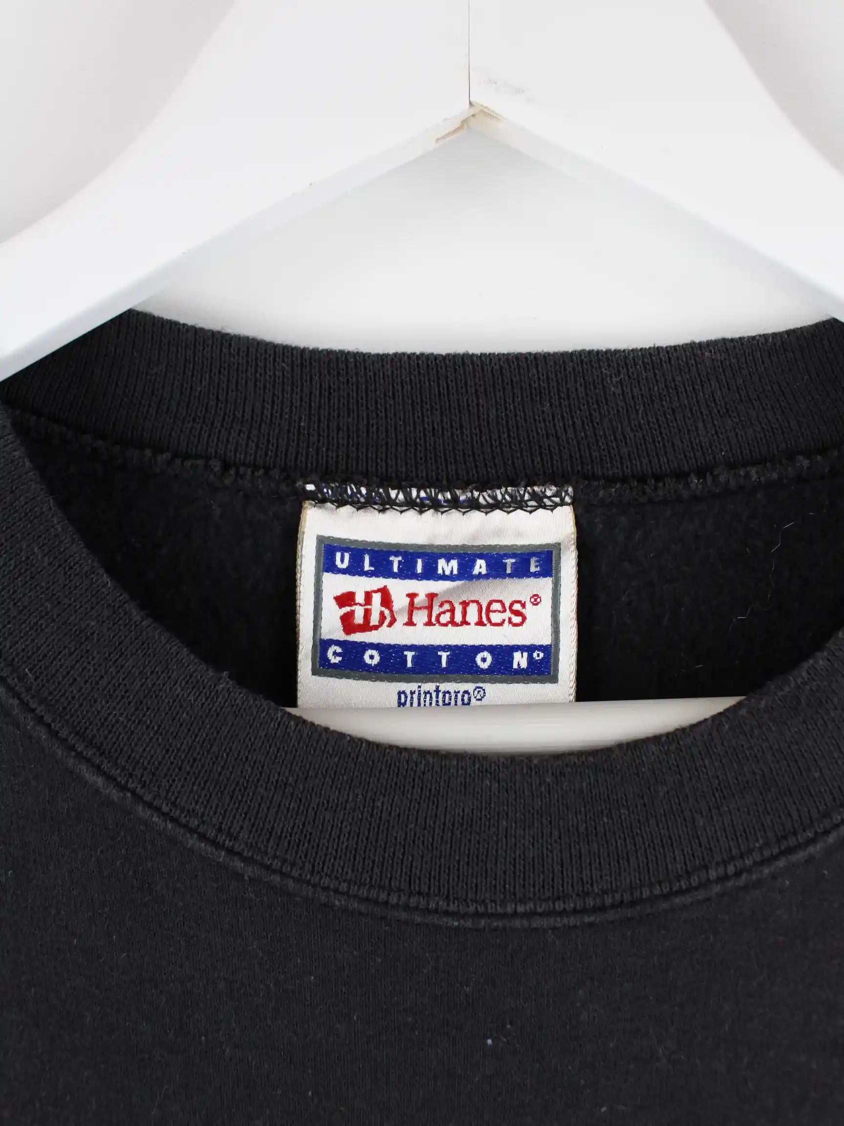 Schwarzer Sweater vom Brand Hanes aus den 90'ern in Größe XL. Er ist aus einer Baumwollmischung und in gutem Zustand bei uns zu bekommen.