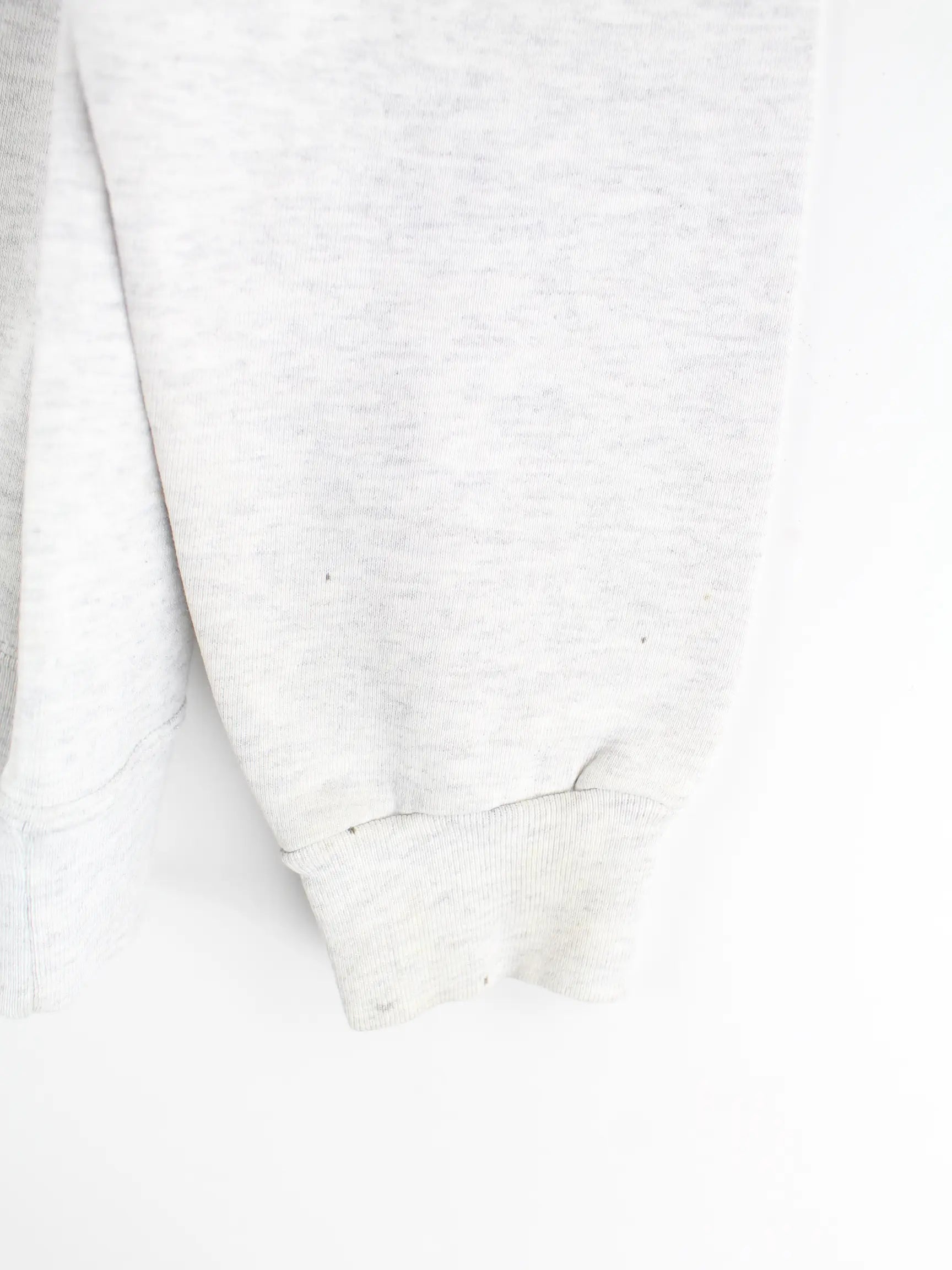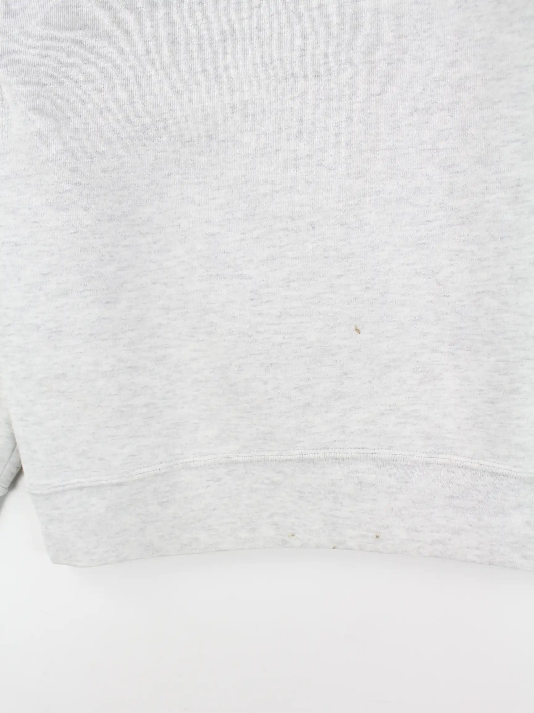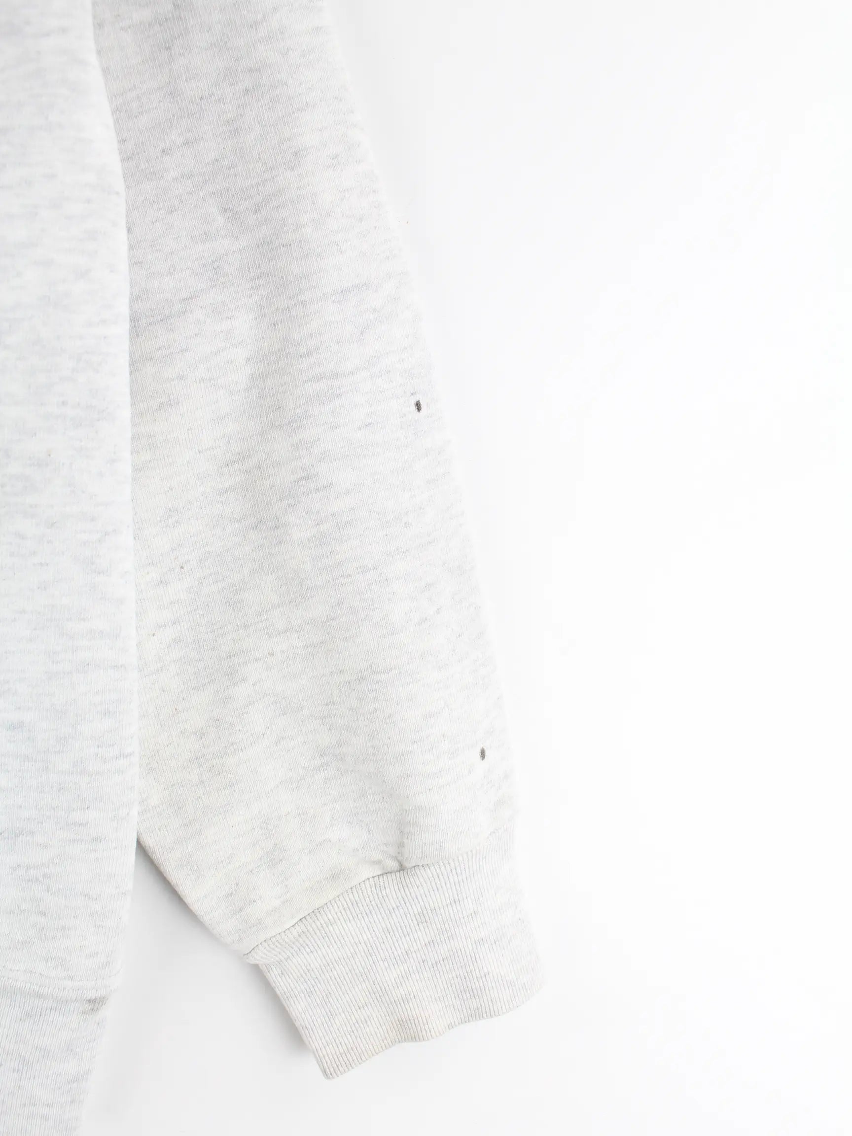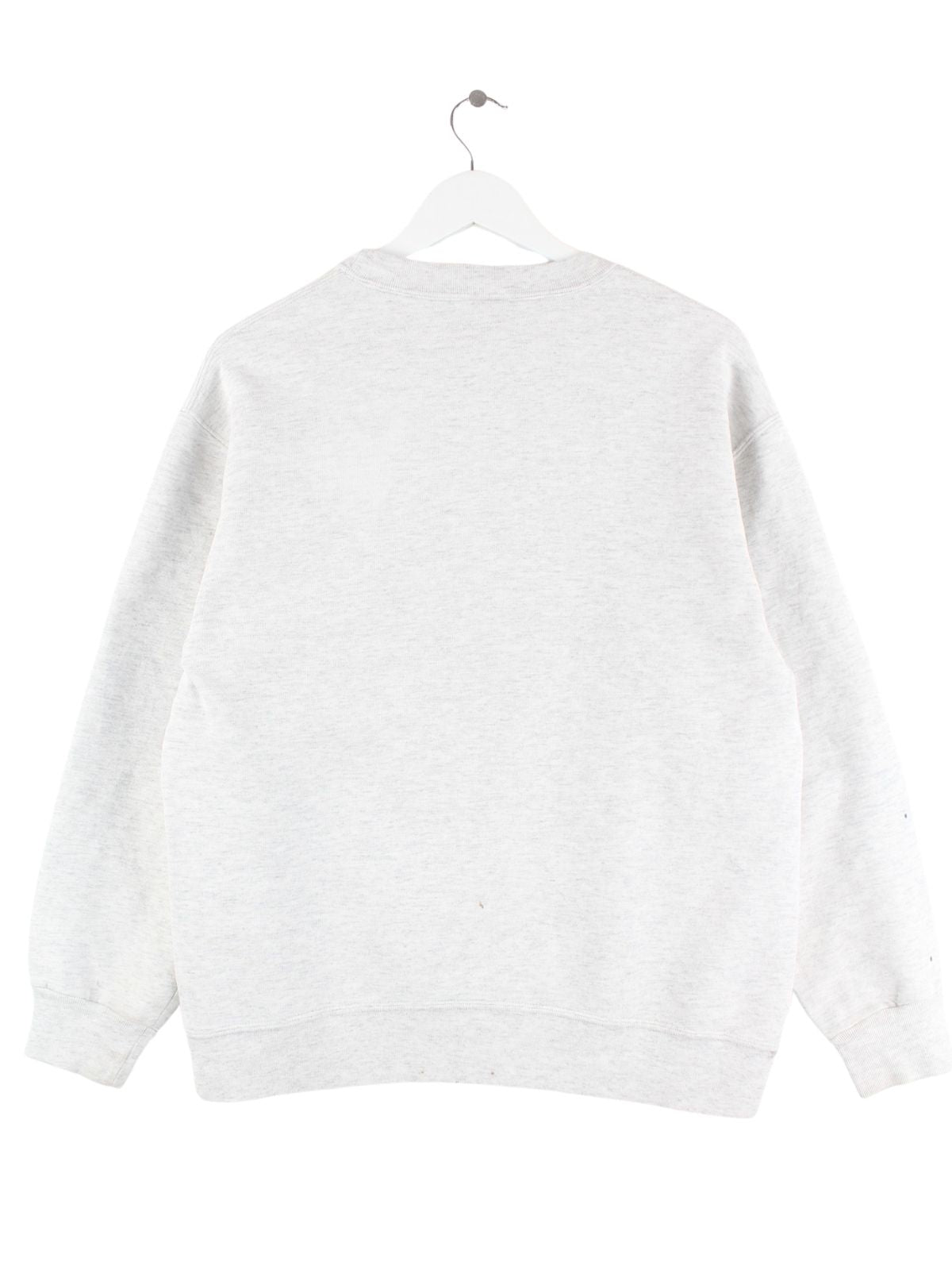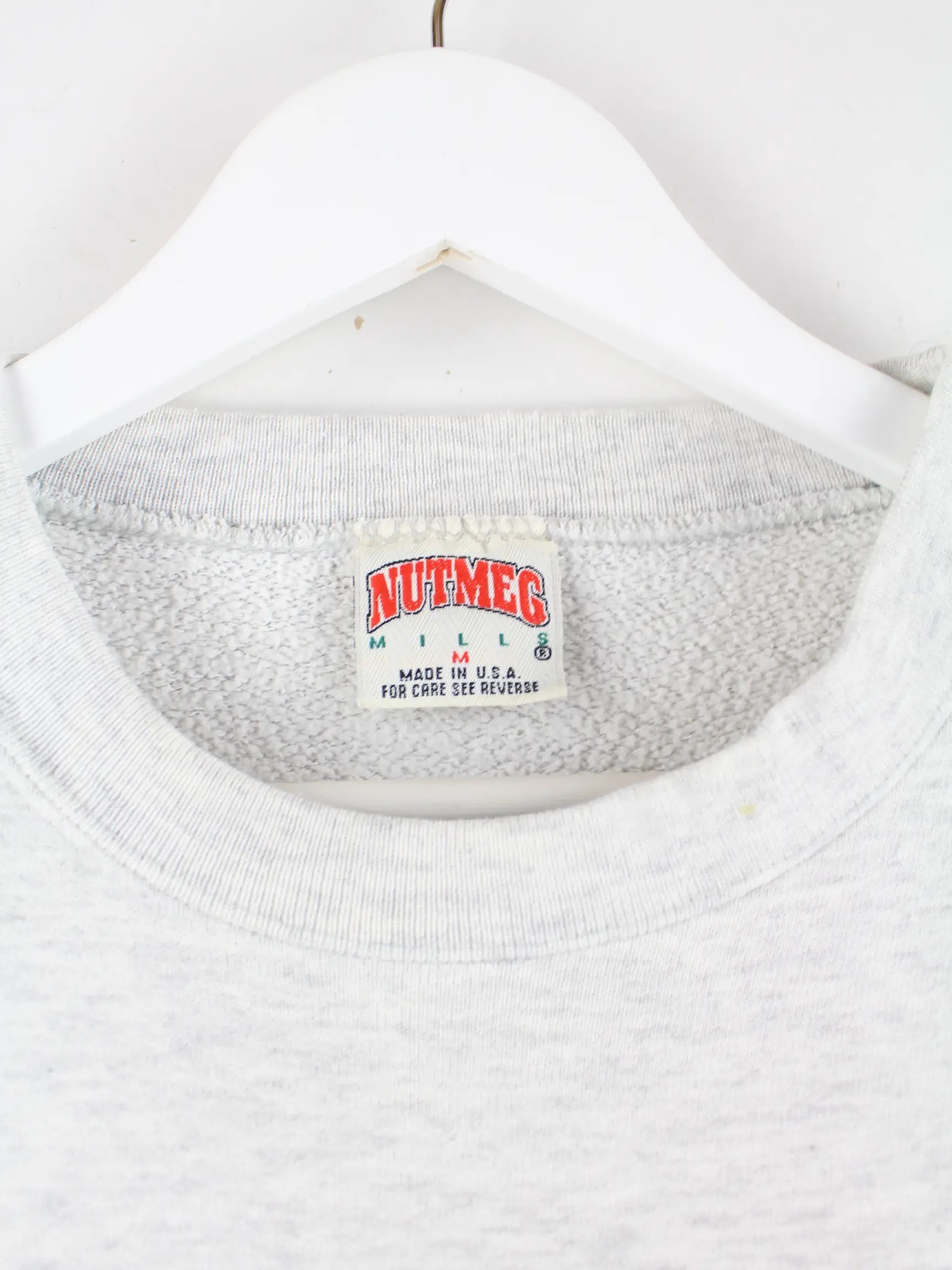 Sweater des Labels Nutmeg mit gesticktem Logo in Größe M aus den 90'ern. Er ist aus einer Baumwollmischung gefertigt und in Grau bei uns zu bekommen.