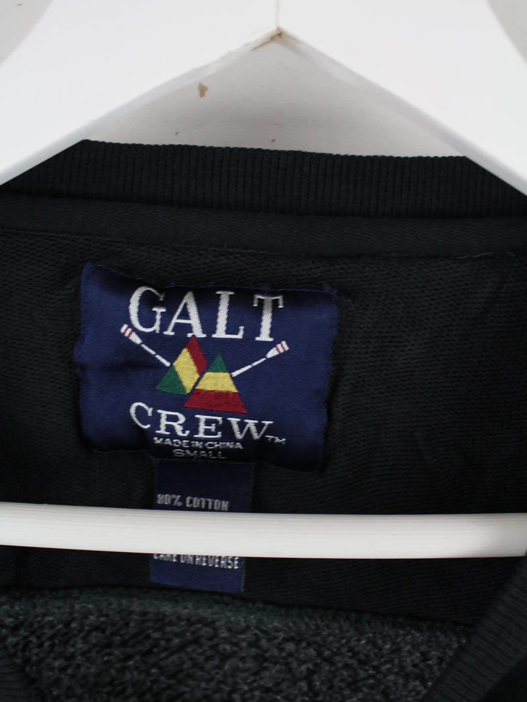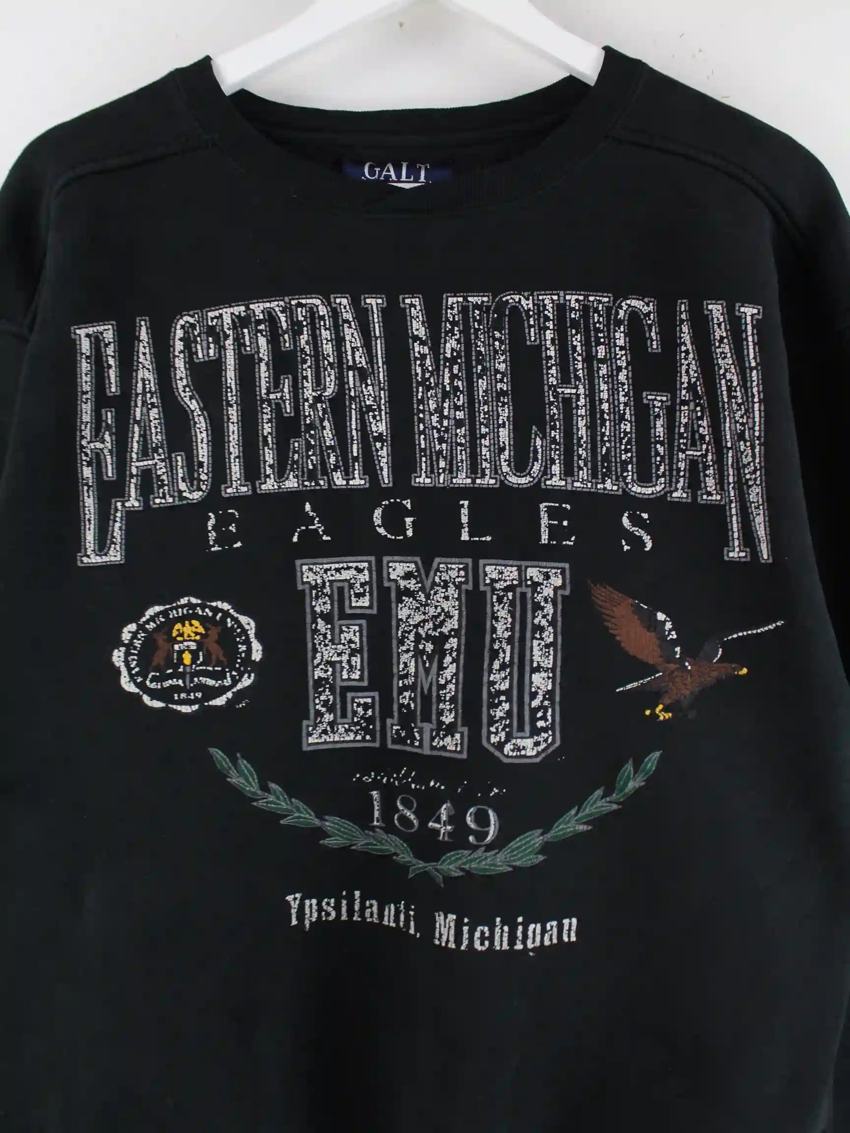 Vintage Sweater in Größe S aus den 90'ern. Er ist aus einer Baumwollmischung produziert und in Schwarz im Angebot. Mit schickem Michigan Print.
