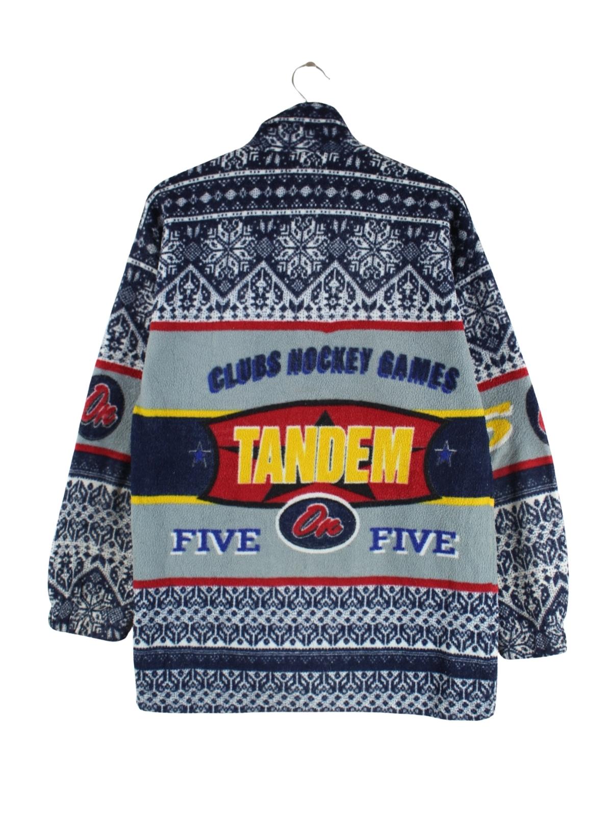 Vintage Leichte Jacke mit kurzem Reißverschluß in Größe XXL aus den 90'ern. Sie ist aus angenehmem Fleece produziert und in Blau vorrätig. Mit seltenem Hockey Print.