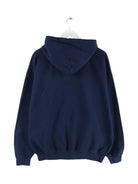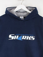 Hoodie von Gildan in Größe L. Er ist aus einer Baumwollmischung gefertigt und in Blau bei uns vorrätig. Mit chiquem Sharks Print.
