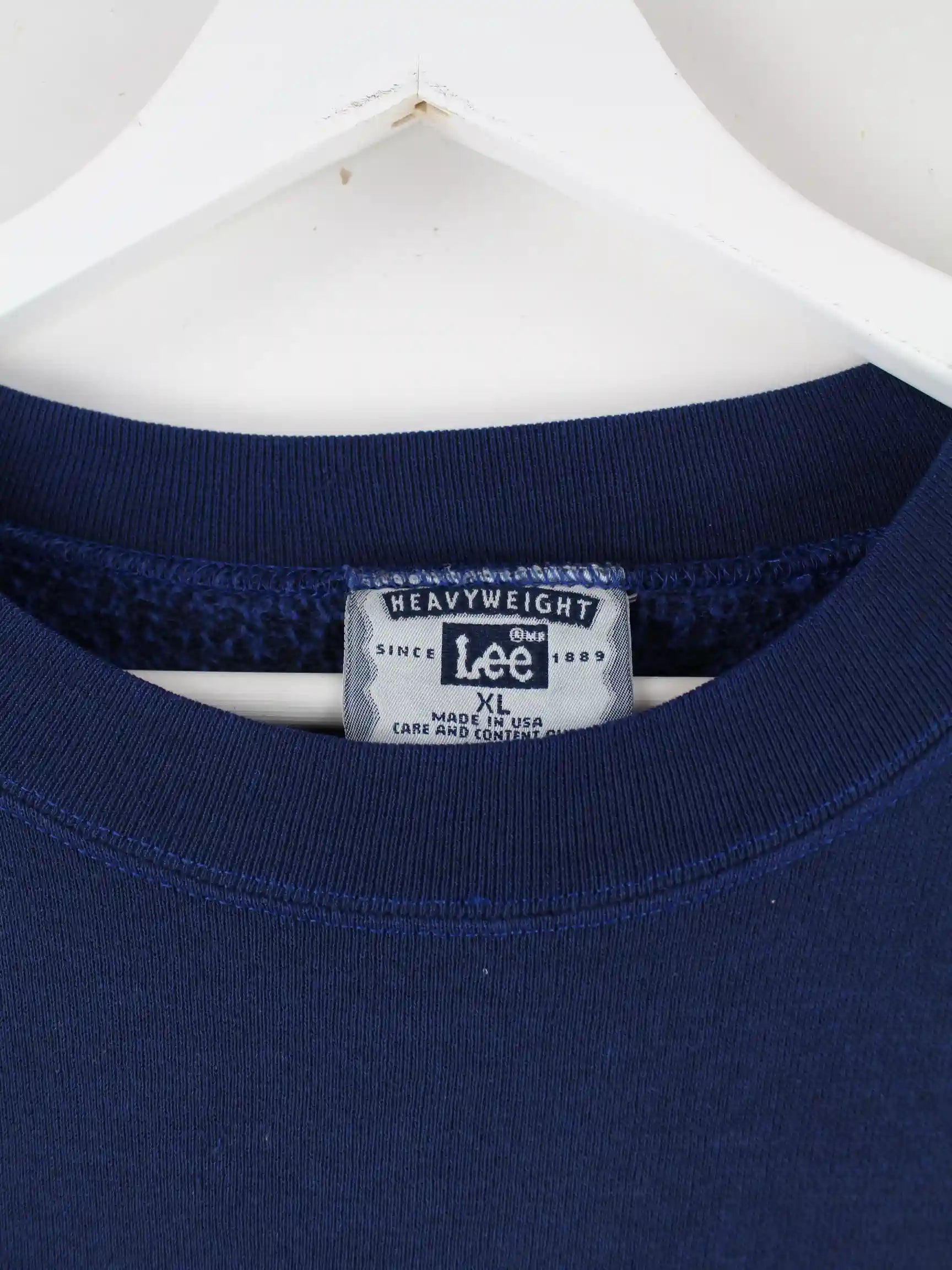 Blauer Sweater mit gestickten Motiven des Labels Lee aus den 90'ern in Größe XL. Er ist aus einer Baumwollmischung angefertigt und in sehr gutem Zustand im Angebot.