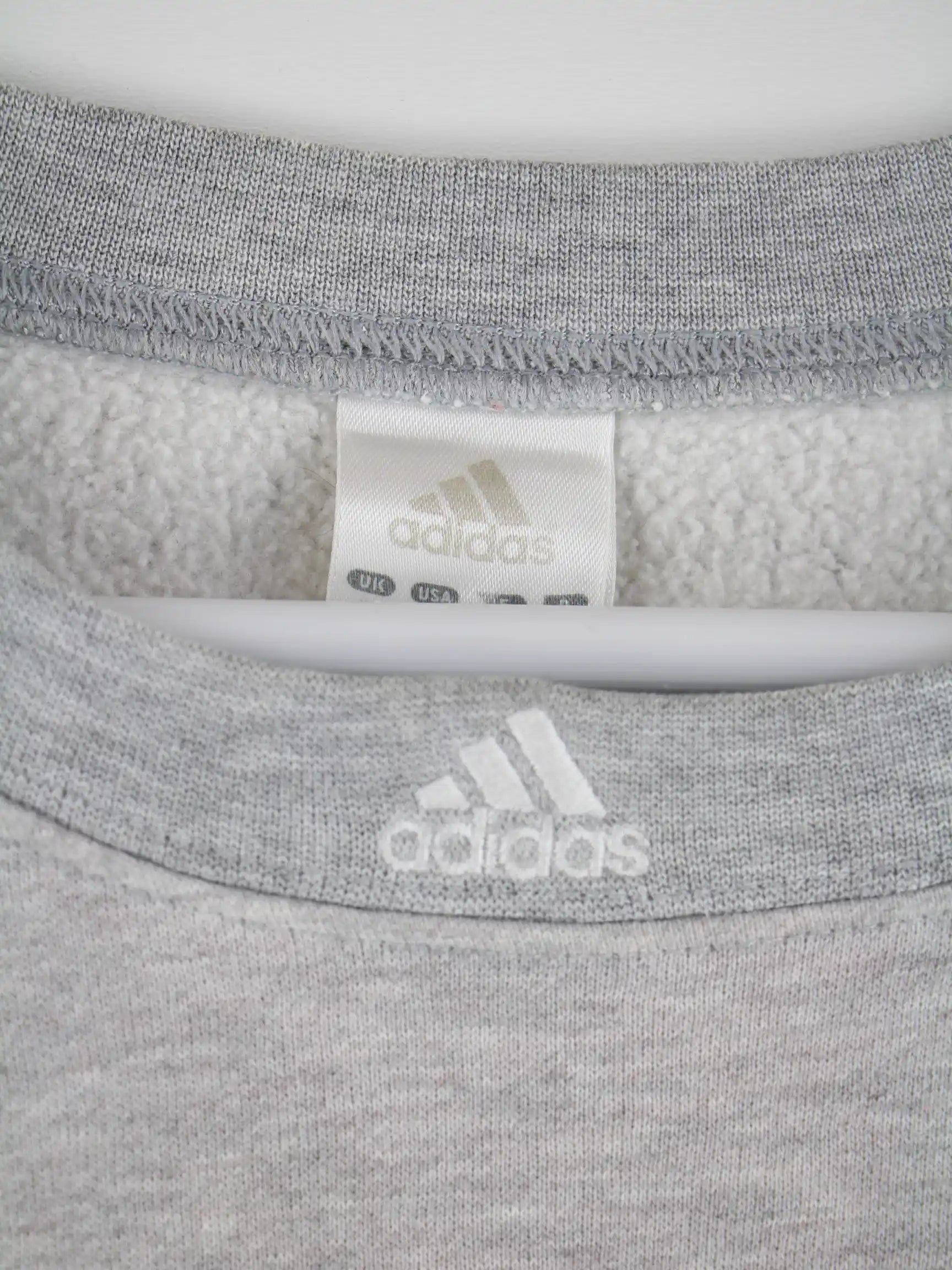 Sweater von Adidas in Größe XL. Er ist aus einer Baumwollmischung hergestellt und in Grau in Stock. Mit seltenem Camp Print.