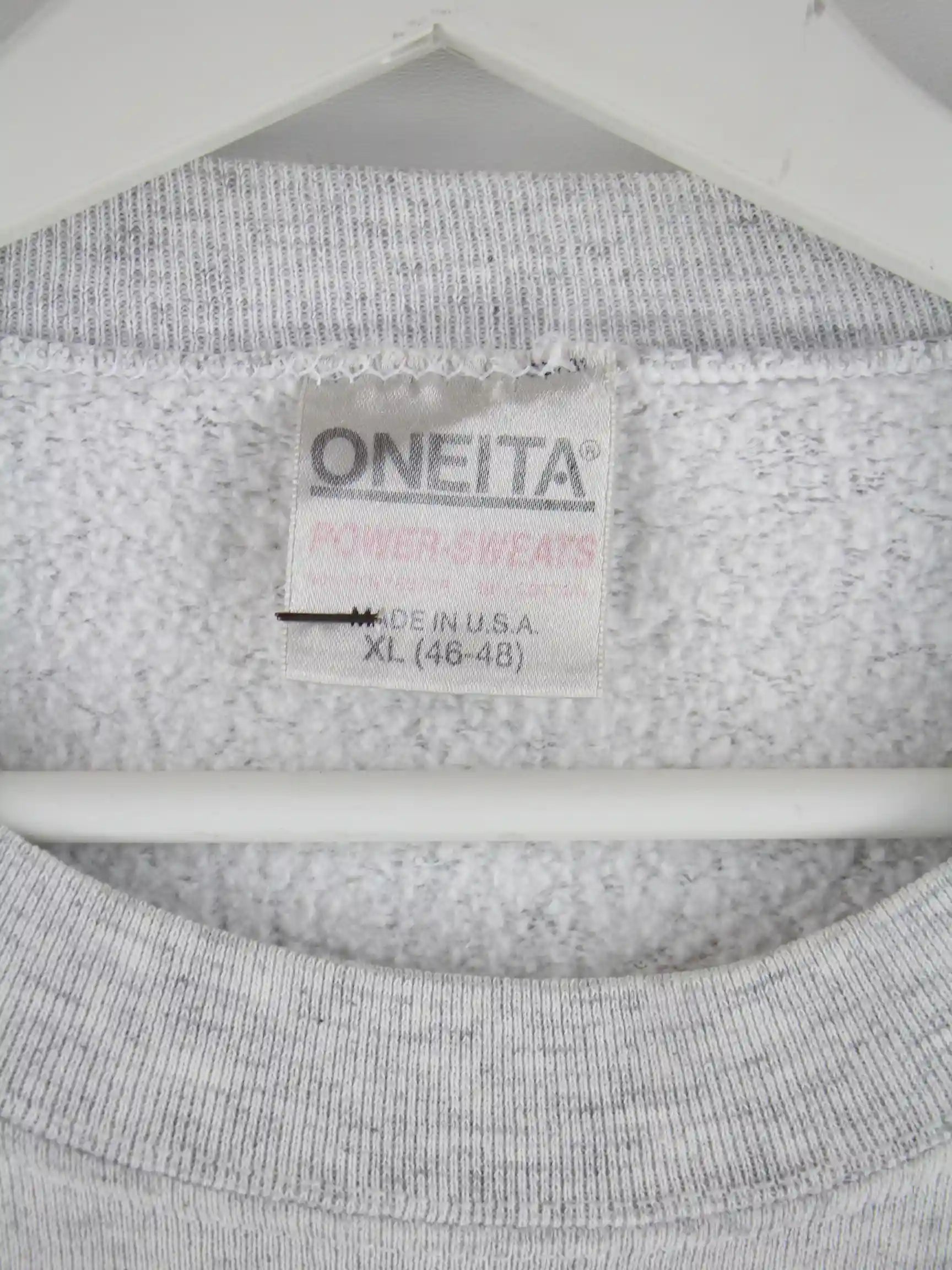 Grauer Sweater der Marke Oneita in Größe XL. Er ist aus einer Baumwollmischung . Den Zustand würden wir als 'In Ordnung' bezeichnen (vergl. Bilder).Mit chiquem Bowl Print.