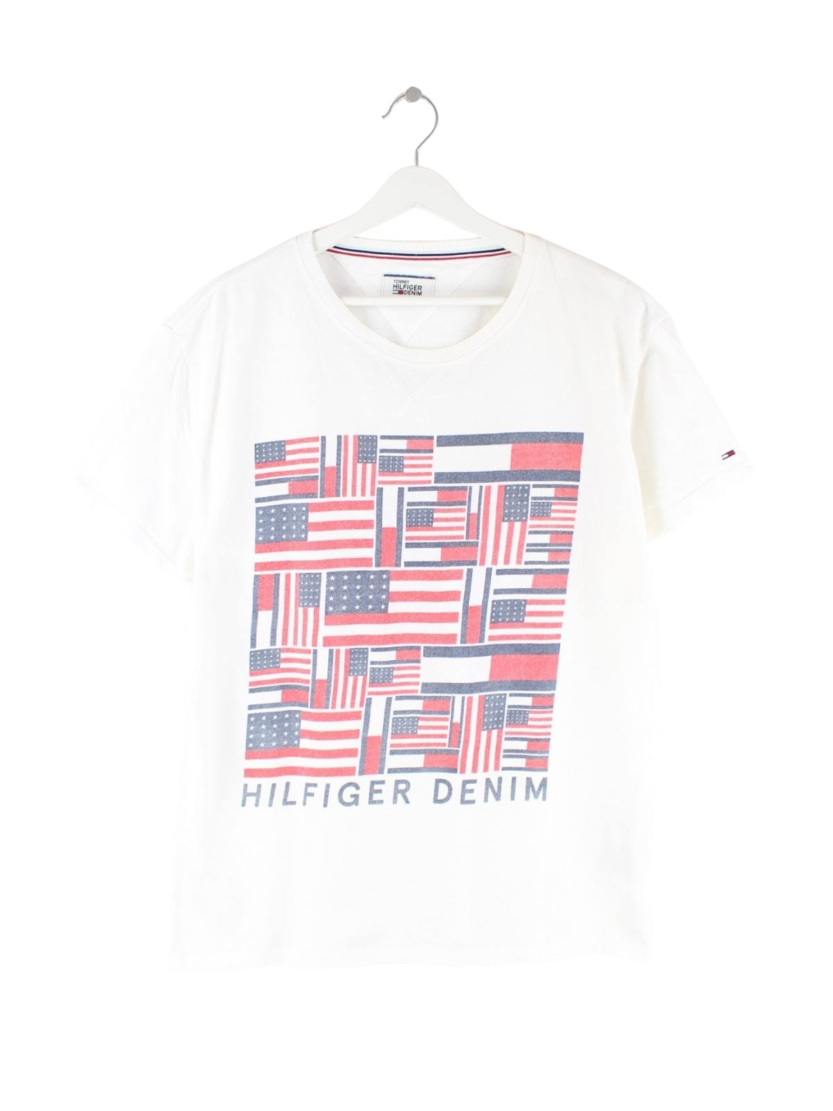 Weißes T-Shirt des Labels Tommy Hilfiger in Größe XL. Es ist aus Baumwolle angefertigt und in sehr gutem Zustand zu bekommen. Mit schönem Flag Print.