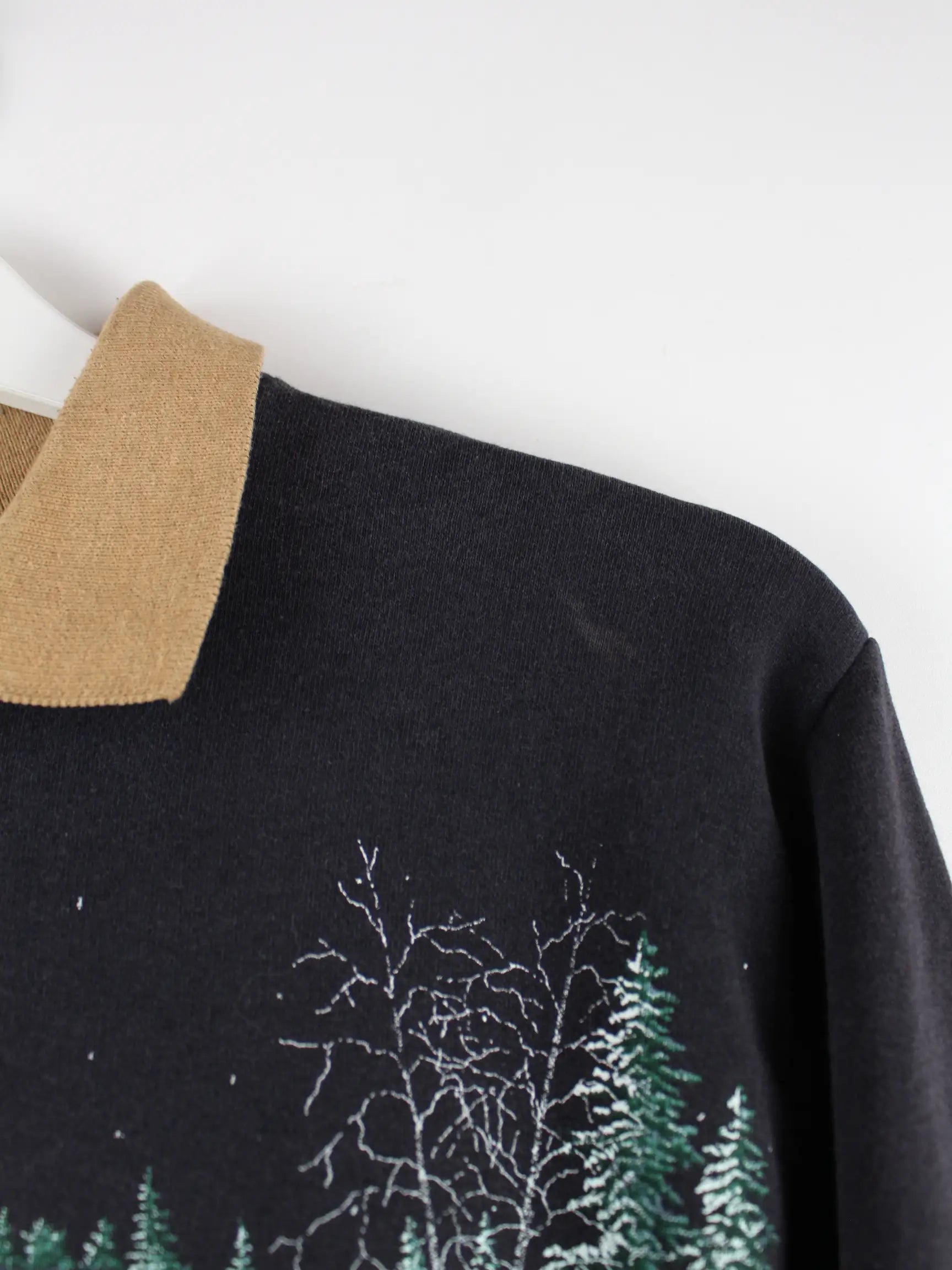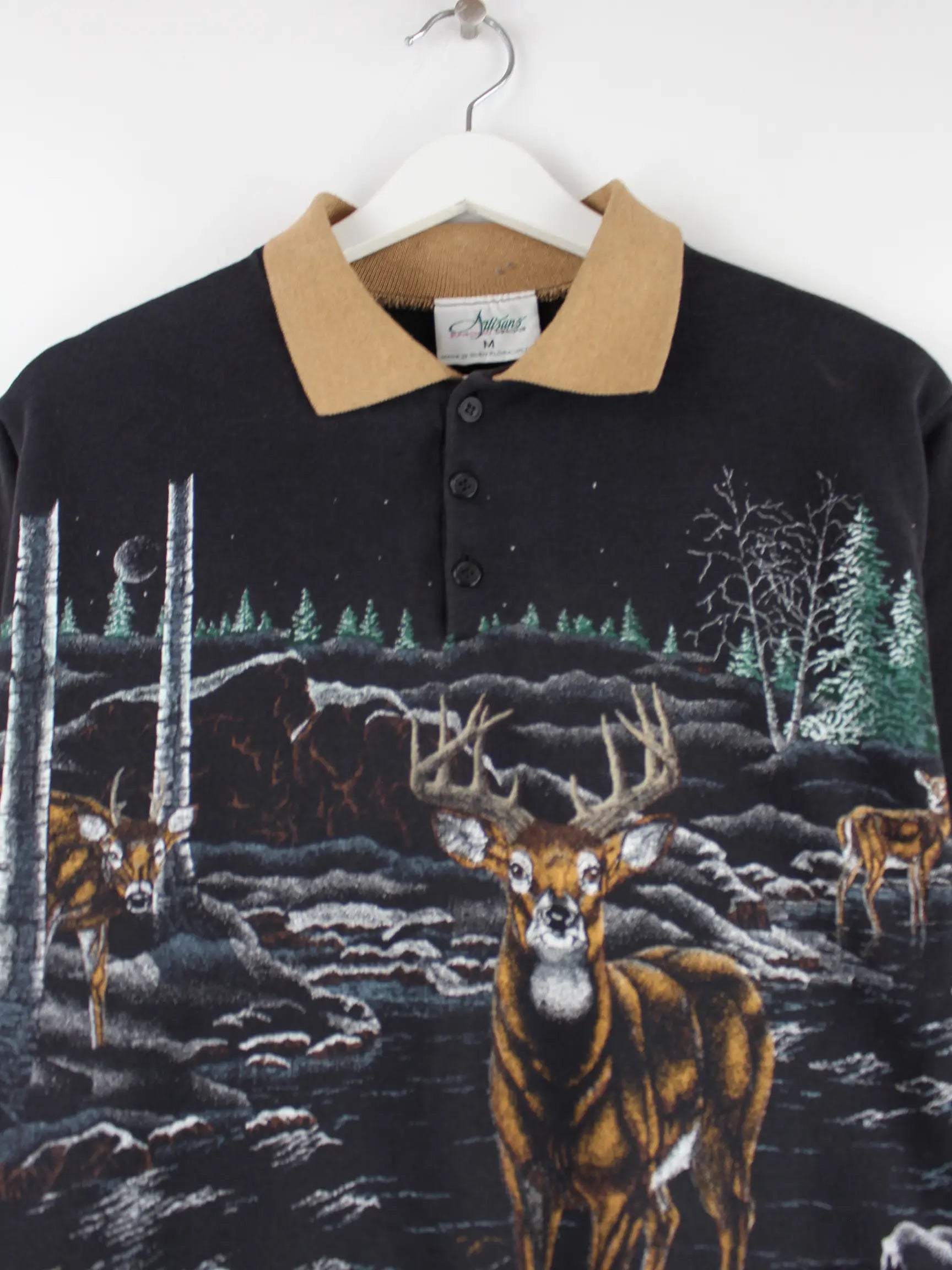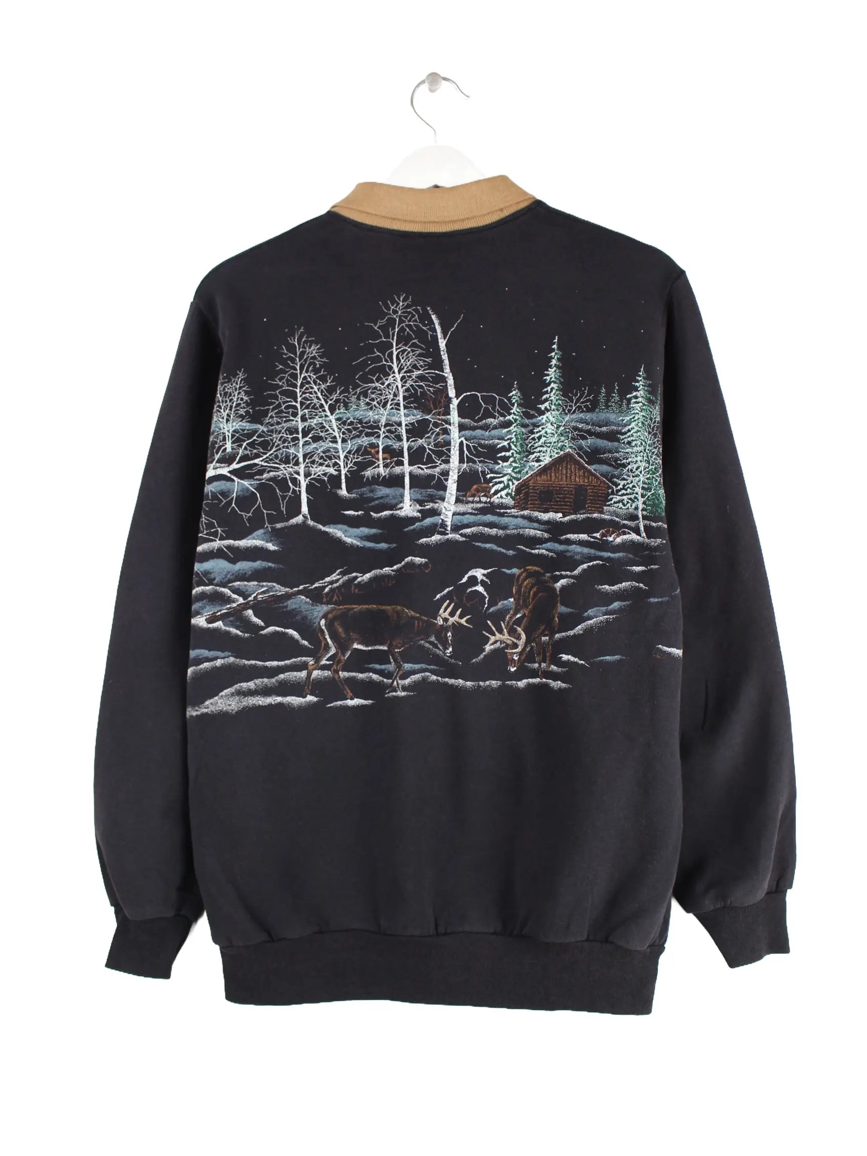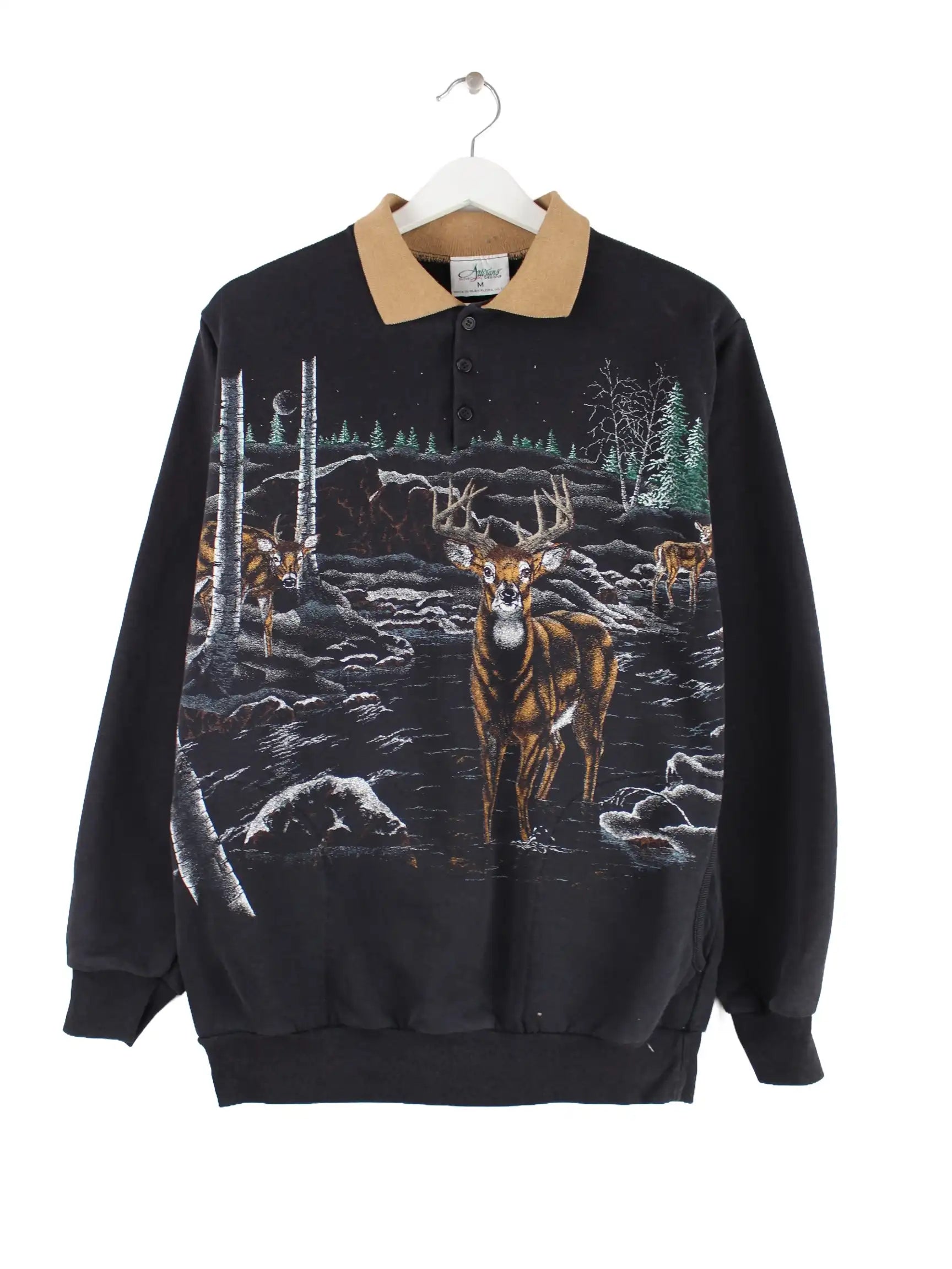 Schwarzer Vintage Sweater aus den 90'ern in Größe M. Er ist aus einer Baumwollmischung hergestellt und in gutem Zustand in Stock. Mit tollem Deer Print.