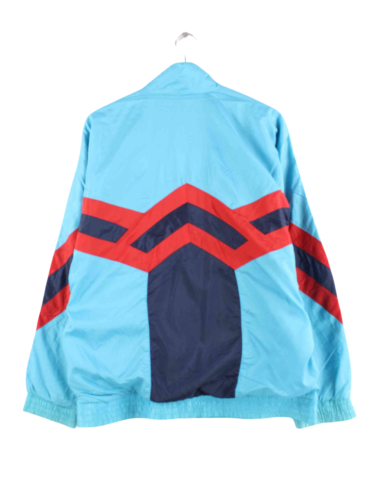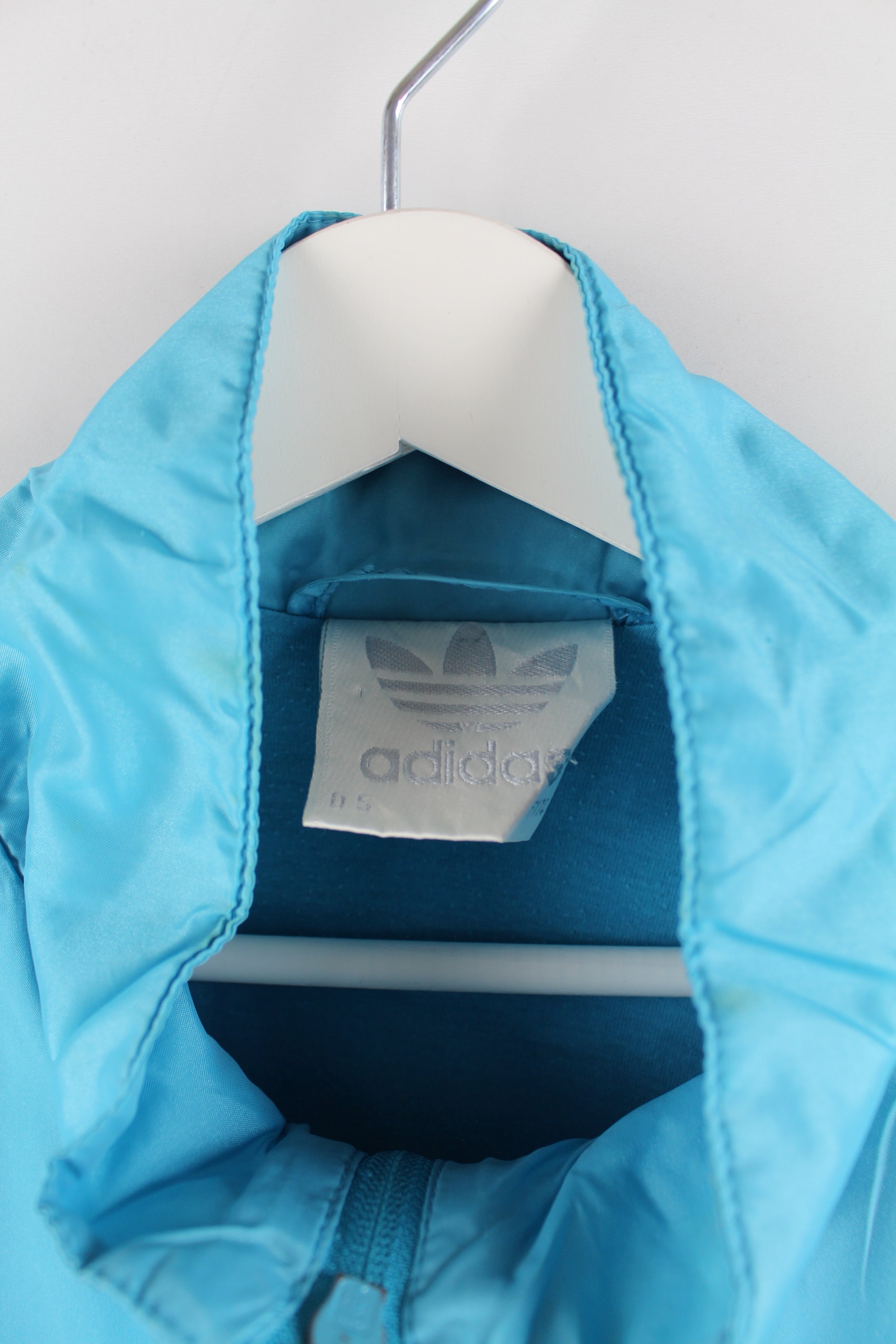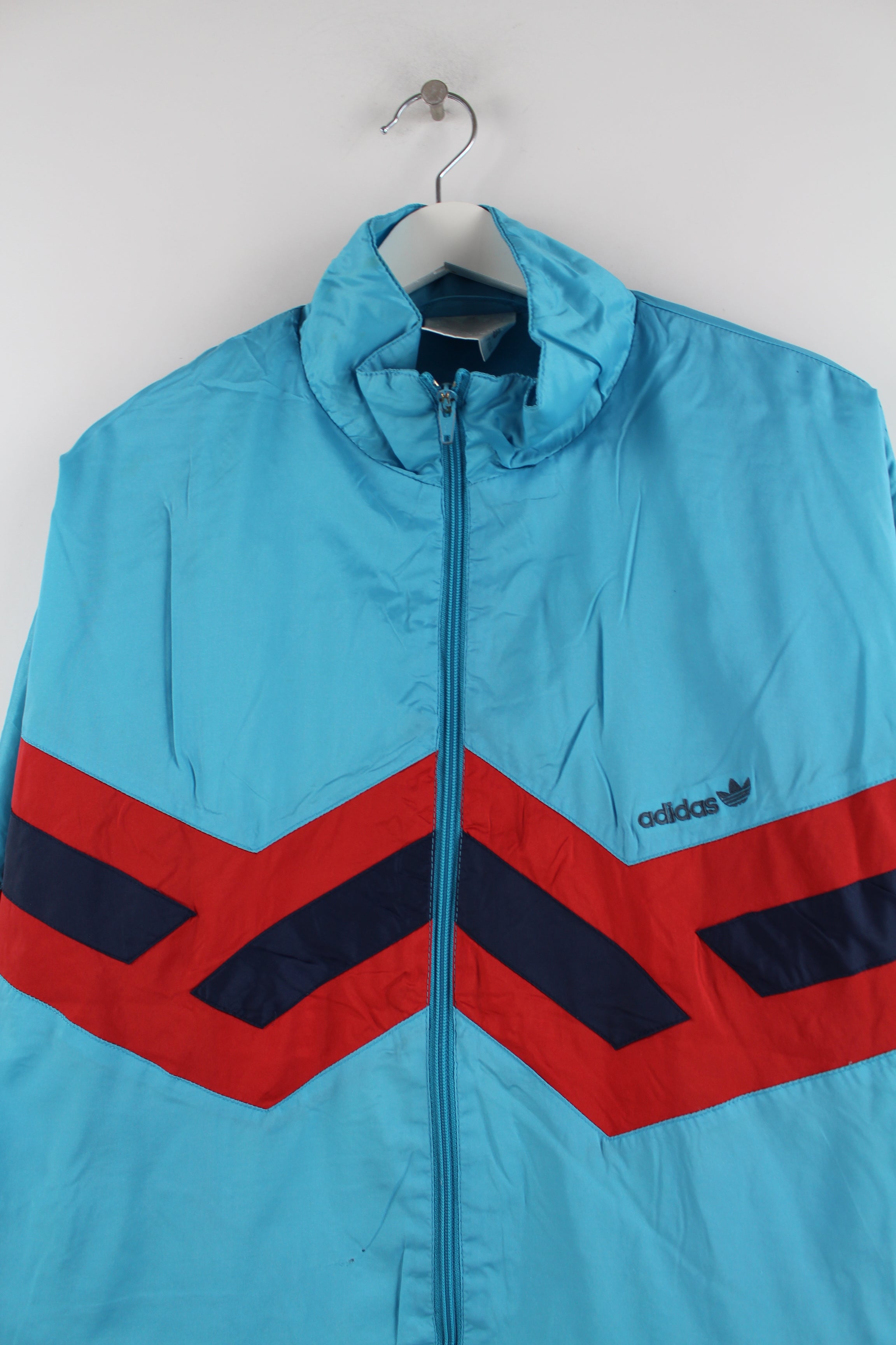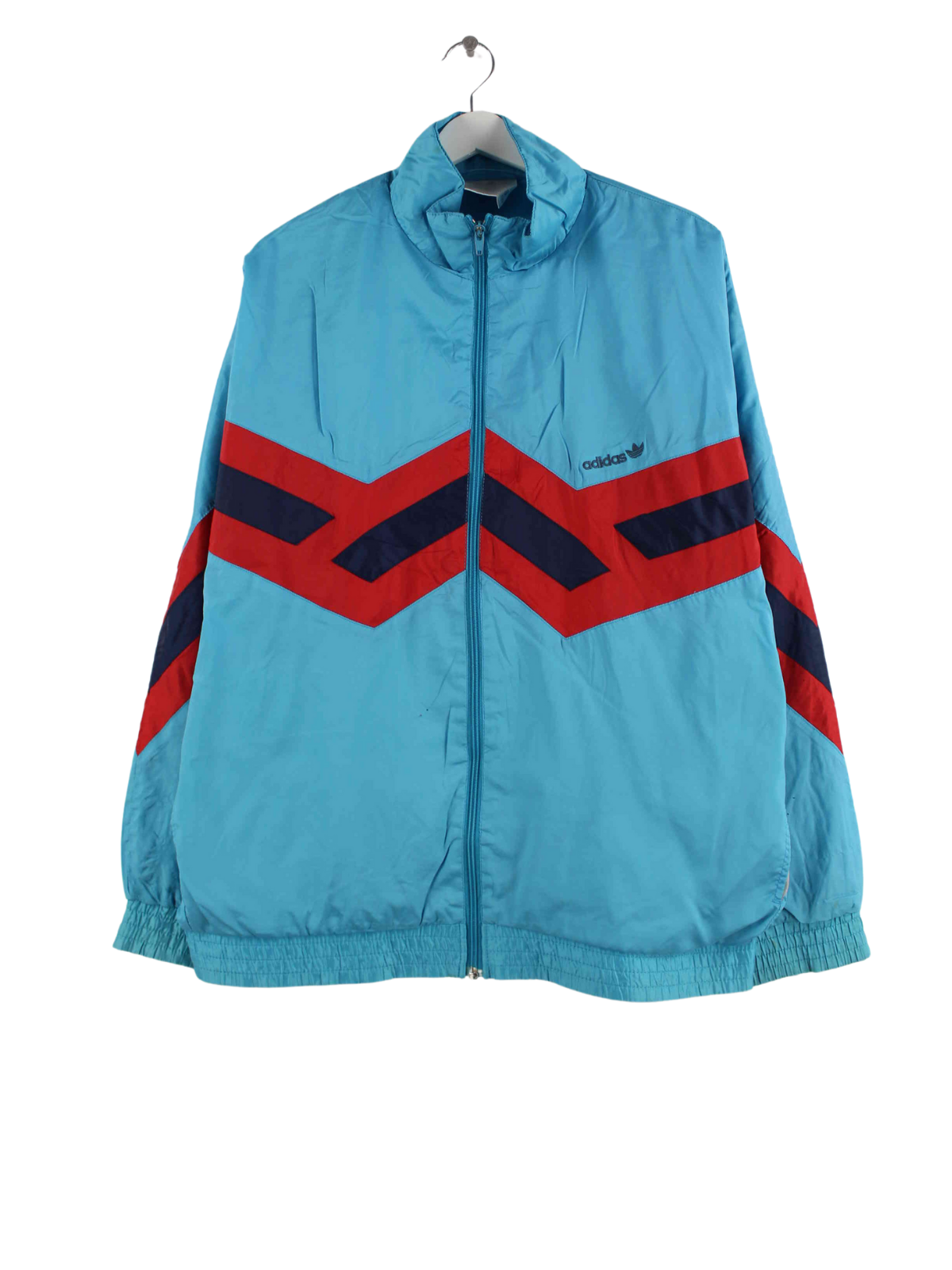 Gefällige Trainingsjacke von Adidas in Größe L aus den 80'ern. Sie ist aus Synthetik gefertigt und in Blau zu haben.