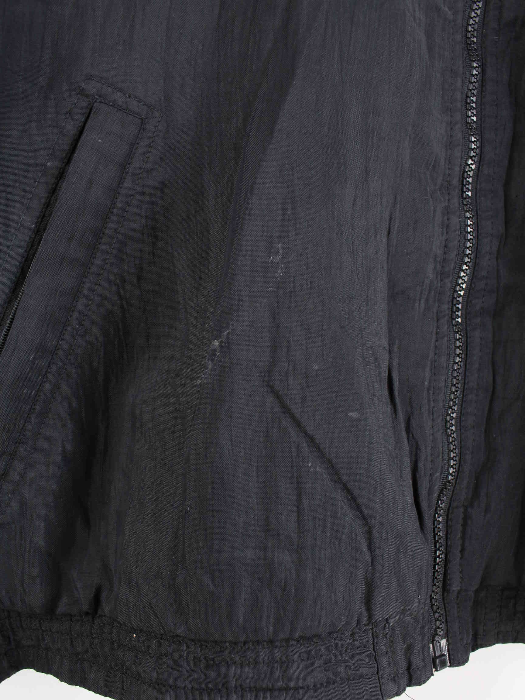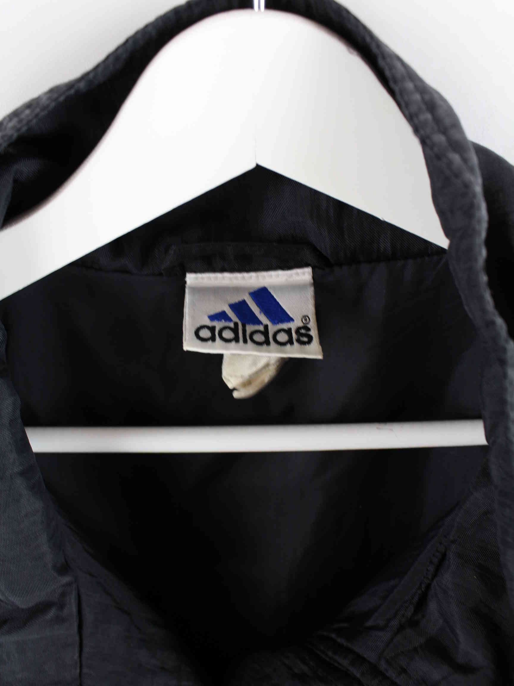 Trainingsjacke des Labels Adidas mit gestickten Motiven in Größe XL aus den 90'ern. Sie ist aus Synthetik gefertigt und in Schwarz zu haben.