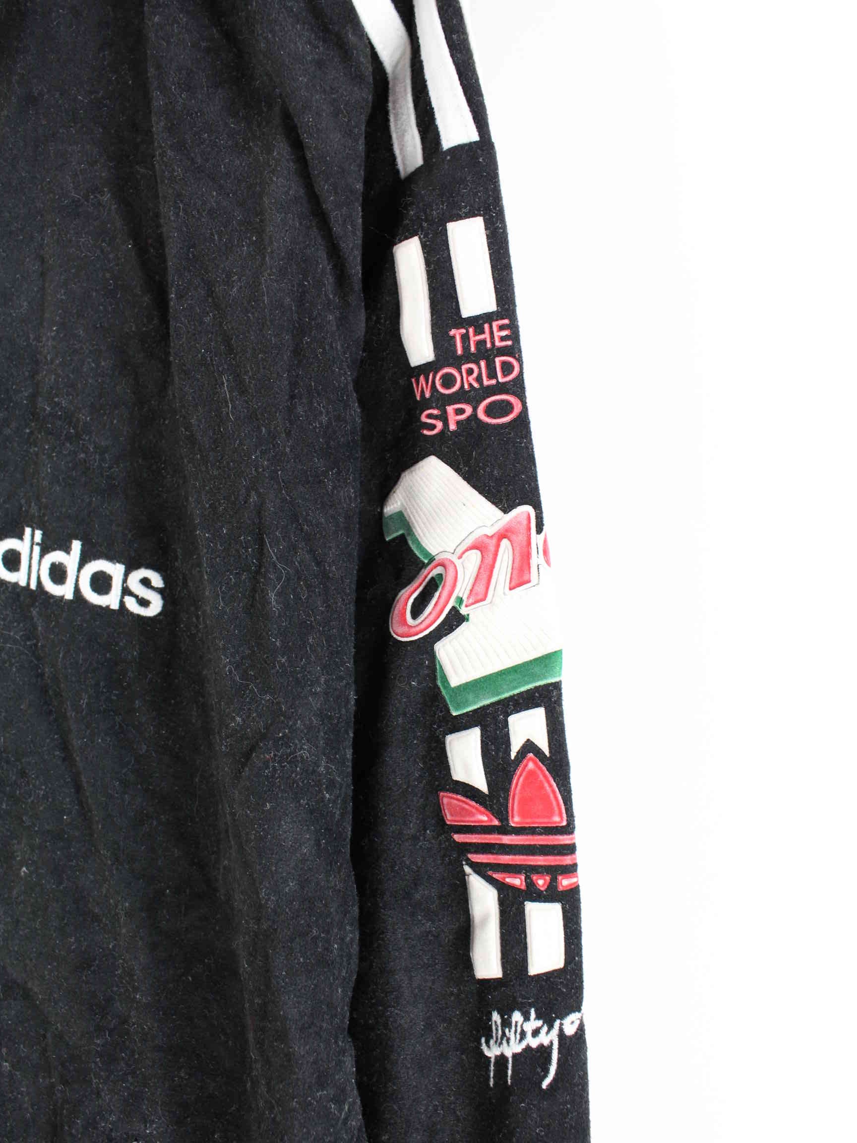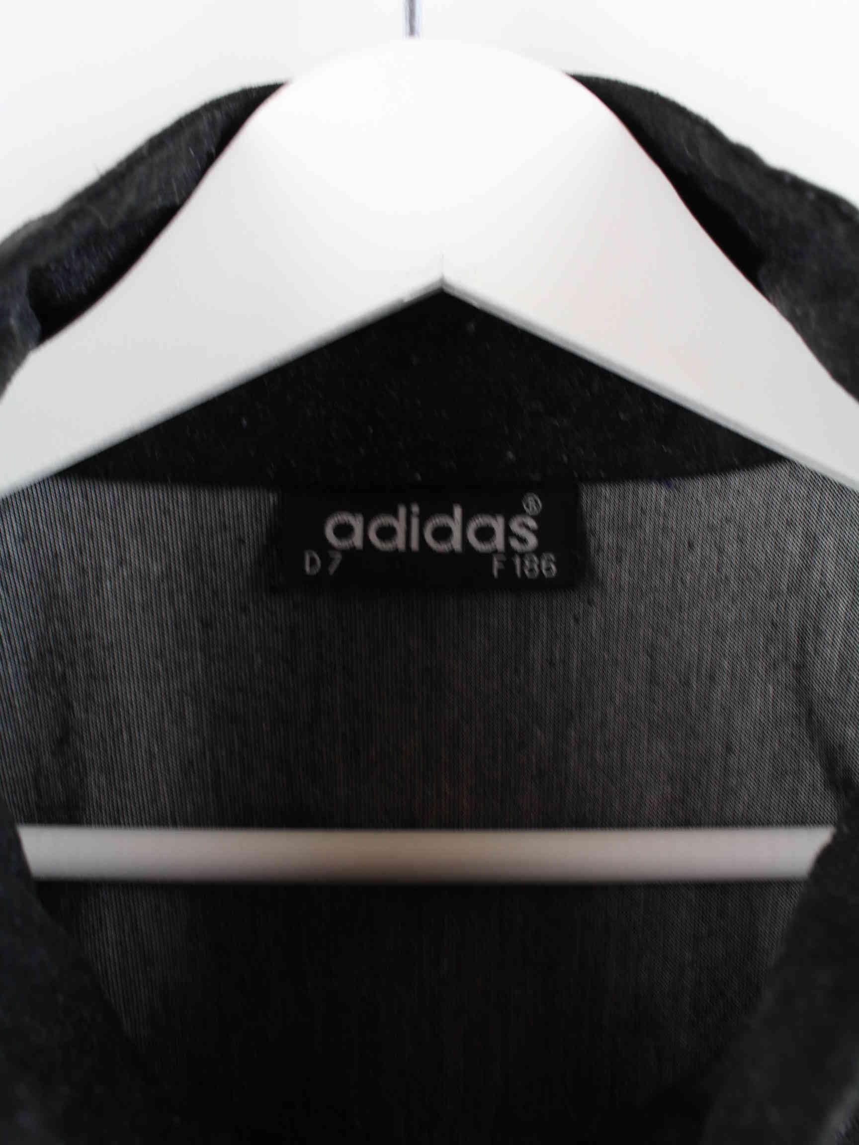 Trainingsjacke aus dem Hause Adidas mit gestickten Motiven in Größe L aus den 90'ern. Sie ist aus Synthetik gefertigt und in Schwarz bei uns vorrätig.