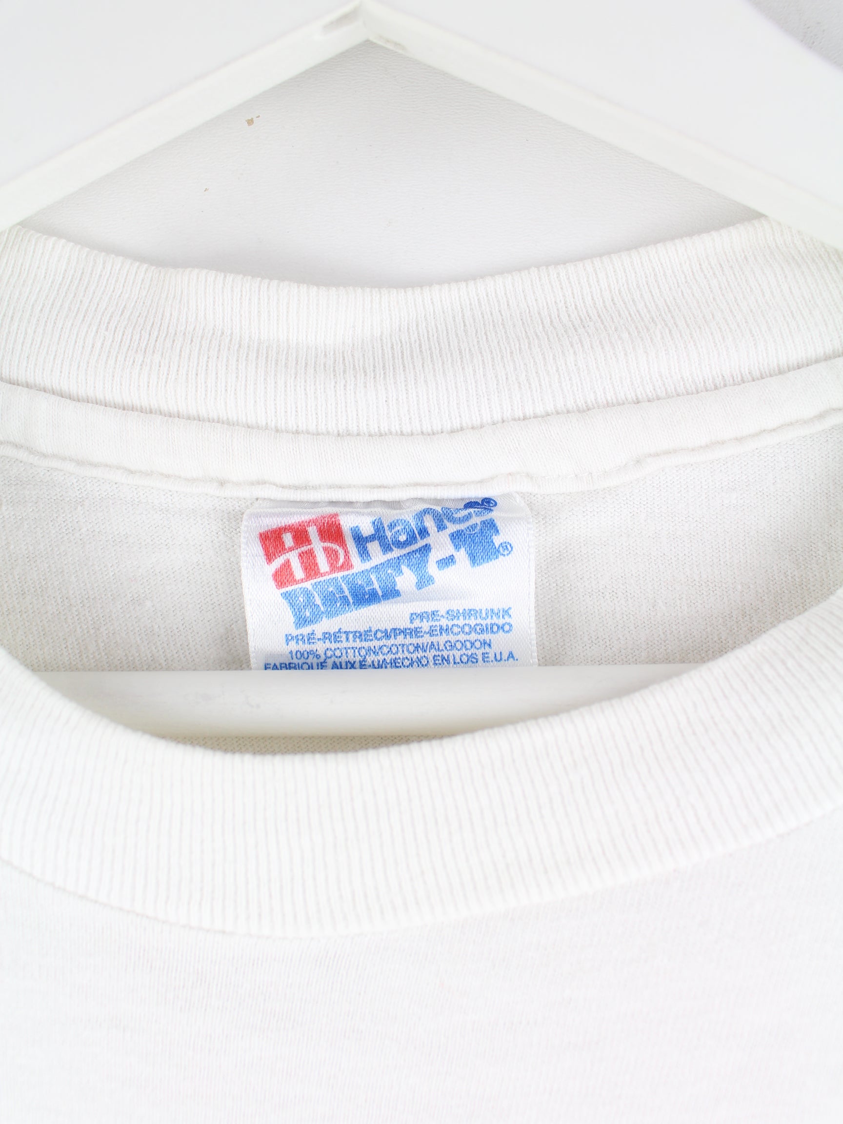 T-Shirt von Hanes in Größe L aus den 80'ern. Es ist aus Baumwolle angefertigt und in Weiß in Stock.