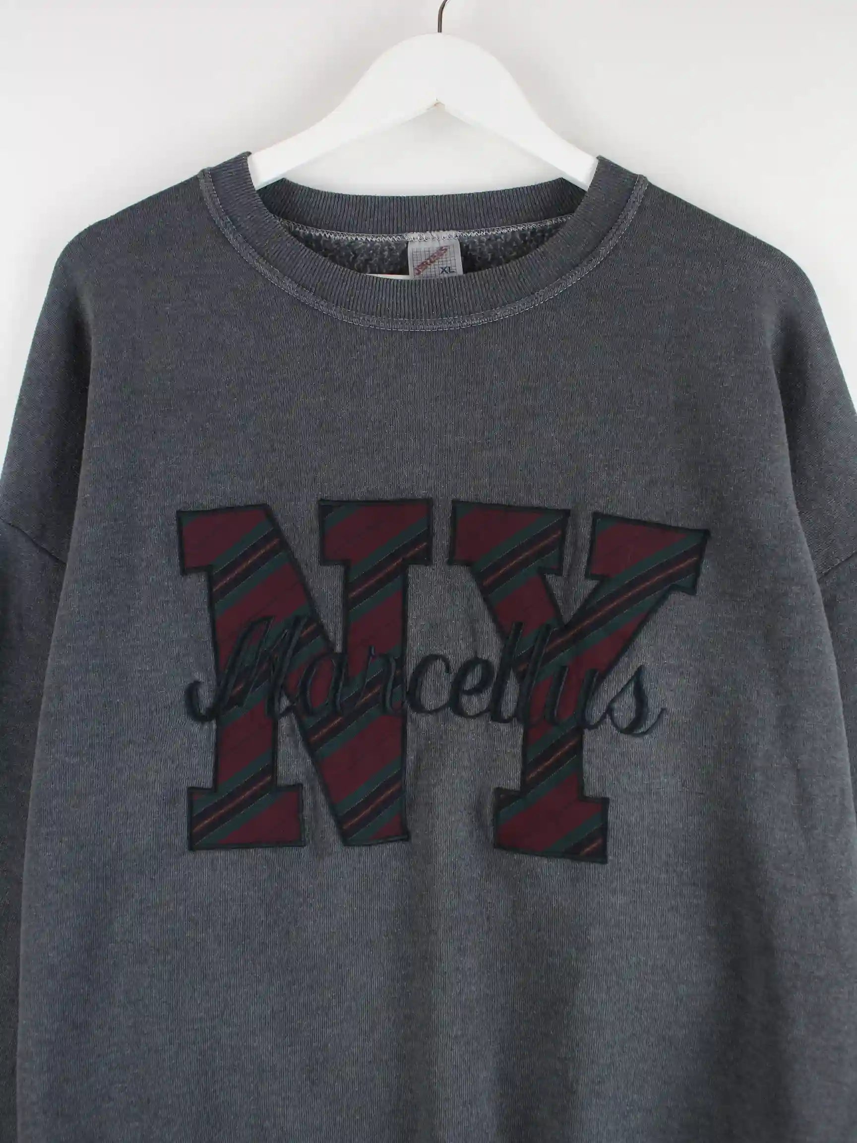 Grauer Sweater vom Brand Jerzees aus den 90'ern in Größe XL. Er ist aus einer Baumwollmischung gefertigt und in gutem Zustand zu bekommen. Mit seltenem Marcellus Print.