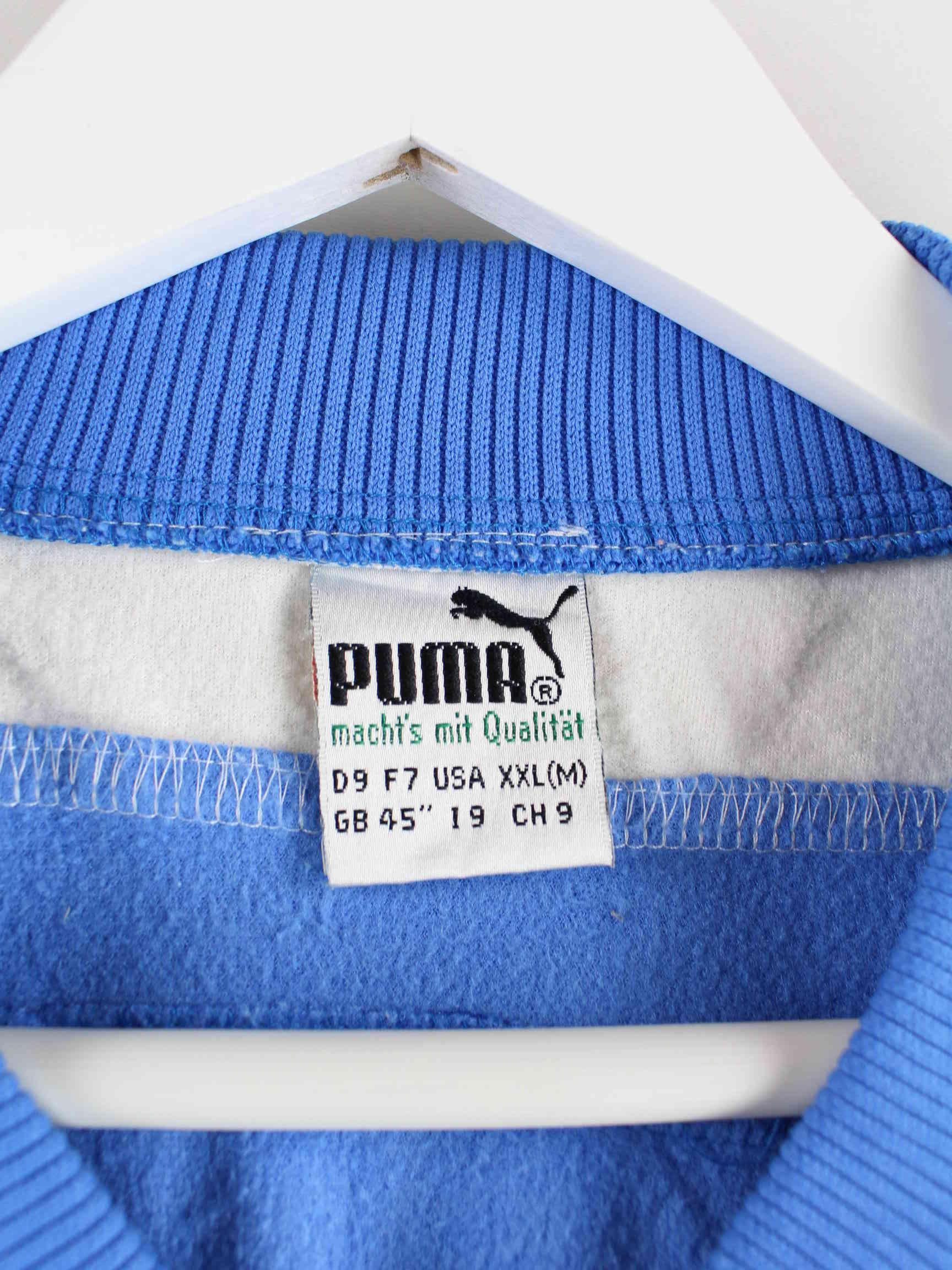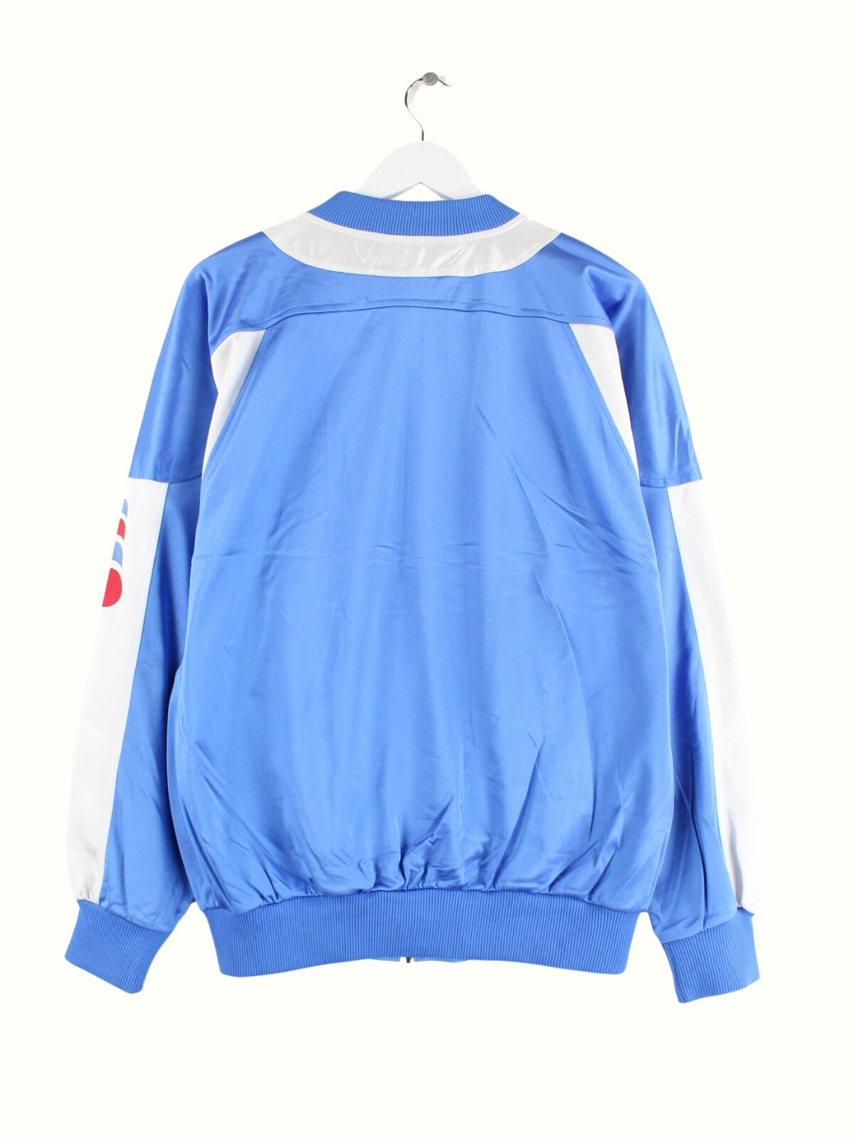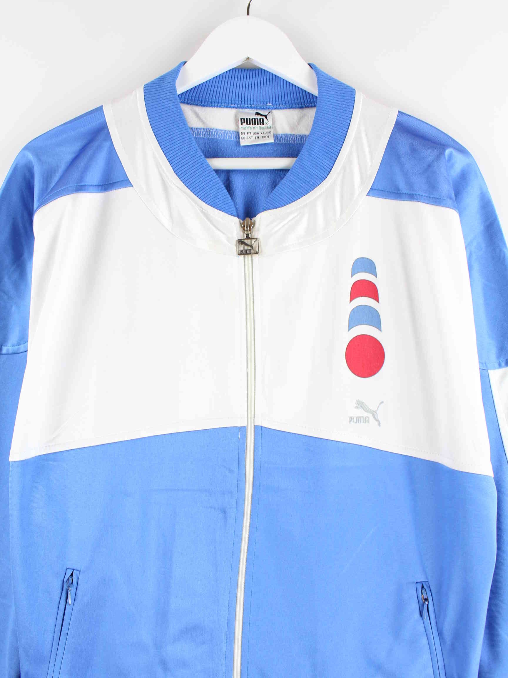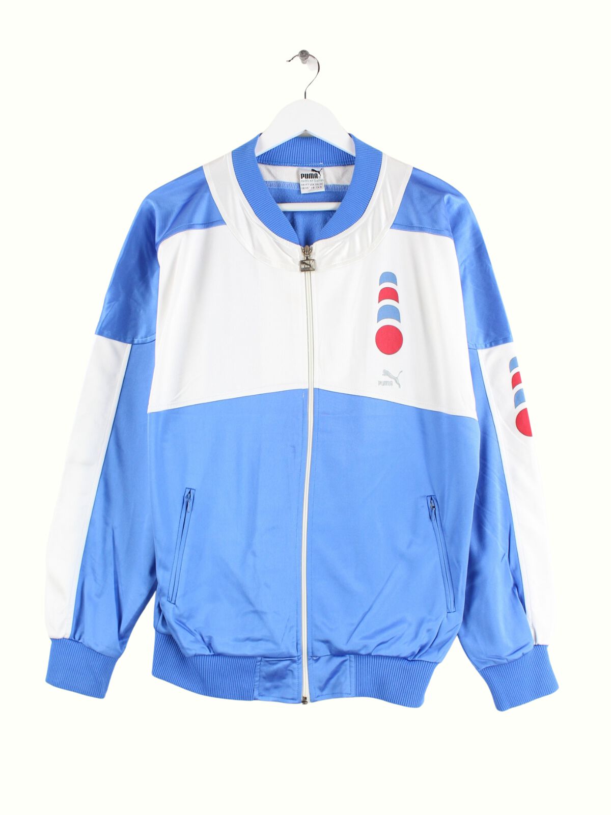Blaue Trainingsjacke vom Label Puma aus den 80'ern in Größe L. Sie ist aus Synthetik und in sehr gutem Zustand auf Lager.