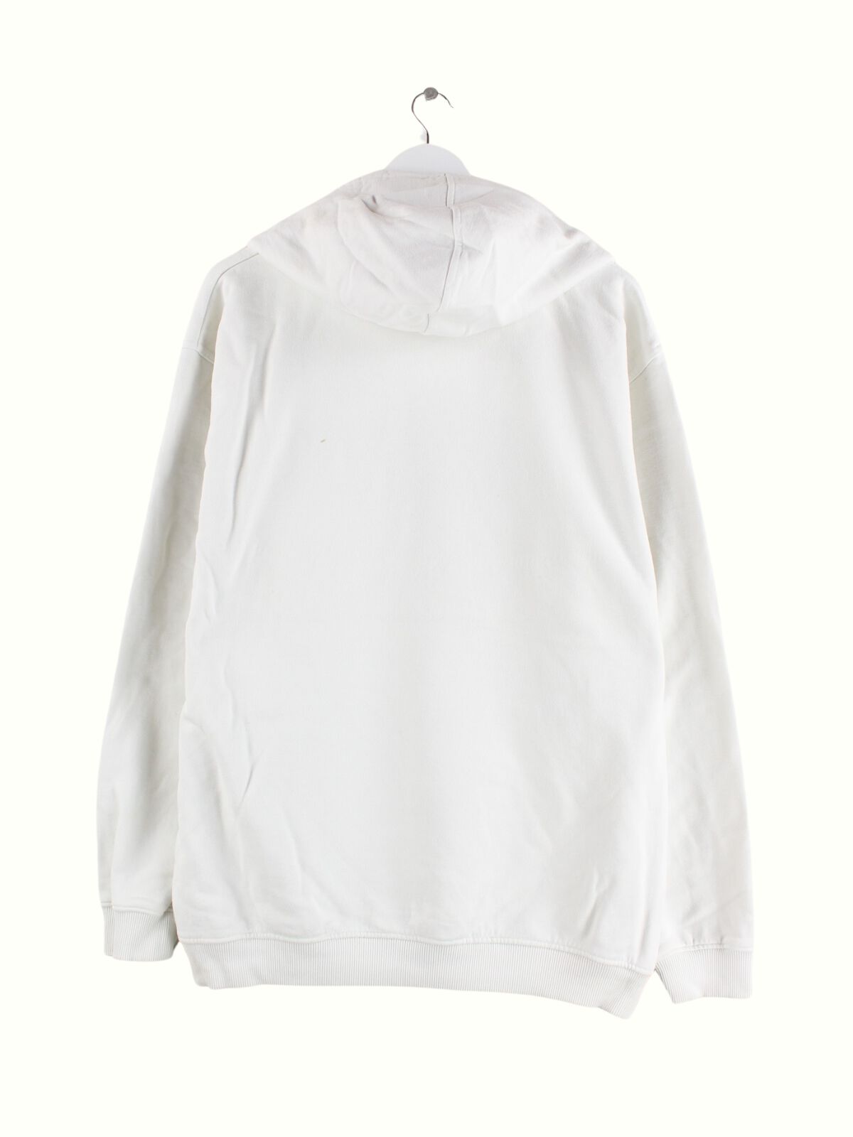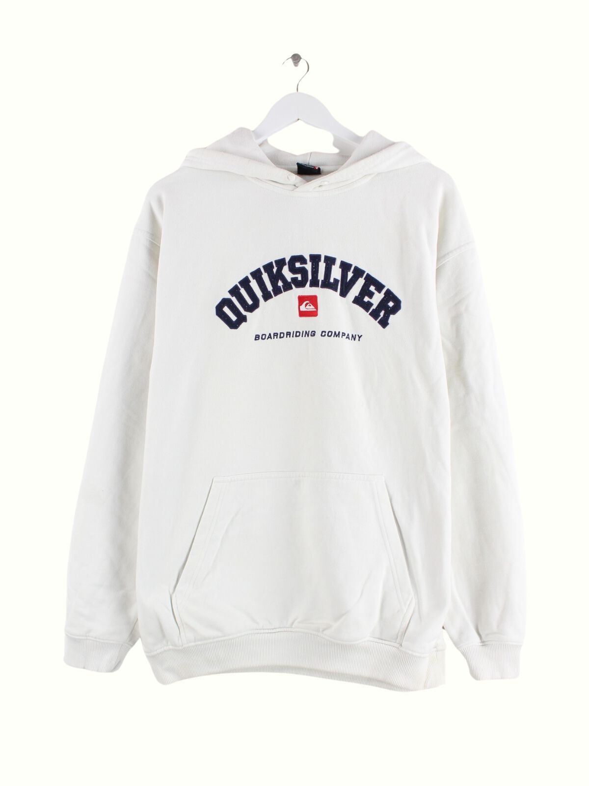 Weißer Hoodie mit Stick vom Brand Quiksilver aus den 90'ern in Größe L. Er ist aus einer Baumwollmischung hergestellt und in gutem Zustand in Stock.
