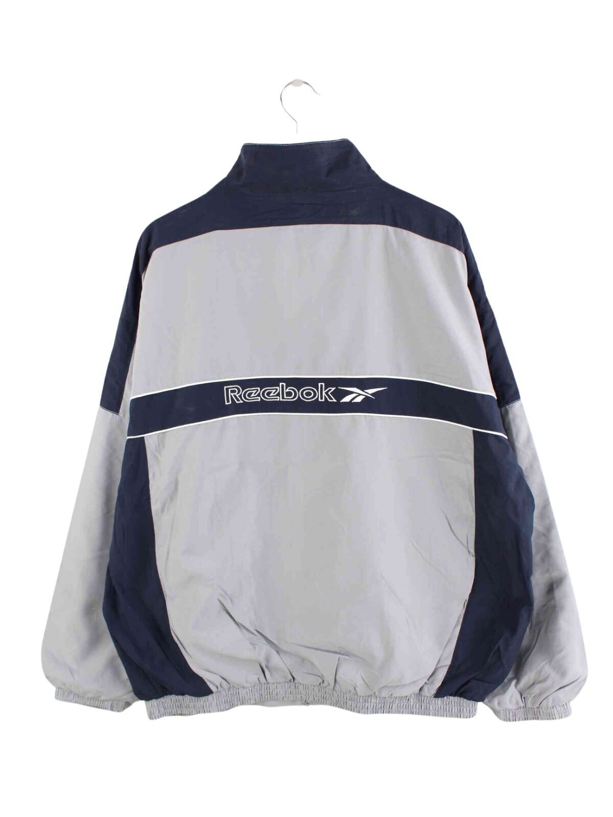 Graue Trainingsjacke mit gesticktem Logo vom Brand Reebok aus den 90'ern in Größe XL. Sie ist aus Synthetik hergestellt und in sehr gutem Zustand in Stock.