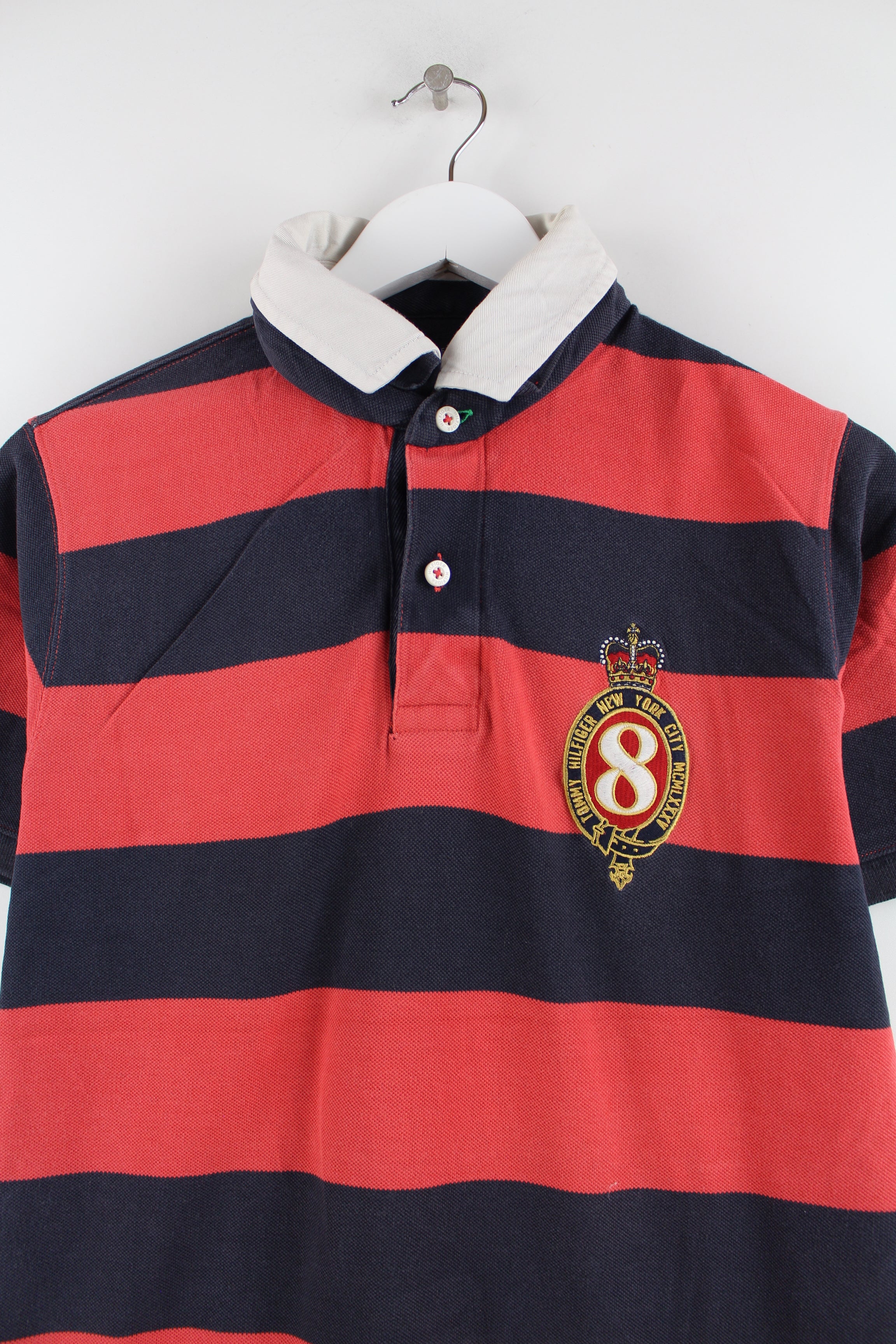 Außergewöhnliches mehrfarbiges Polo mit gestickten Mustern der Marke Tommy Hilfiger in Größe M. Es ist aus Baumwolle gefertigt und in sehr gutem Zustand bei uns zu bekommen.