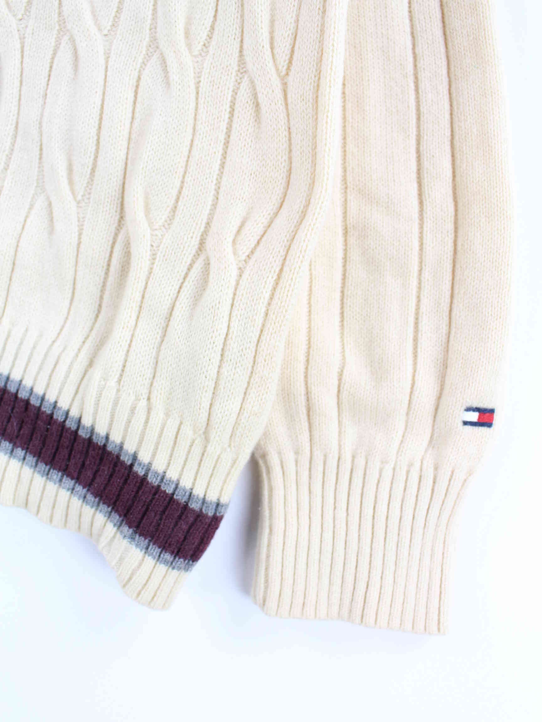 Pullover aus dem Hause Tommy Hilfiger mit gestickten Motiven in Größe L. Er ist aus Baumwolle und in Beige zu bekommen.