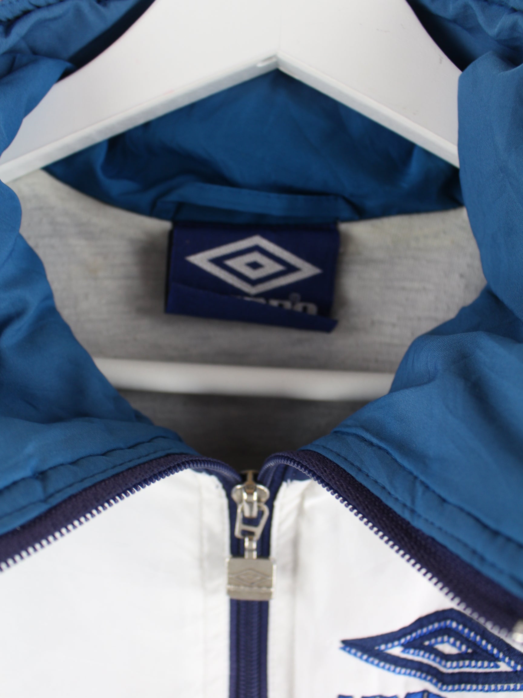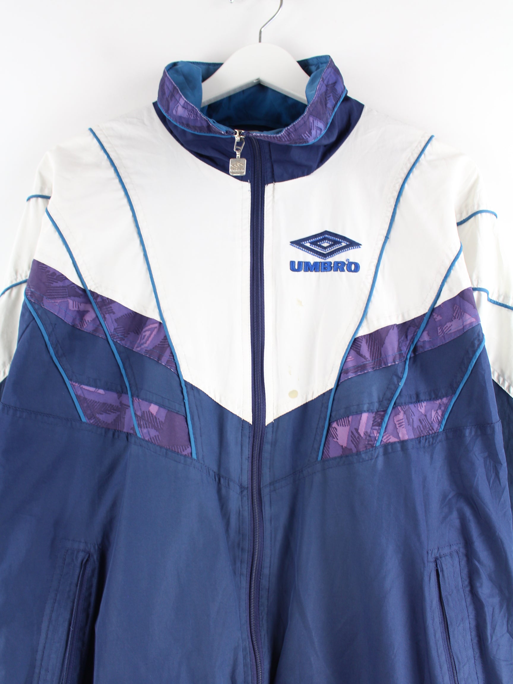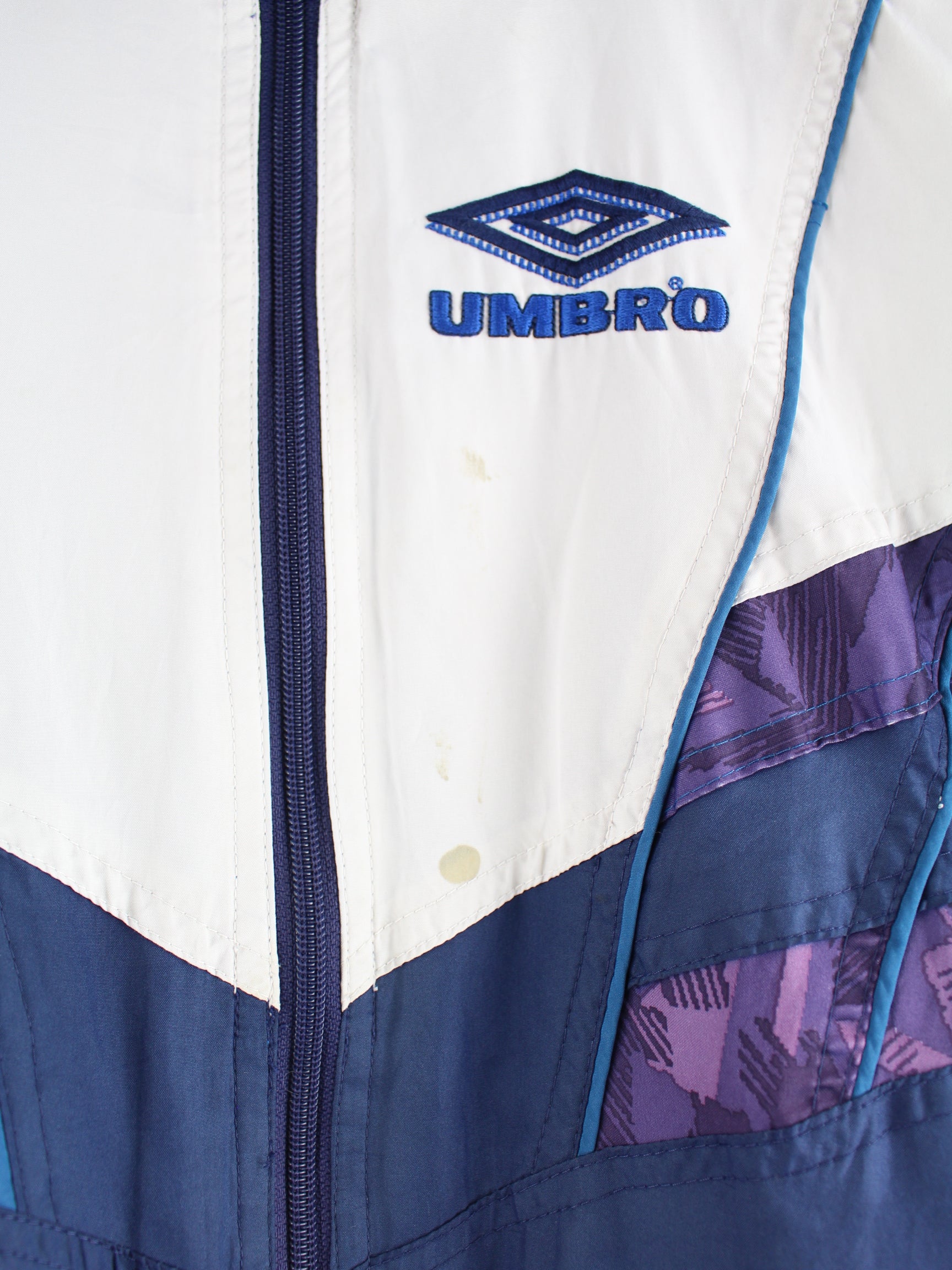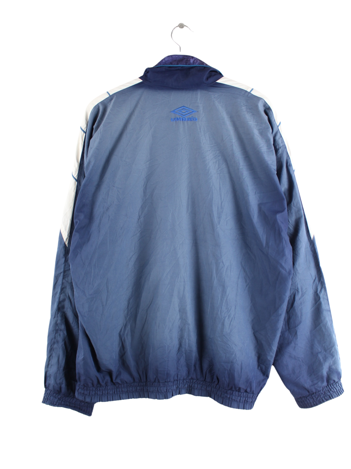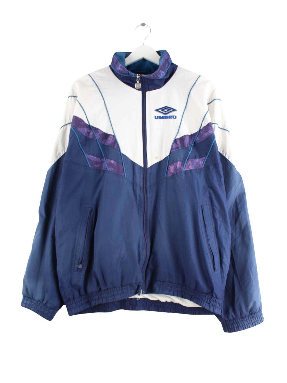 Blaue Trainingsjacke von Umbro aus den 90'ern in Größe M. Sie ist aus Synthetik hergestellt und in gutem Zustand bei uns vorrätig.