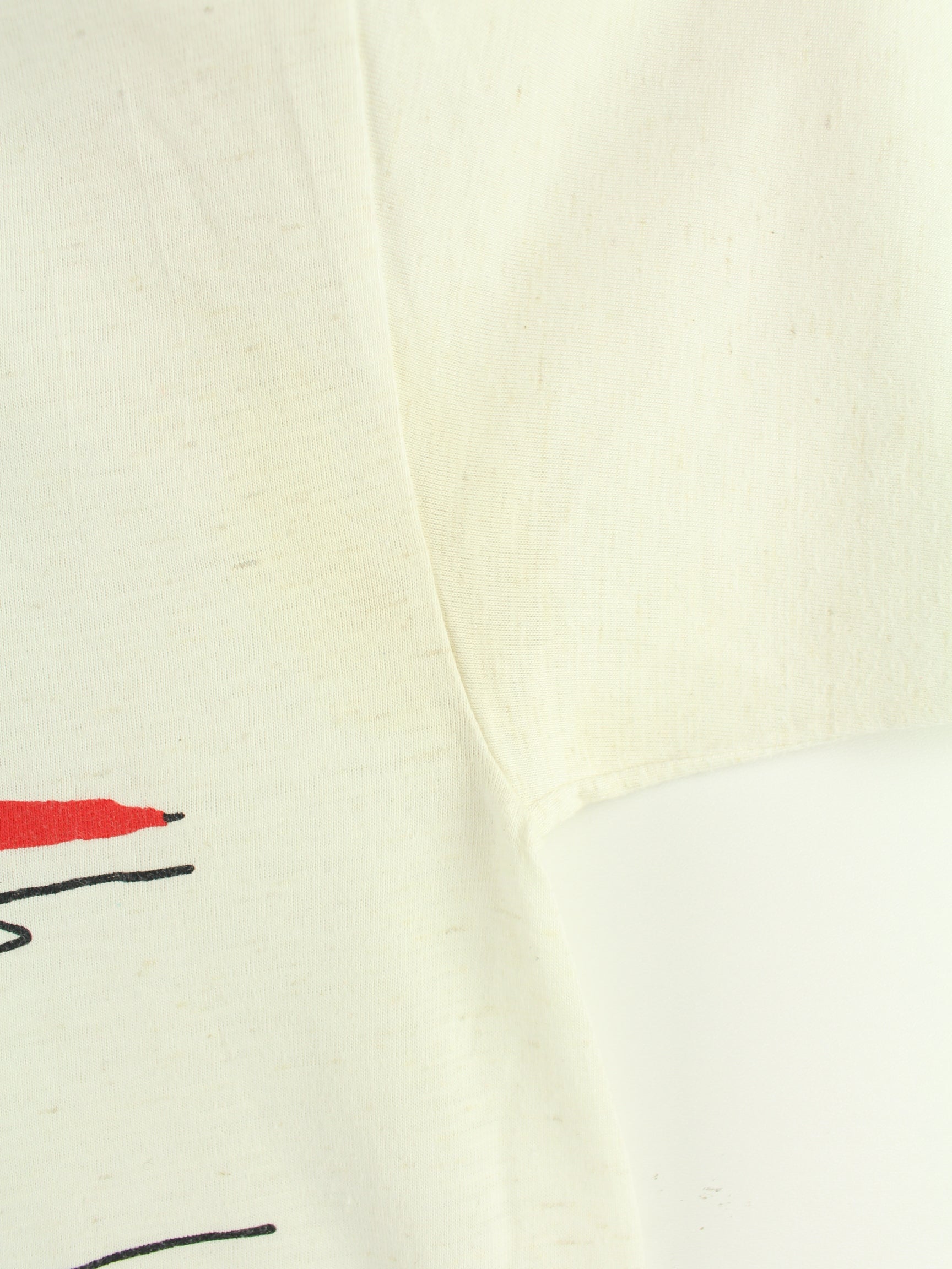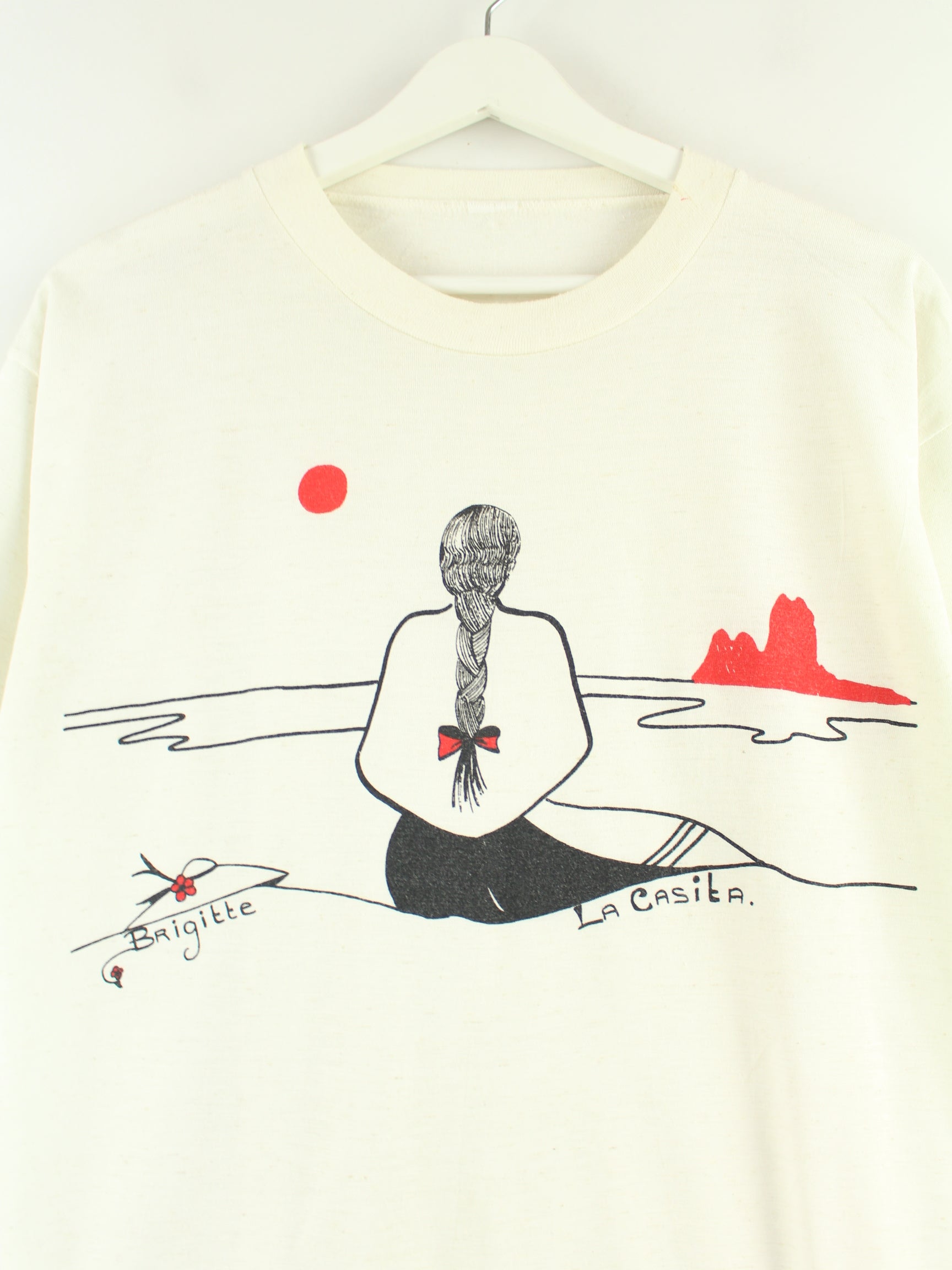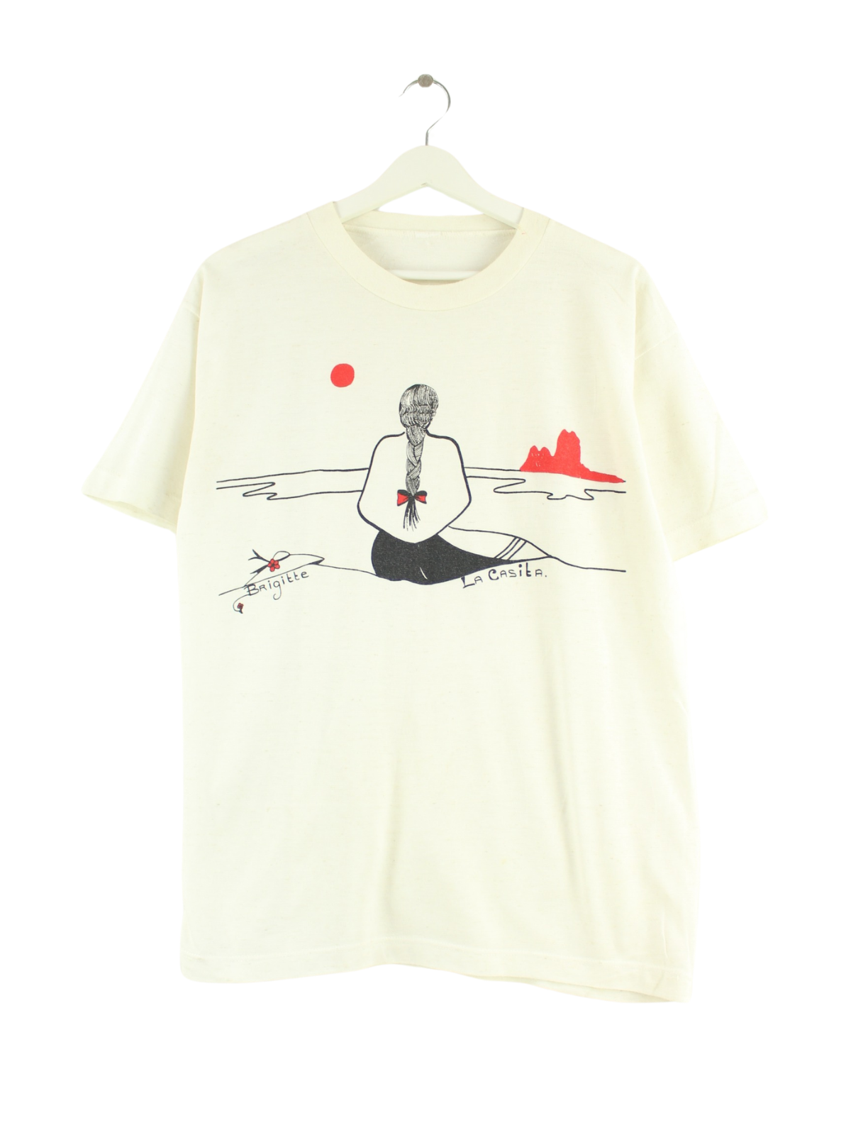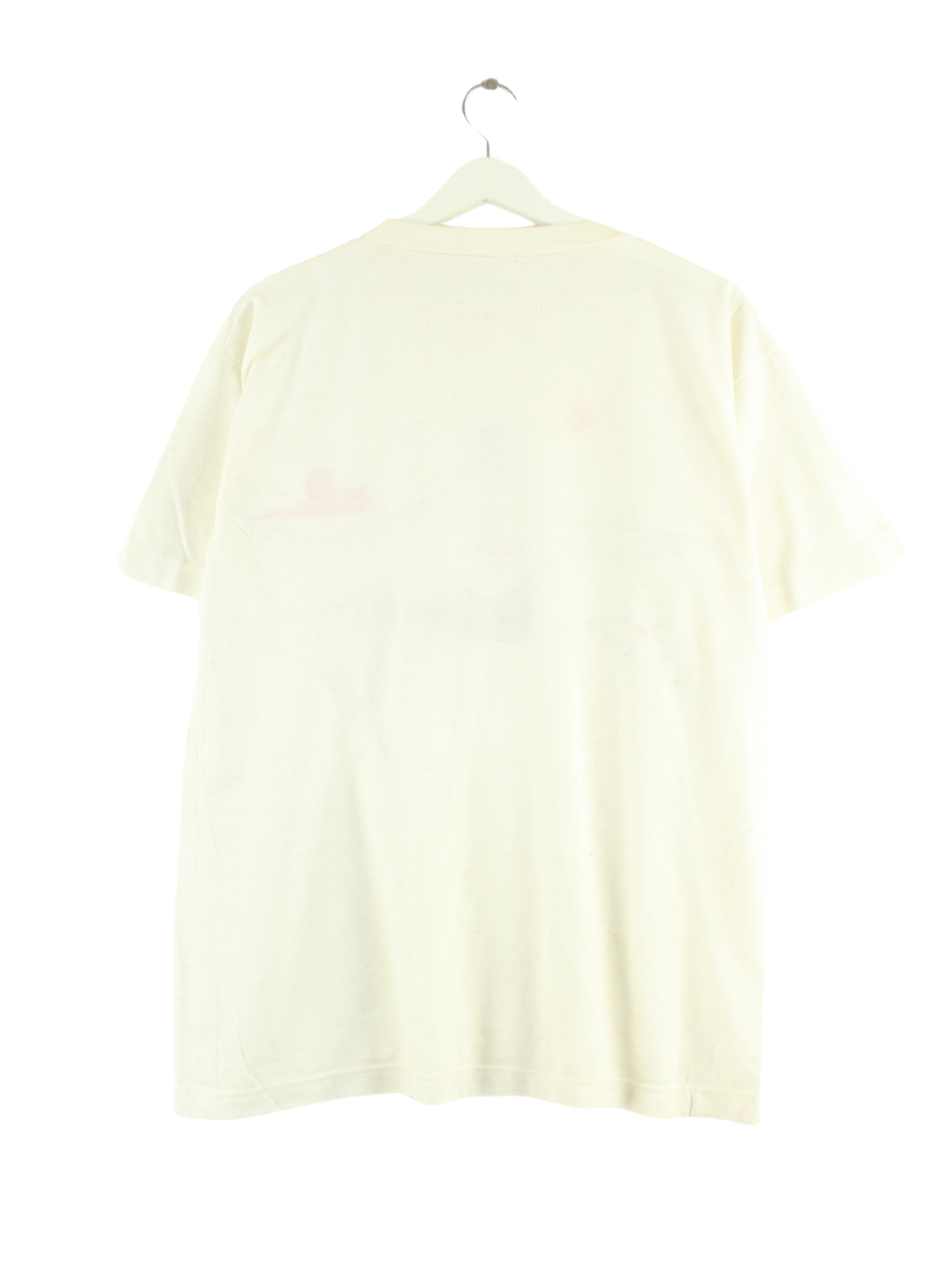 Beigefarbenes Vintage T-Shirt aus den 80'ern in Größe M. Es ist aus einer Baumwollmischung gefertigt und in gutem Zustand zu haben. Mit tollem Vintage Print.