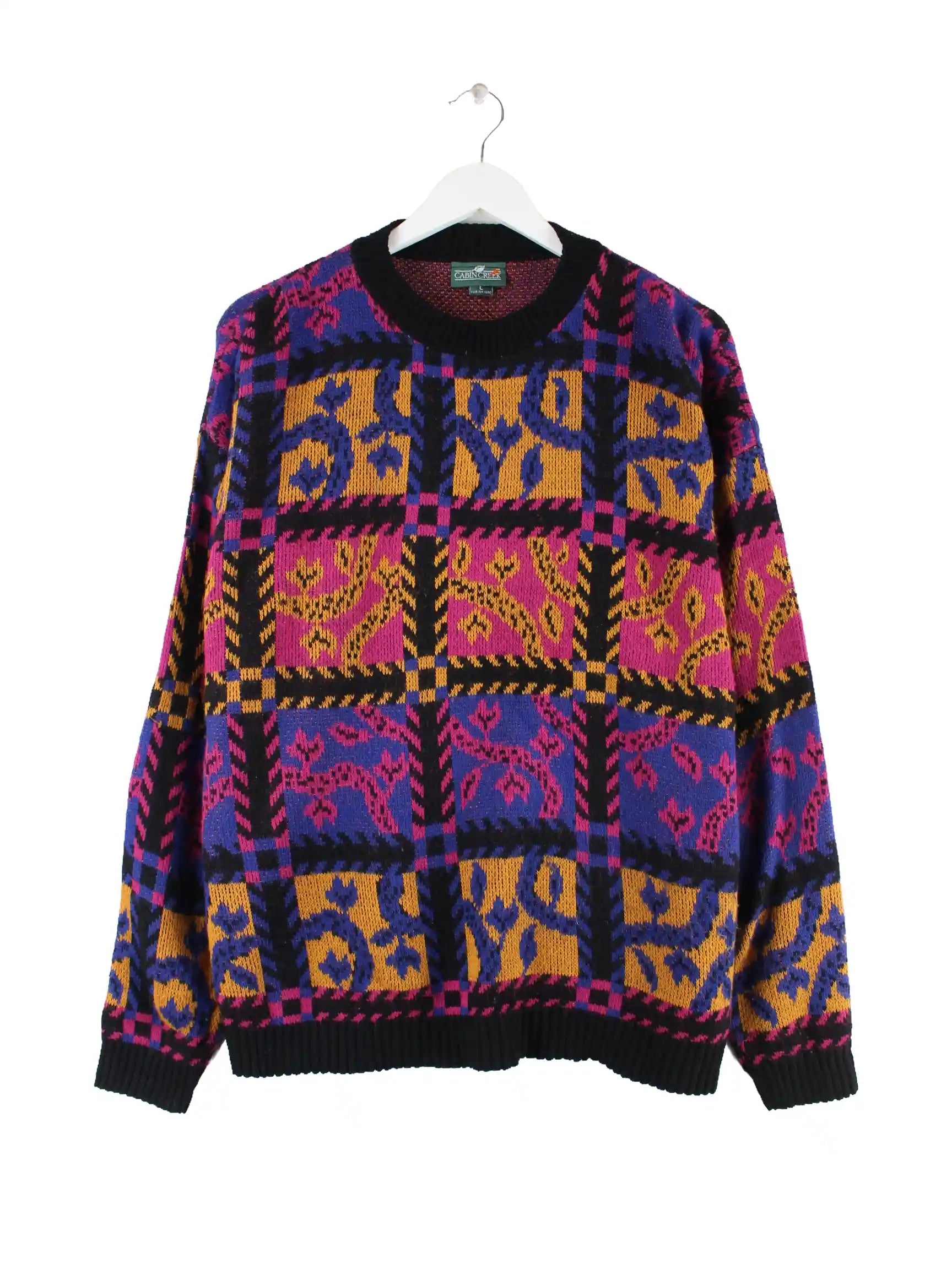 Vintage Pullover in Größe L aus den 90'ern. Er ist aus Acryl hergestellt und in bunten Farben vorrätig.