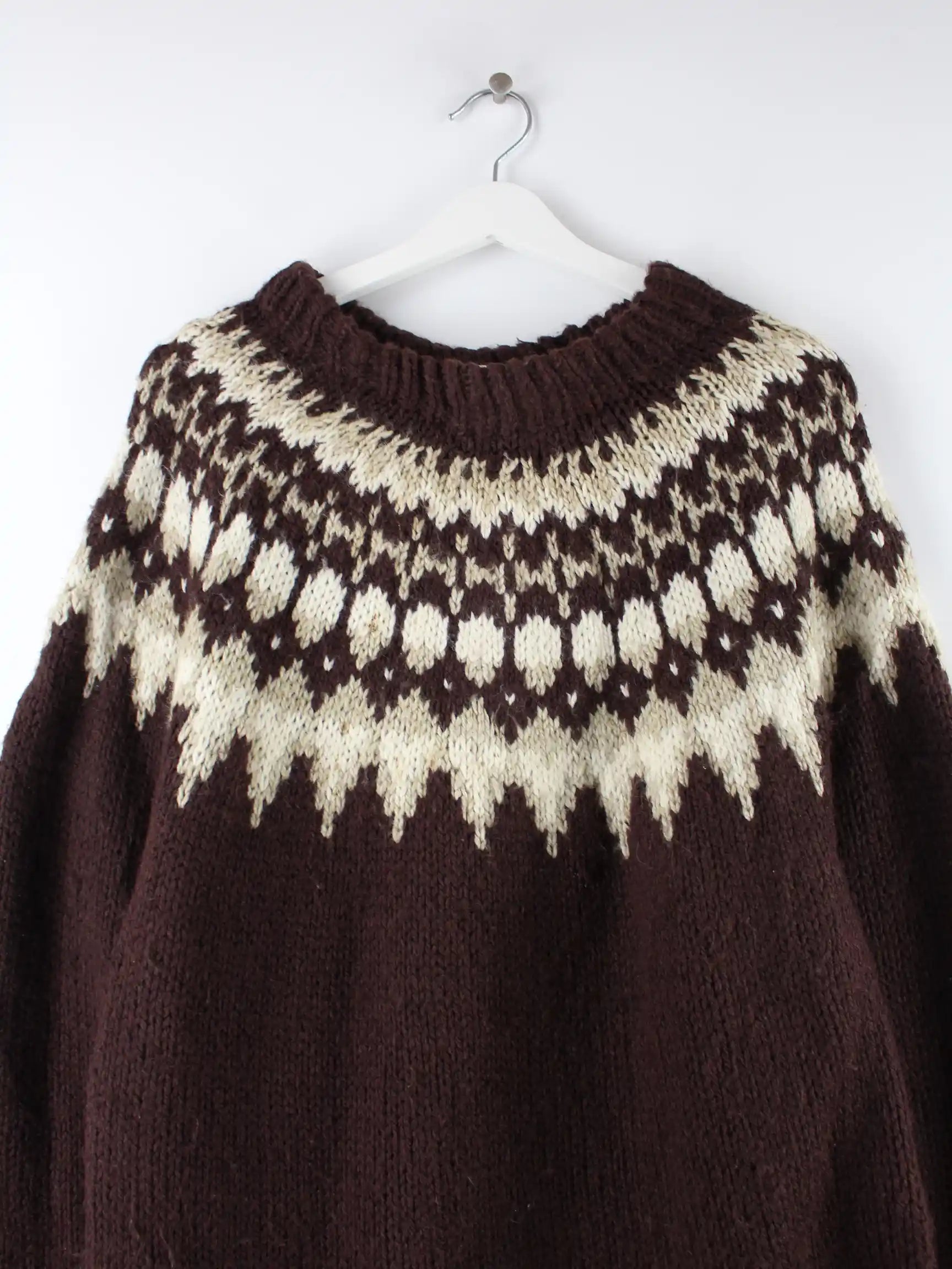 Vintage Pullover in Größe 3XL aus den 90'ern. Er ist aus Wolle angefertigt und in Braun vorrätig.