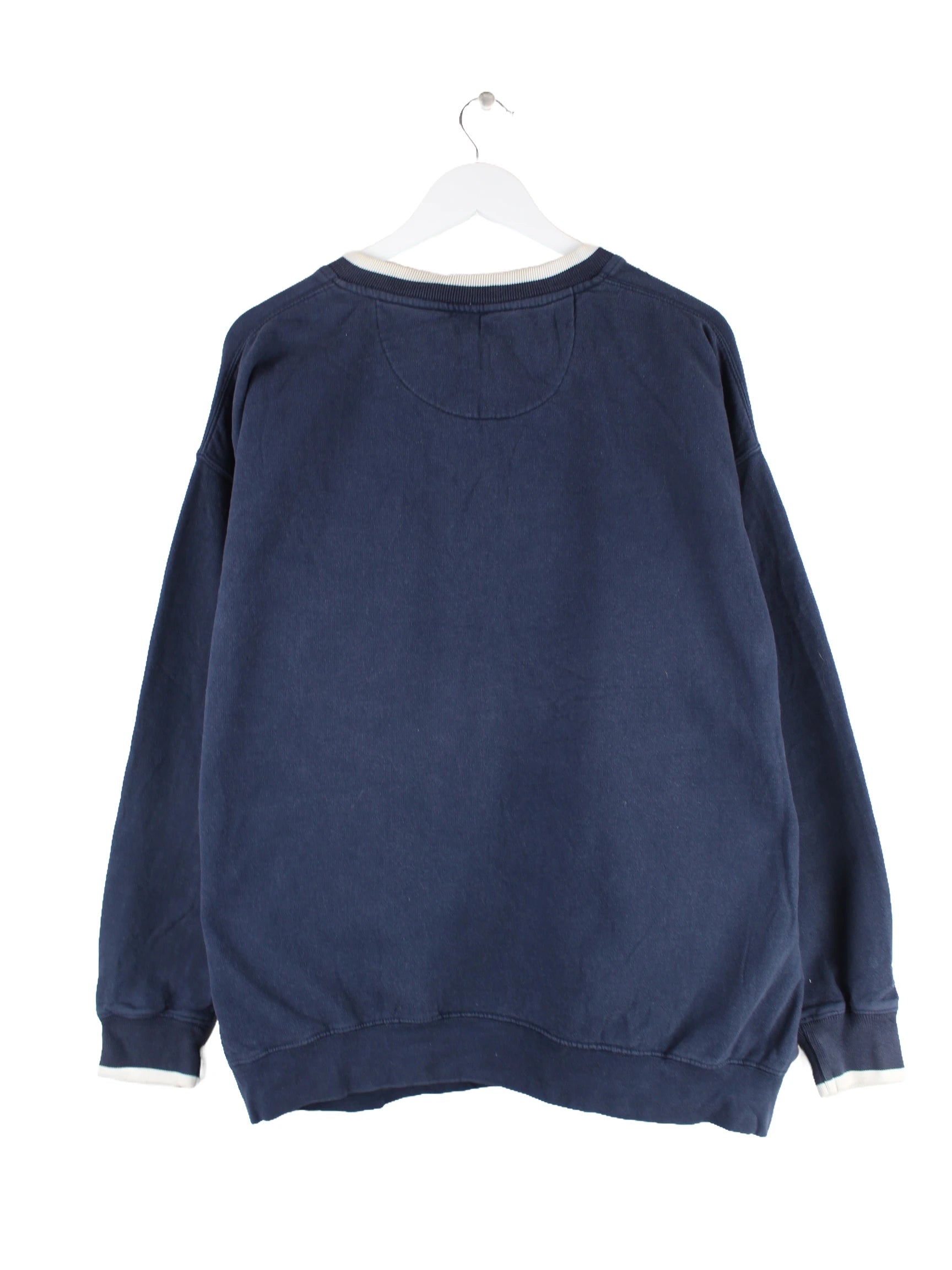 Vintage Sweater in Größe XL. Er ist aus einer Baumwollmischung gefertigt und in Blau in Stock.