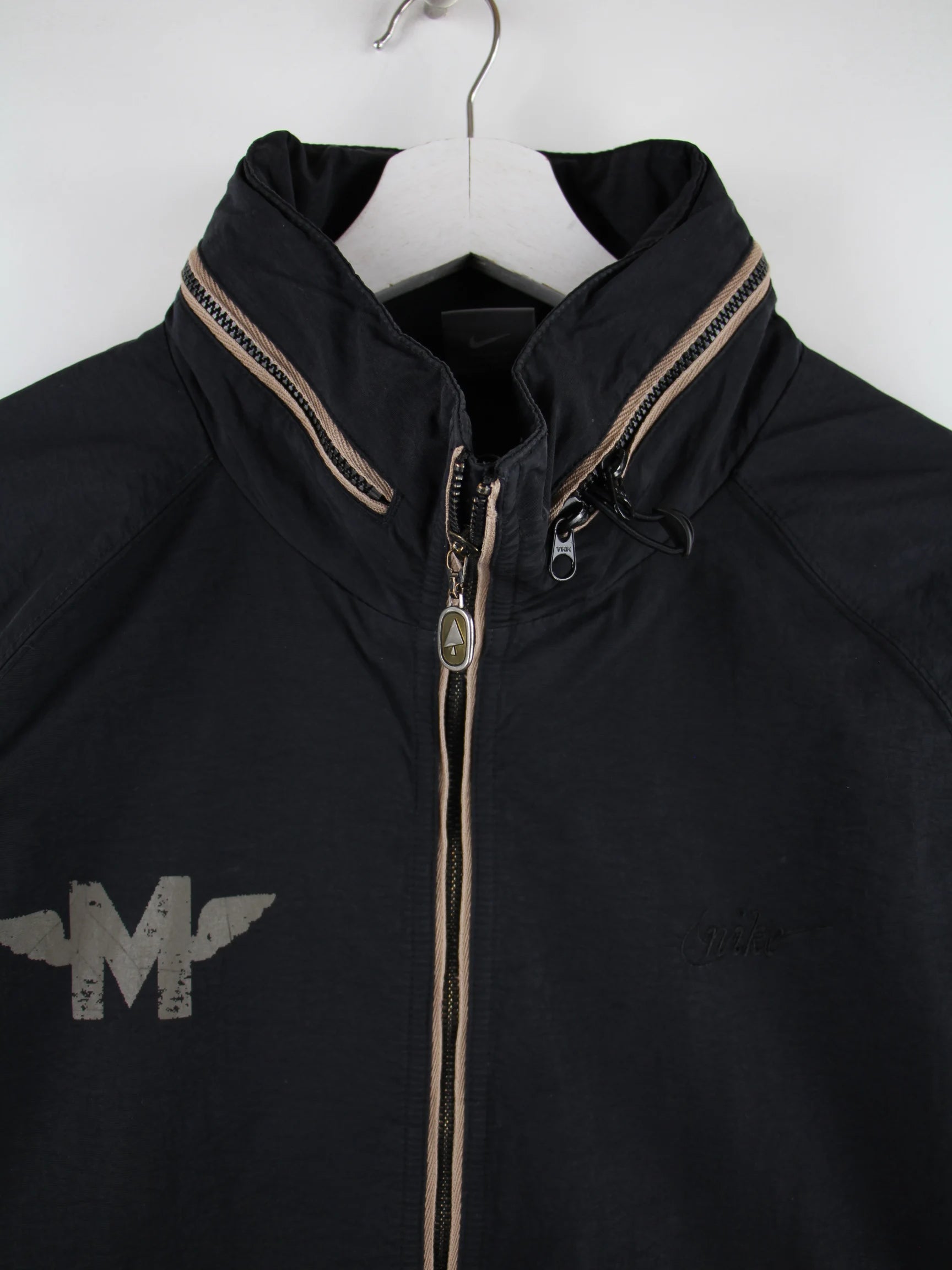 Leichte Jacke der Brand Nike in Größe XL. Sie ist aus Synthetik produziert und in Schwarz in Stock. Mit schickem 00s Print.