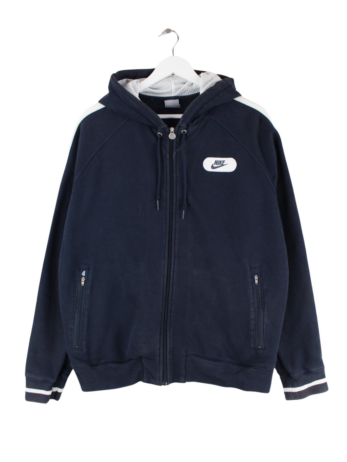 Schwarzer Hoodie mit gestickten Motiven und Reißverschluß aus dem Hause Nike in Größe M. Er ist aus einer Baumwollmischung angefertigt und in gutem Zustand auf Lager.