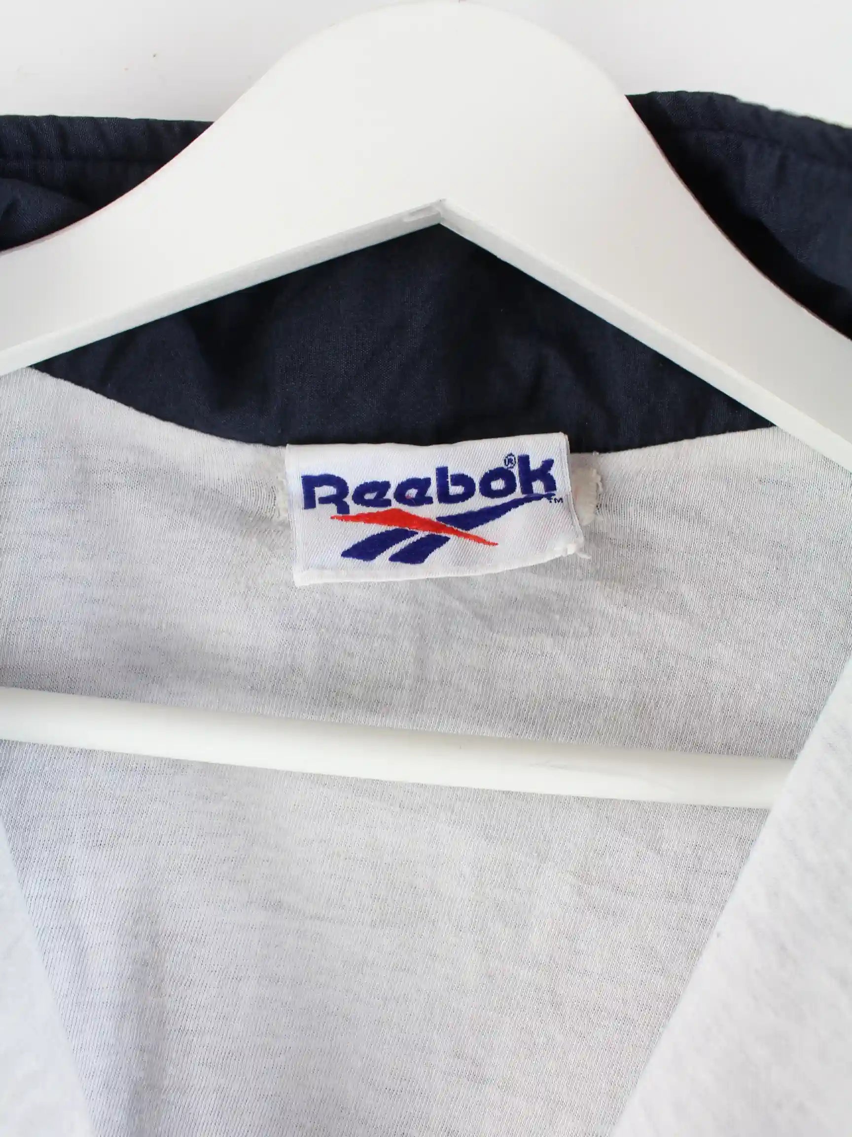 Blaue Trainingsjacke vom Brand Reebok aus den 90'ern in Größe S. Sie ist aus Synthetik hergestellt und in sehr gutem Zustand in Stock.