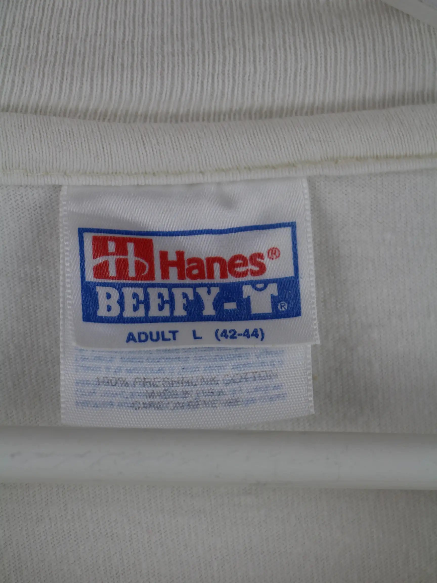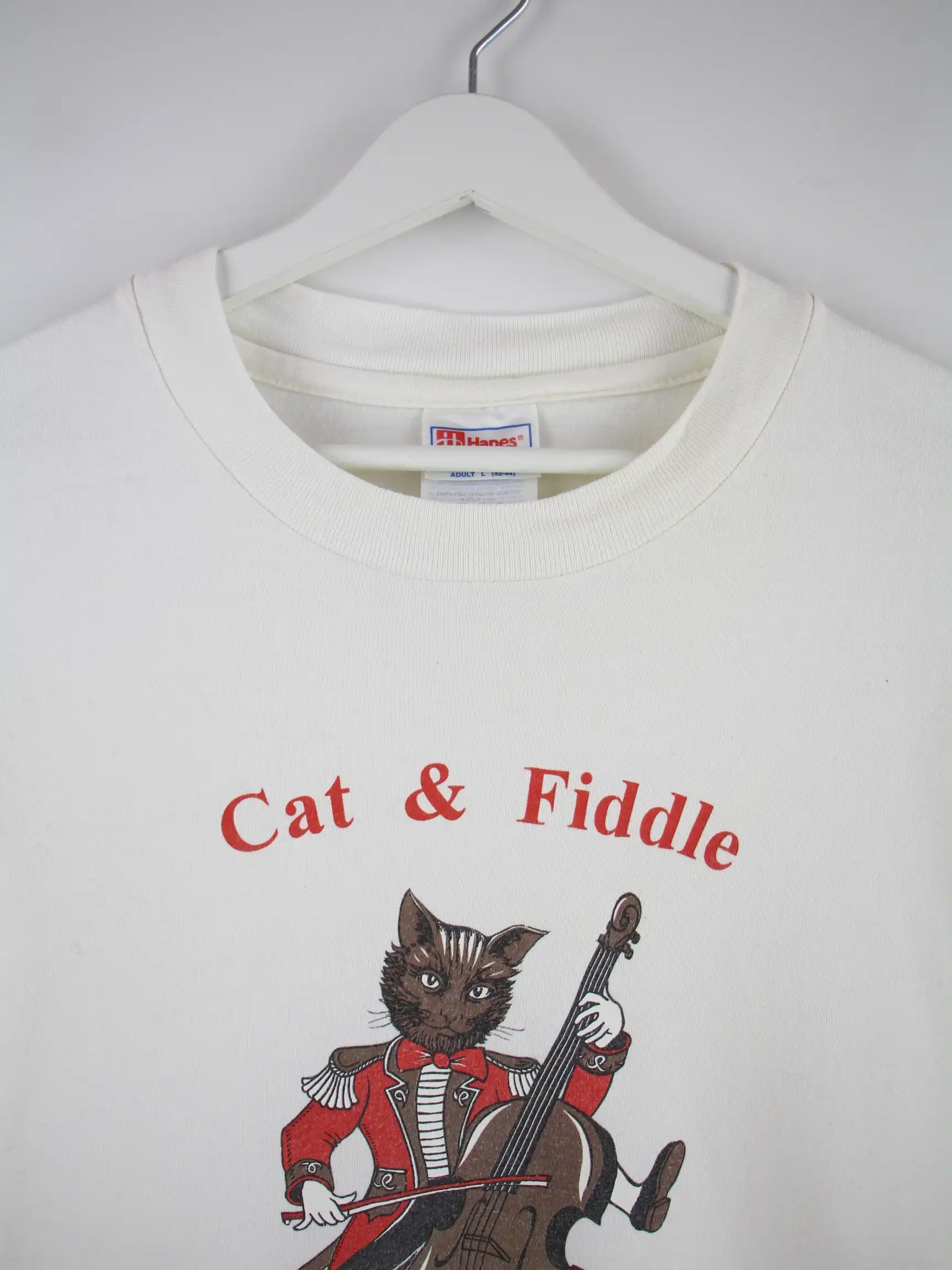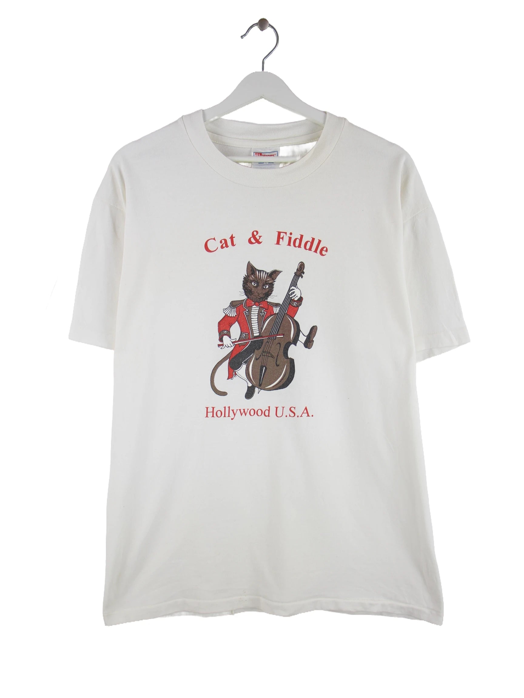 Weißes T-Shirt vom Brand Hanes aus den 90'ern in Größe L. Es ist aus Baumwolle gefertigt und in sehr gutem Zustand im Angebot. Mit schönem Cat Print.