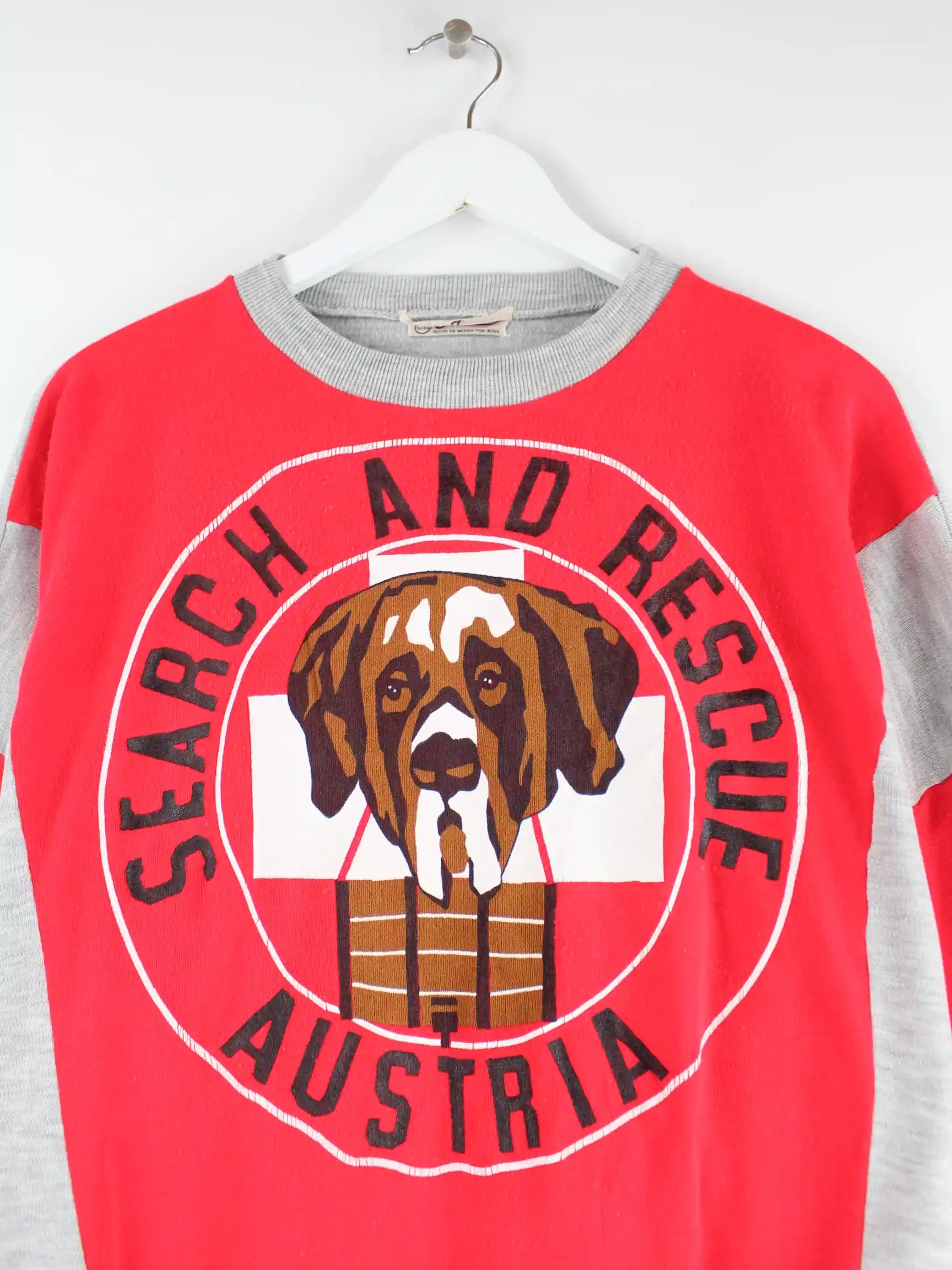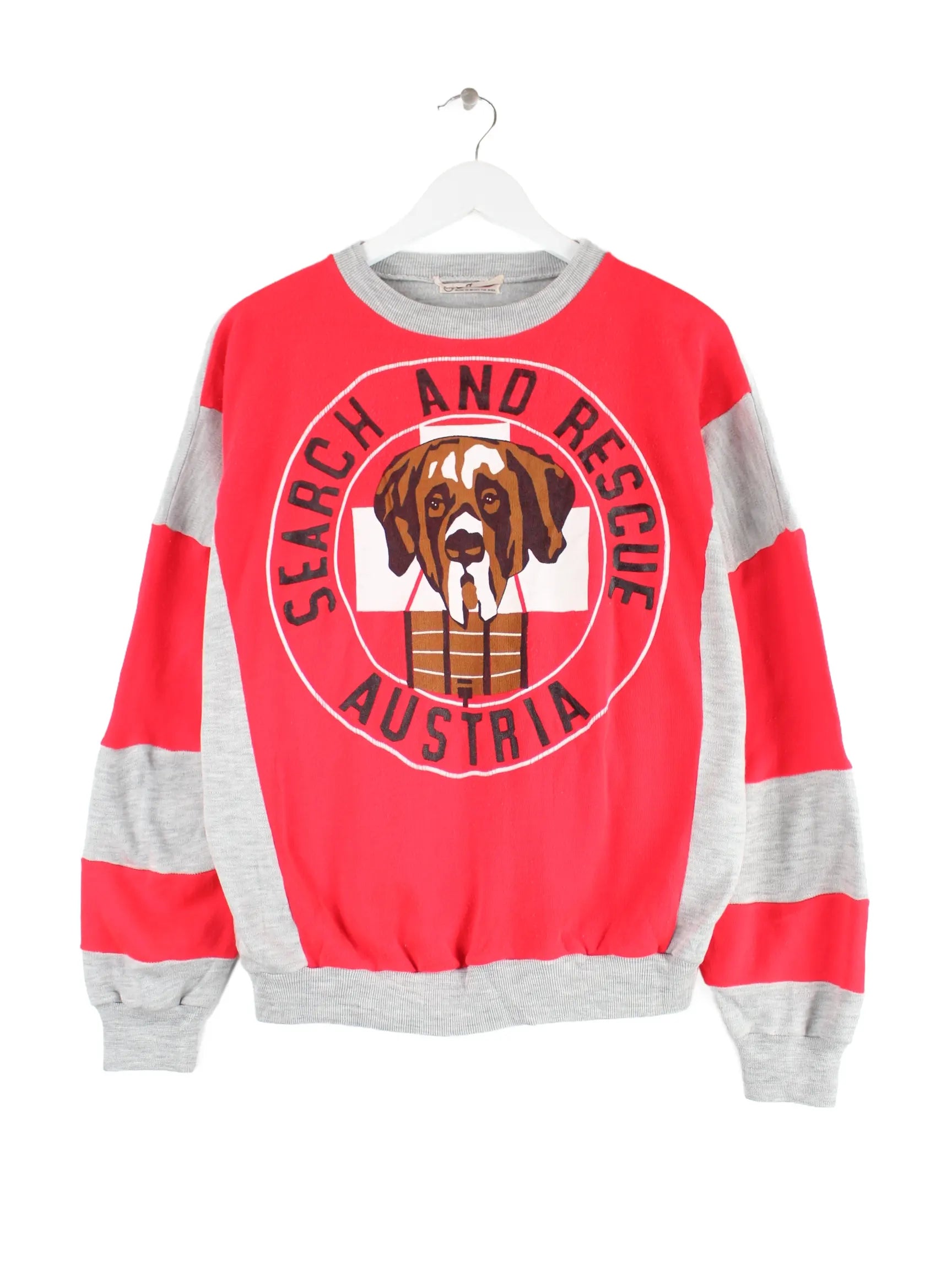 Roter Vintage Sweater aus den 90'ern in Größe S. Er ist aus einer Baumwollmischung gefertigt und in sehr gutem Zustand vorrätig. Mit seltenem Rescue Print.