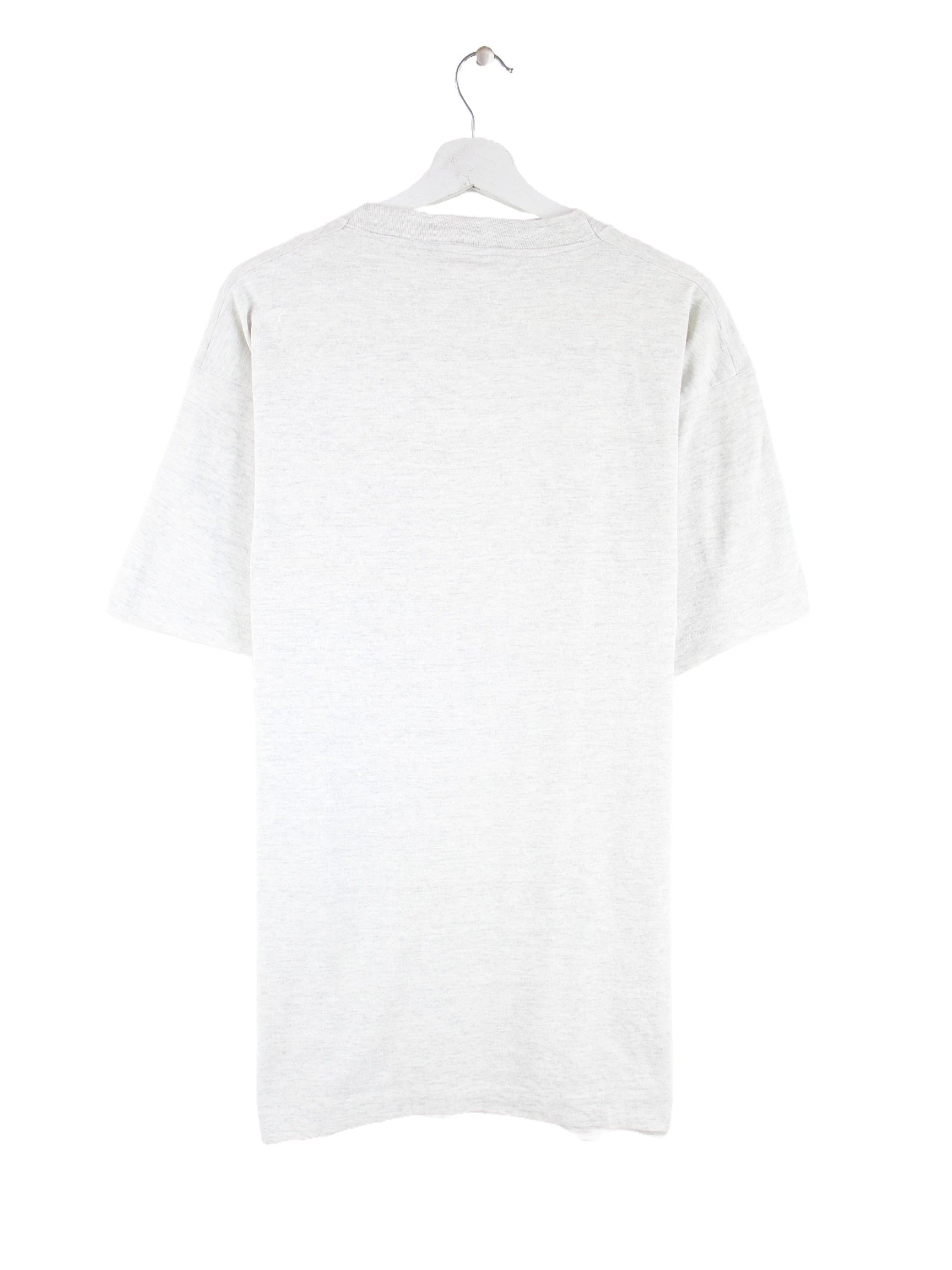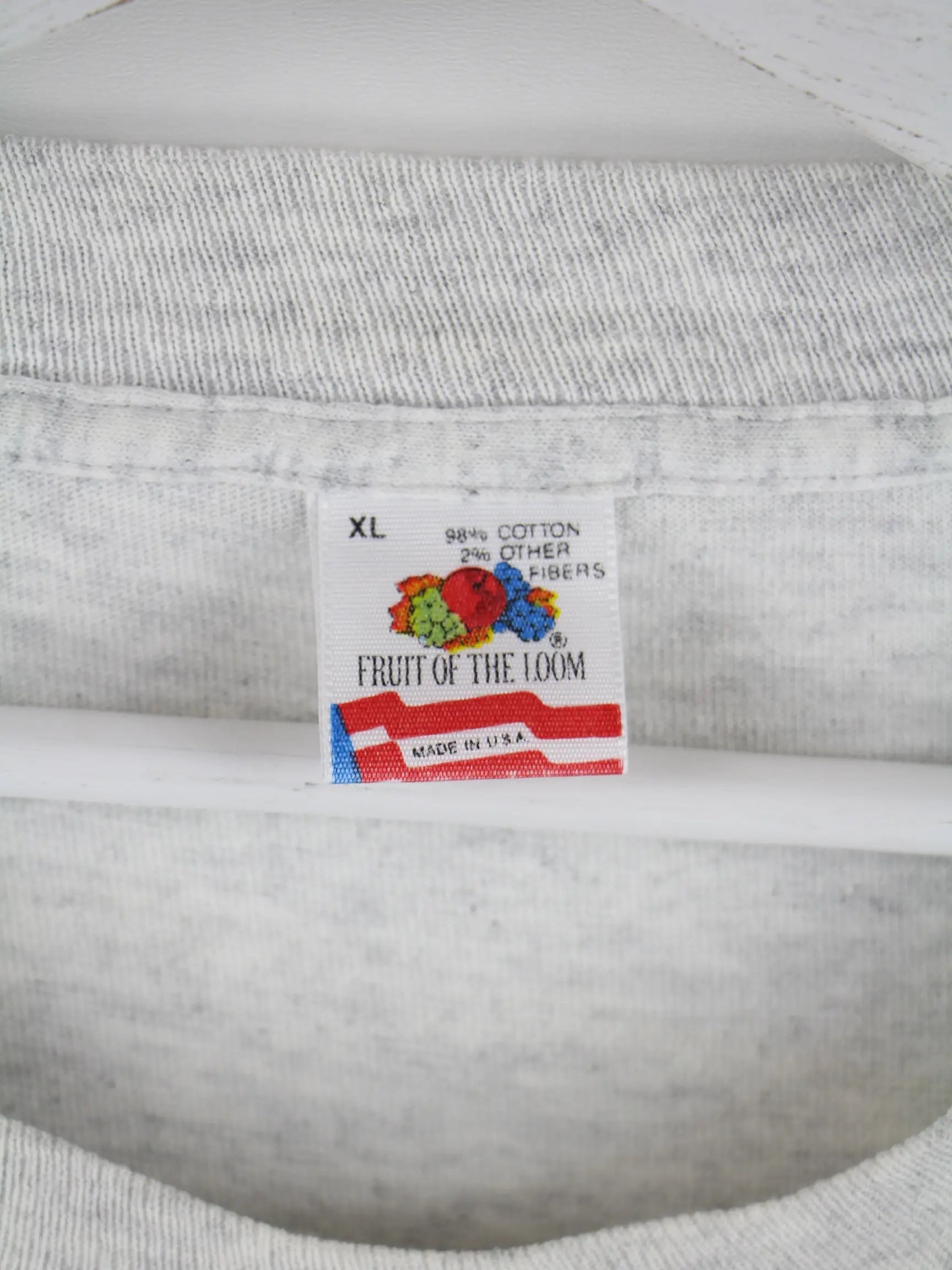 Graues T-Shirt vom Brand Fruit of the Loom aus den 90'ern in Größe XL. Es ist aus Baumwolle angefertigt und in gutem Zustand bei uns zu bekommen. Mit chiquem Thomas Print.