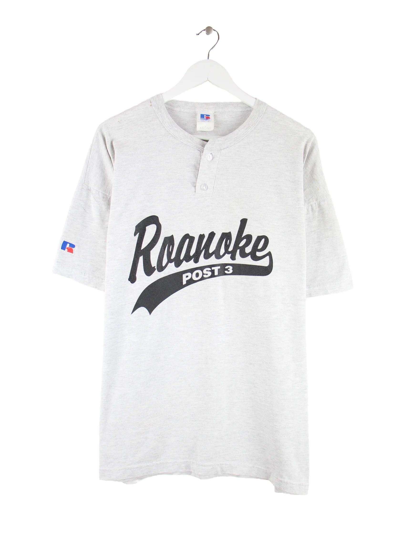 T-Shirt vom Label Russell Athletic in Größe XL. Es ist aus Baumwolle angefertigt und in Grau vorrätig. Mit schickem Roanoke Print.
