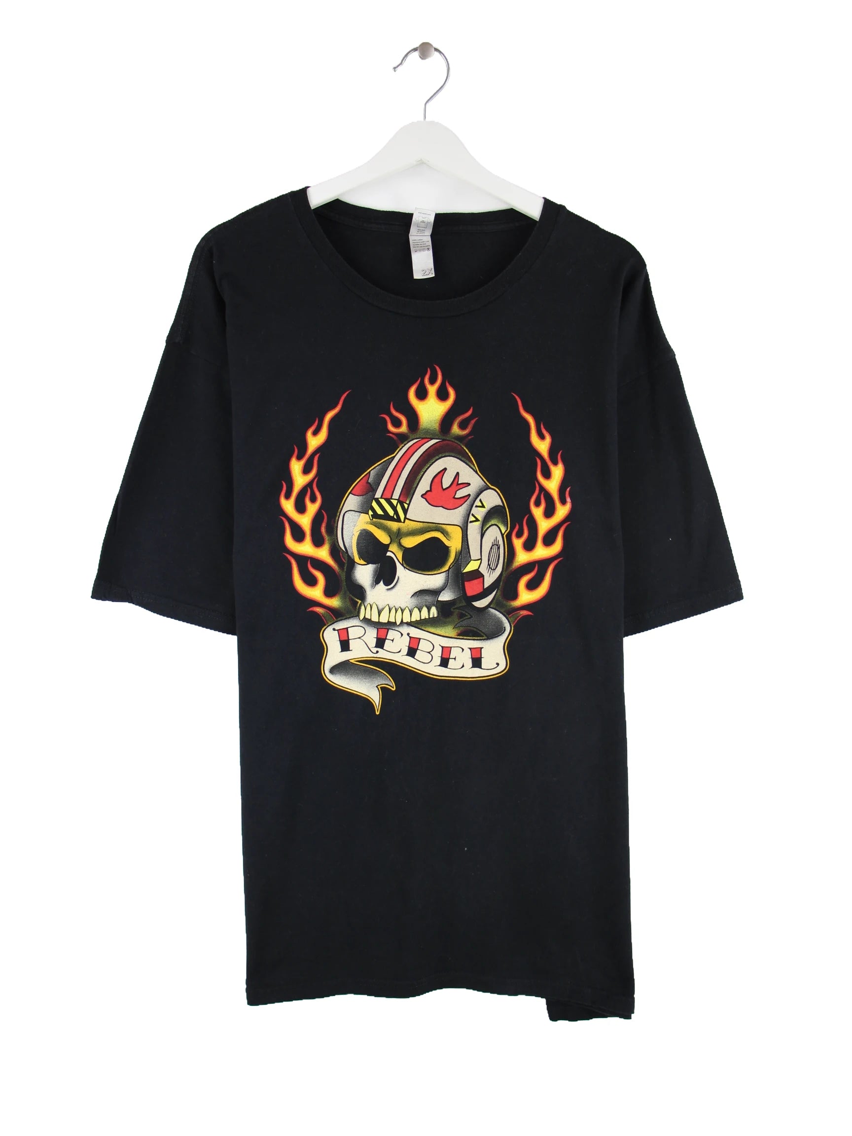 Vintage T-Shirt in Größe XXL. Es ist aus Baumwolle gefertigt und in Schwarz lieferbar. Mit seltenem Rebel Print.