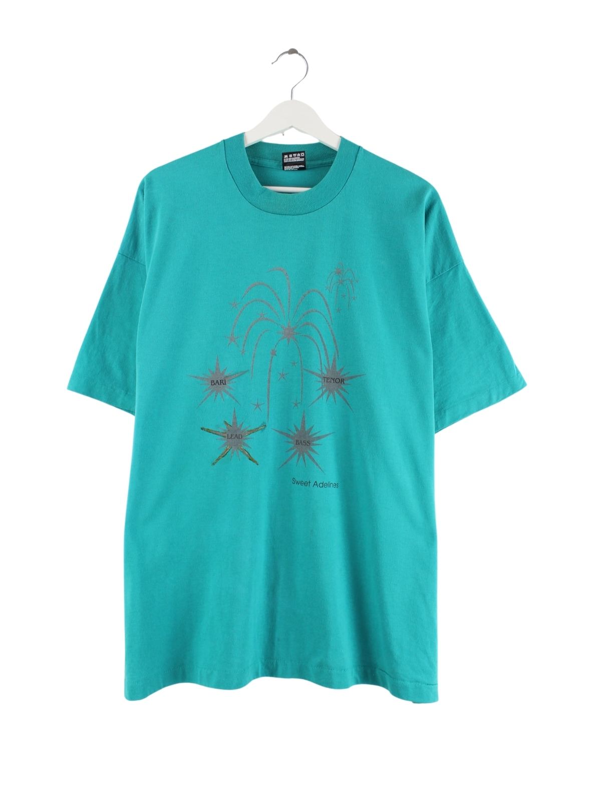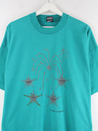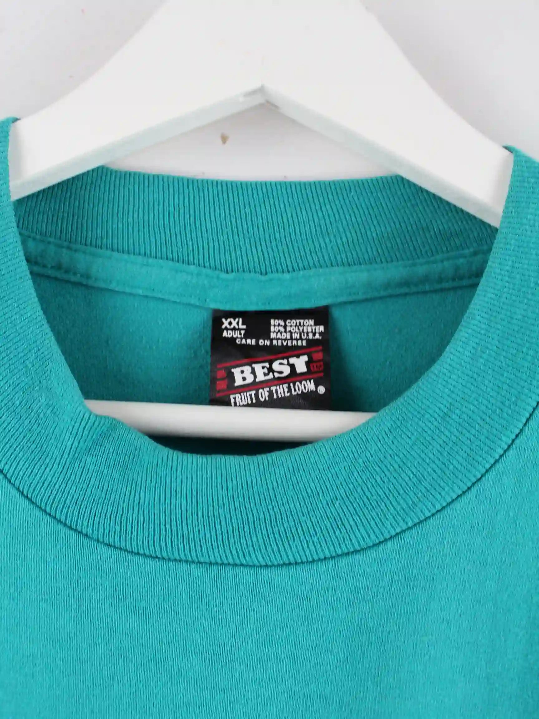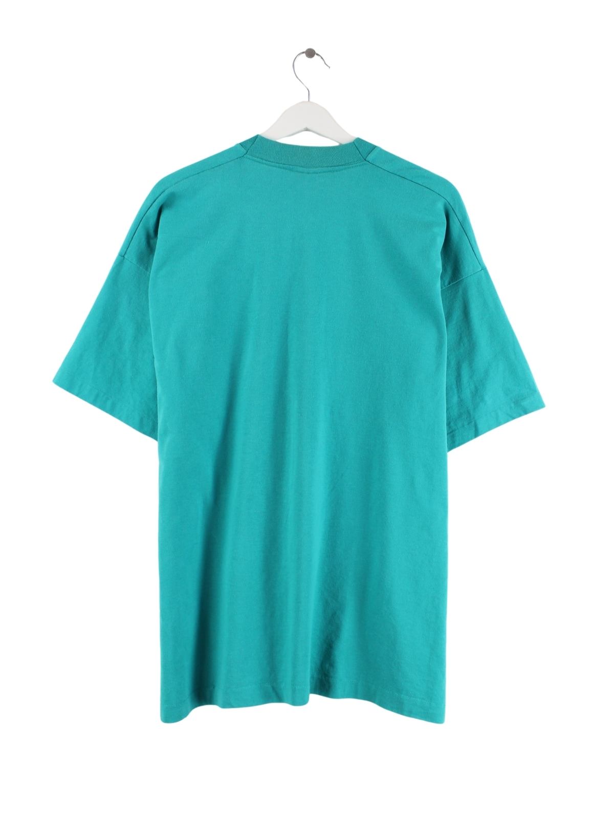 Grünes T-Shirt der Brand Fruit of the Loom aus den 80'ern in Größe XXL. Es ist aus Baumwolle produziert und in gutem Zustand im Bestand. Mit tollem Vintage Print.
