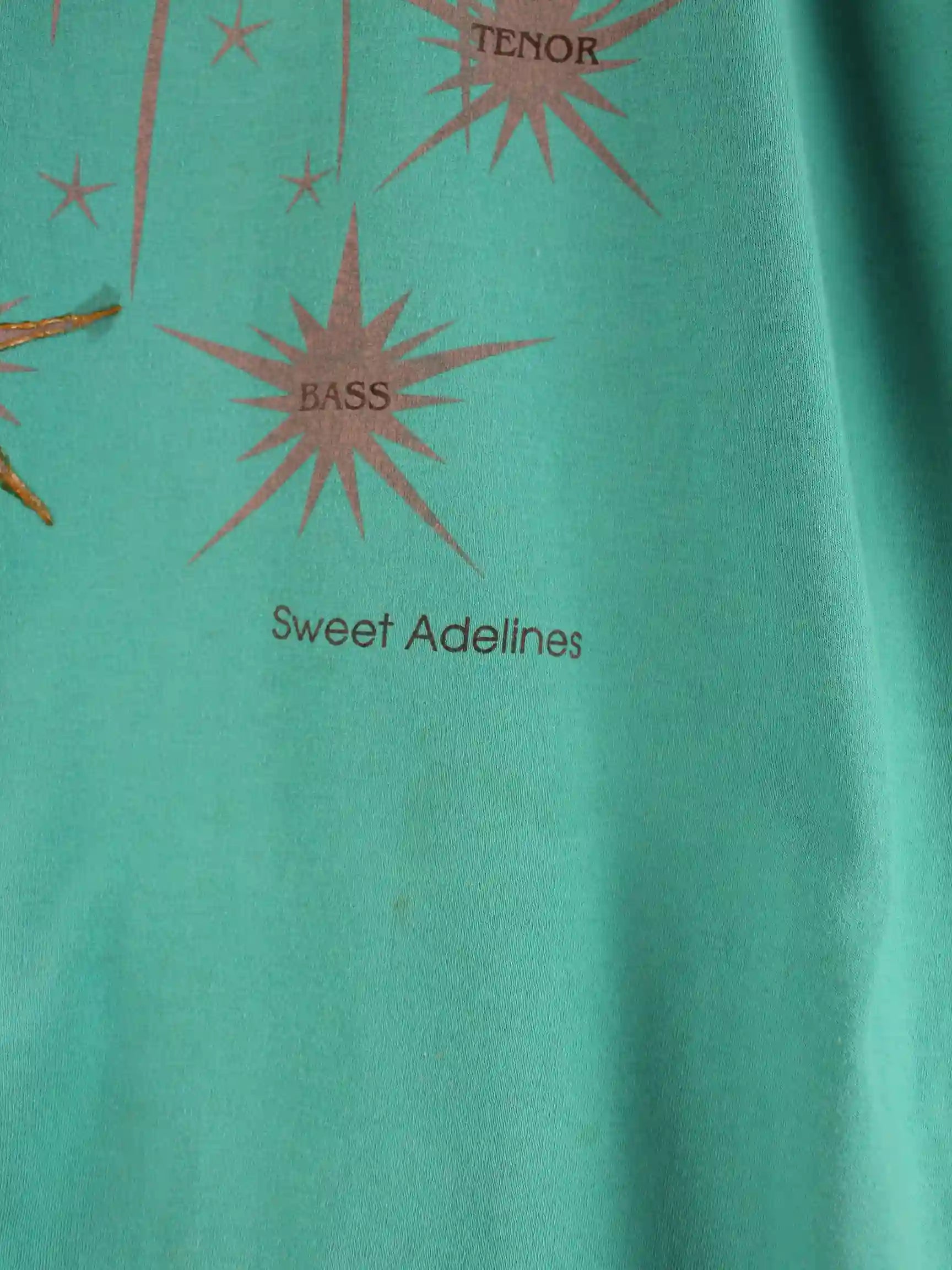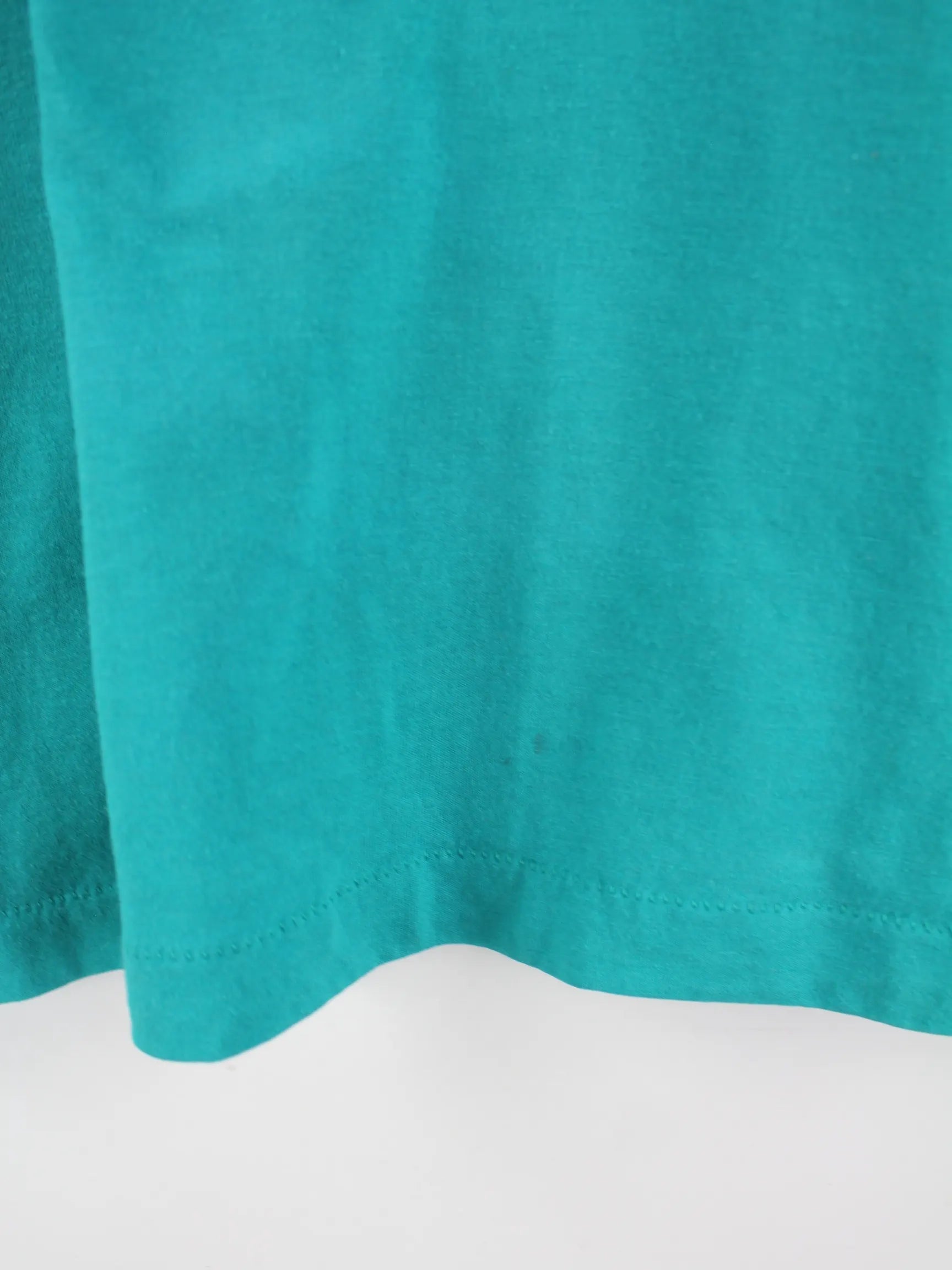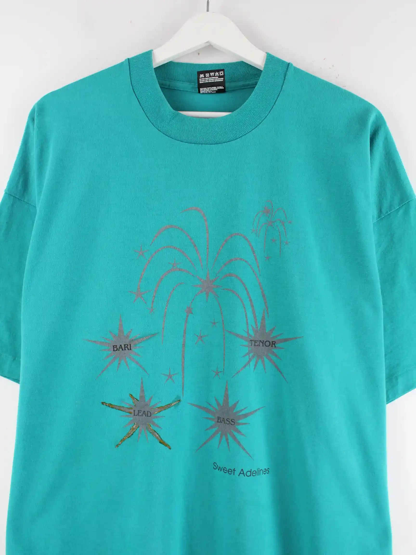 Grünes T-Shirt der Brand Fruit of the Loom aus den 80'ern in Größe XXL. Es ist aus Baumwolle produziert und in gutem Zustand im Bestand. Mit tollem Vintage Print.